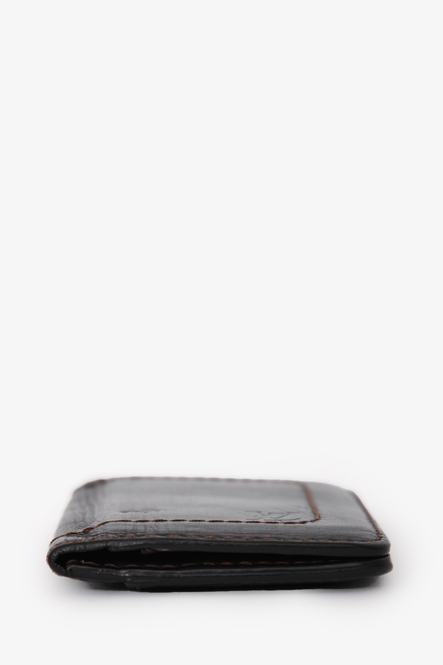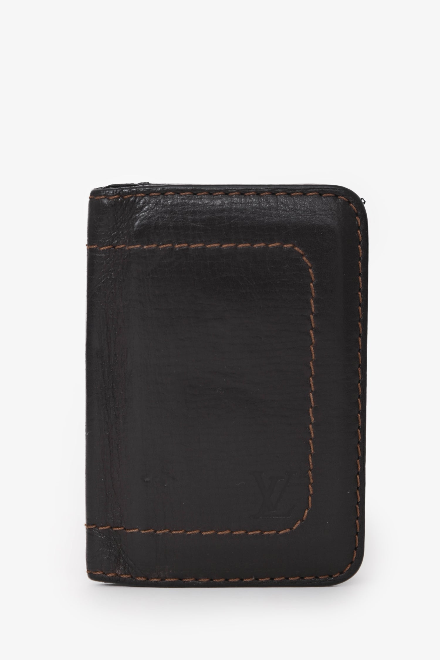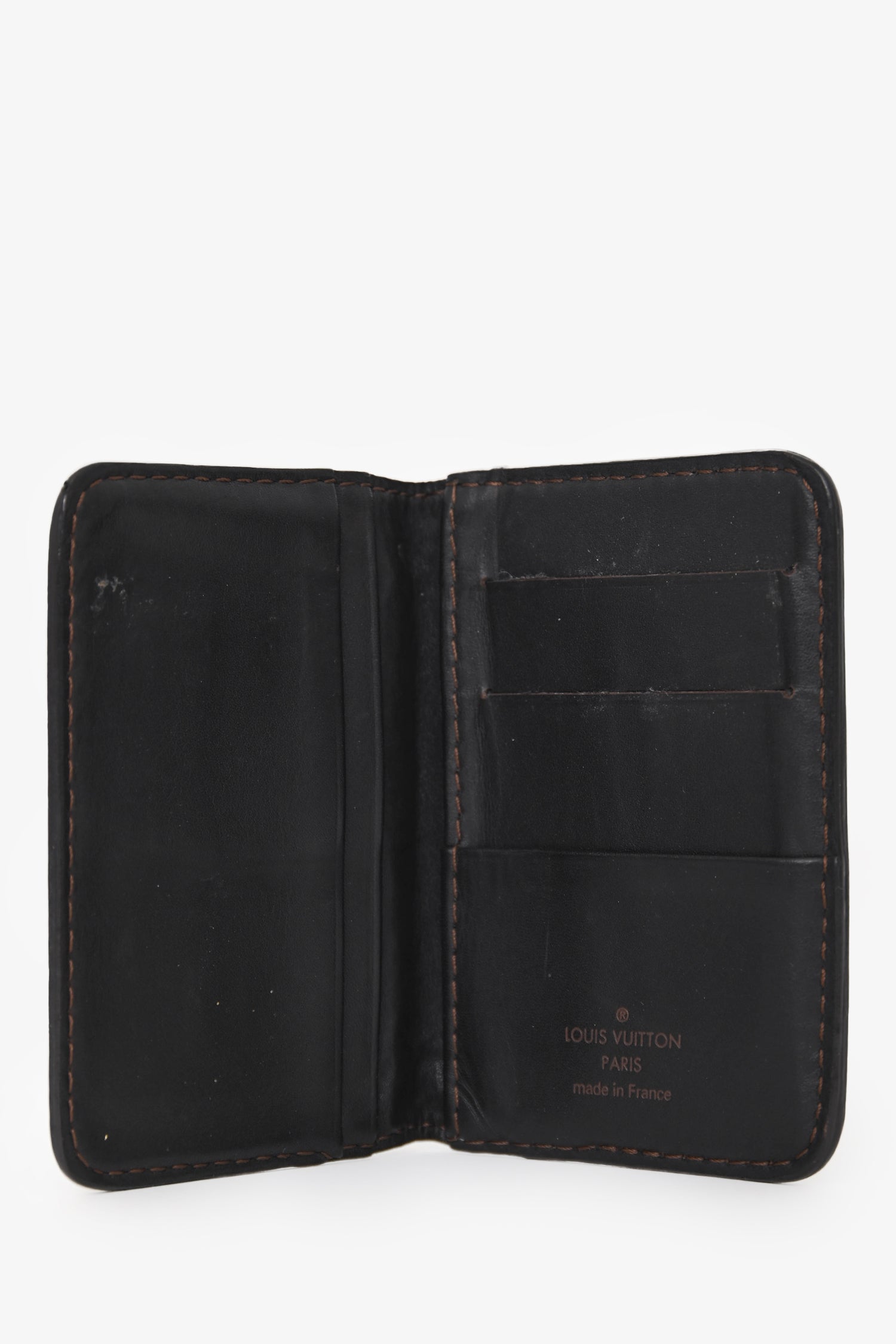 Refresh availabilityLouis Vuitton Brown Leather Bi-Fold Cardholder. Fold-open construction. 3 interior card slots; 4 slip pockets. Contrast stitching.