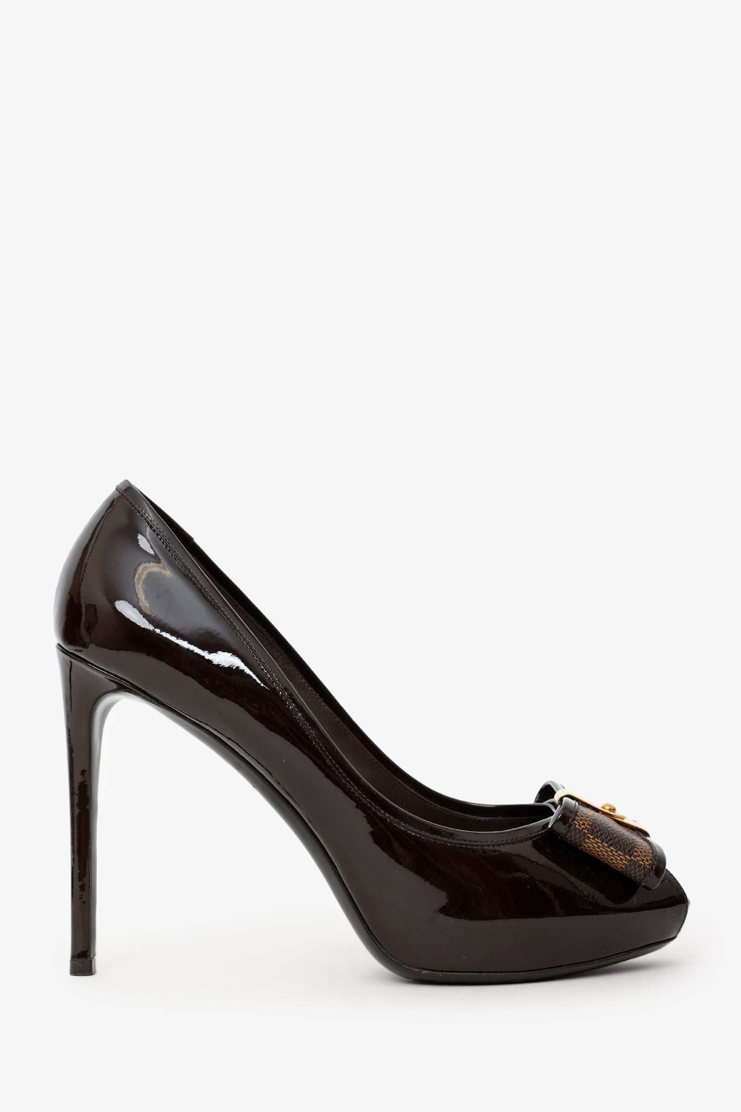 Refresh availabilityLouis Vuitton Brown Leather Open Toe Heels. Open round toe. Leather-lined interior. Gold-tone hardware. Tonal stitching.