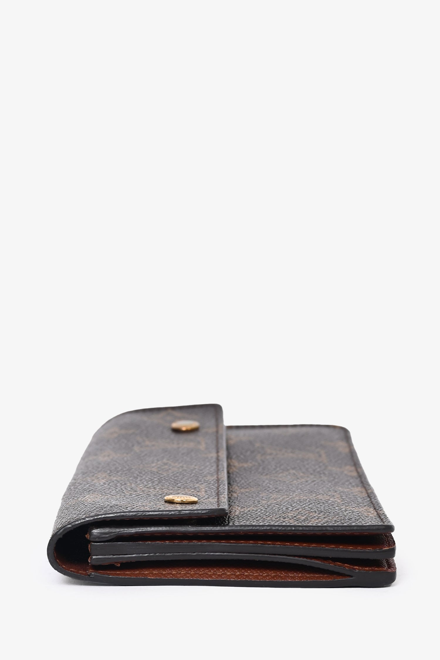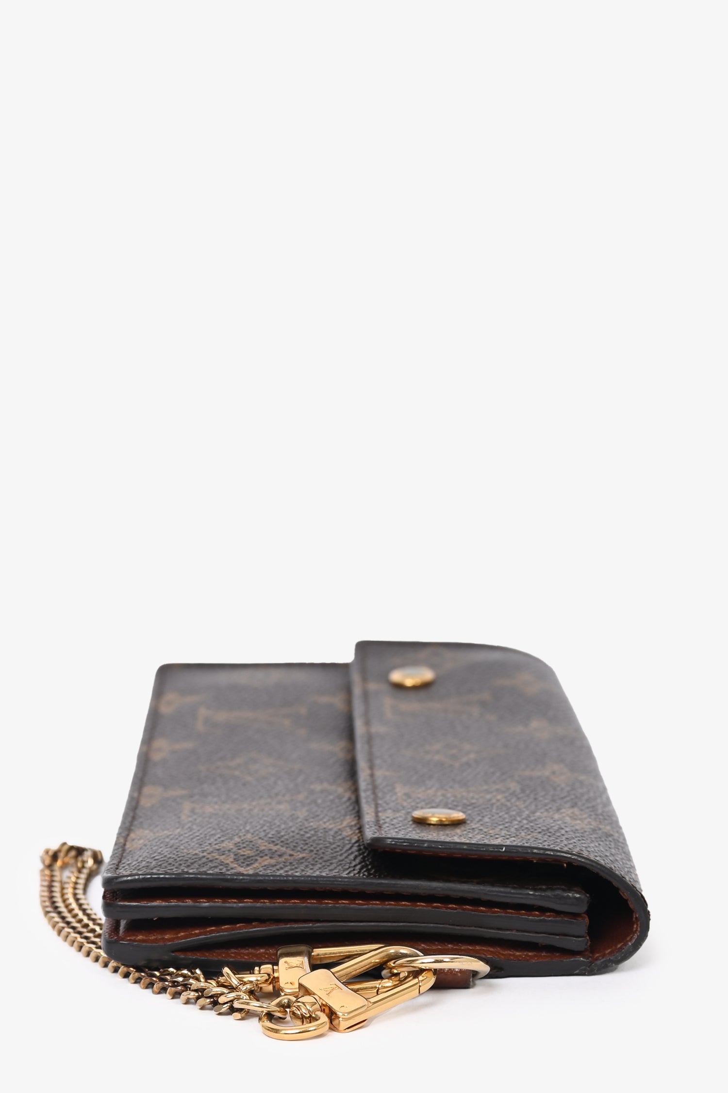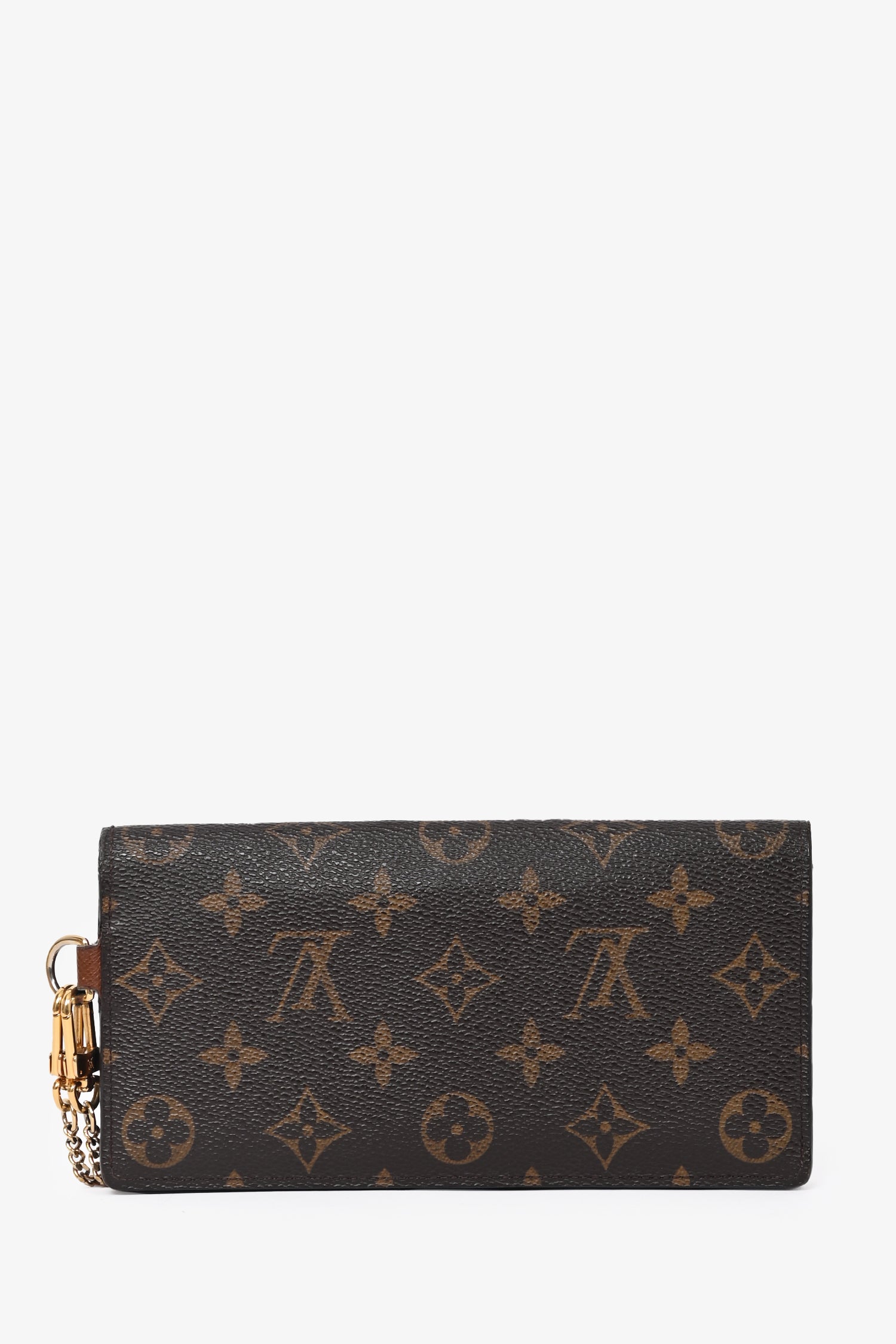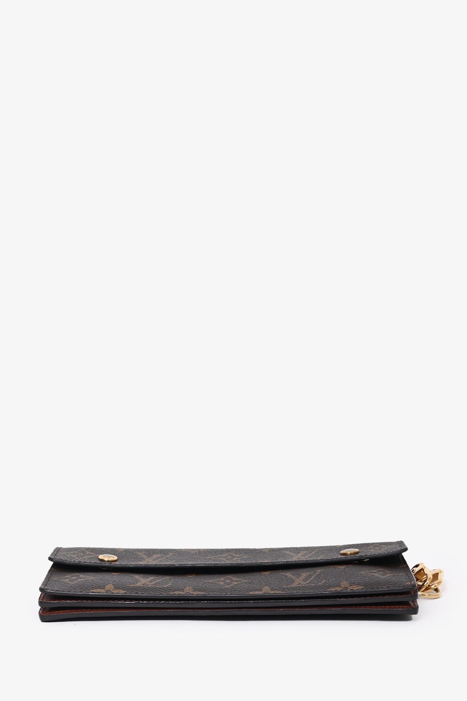 Louis Vuitton 2005 Brown Monogram Leather Wristlet. Fold over flap with button closure. Gold-tone hardware. 6 interior card slip pockets. 5 interior slip pockets. 1 zip pocket under flap. Removable wrist chain. Tonal stitching.