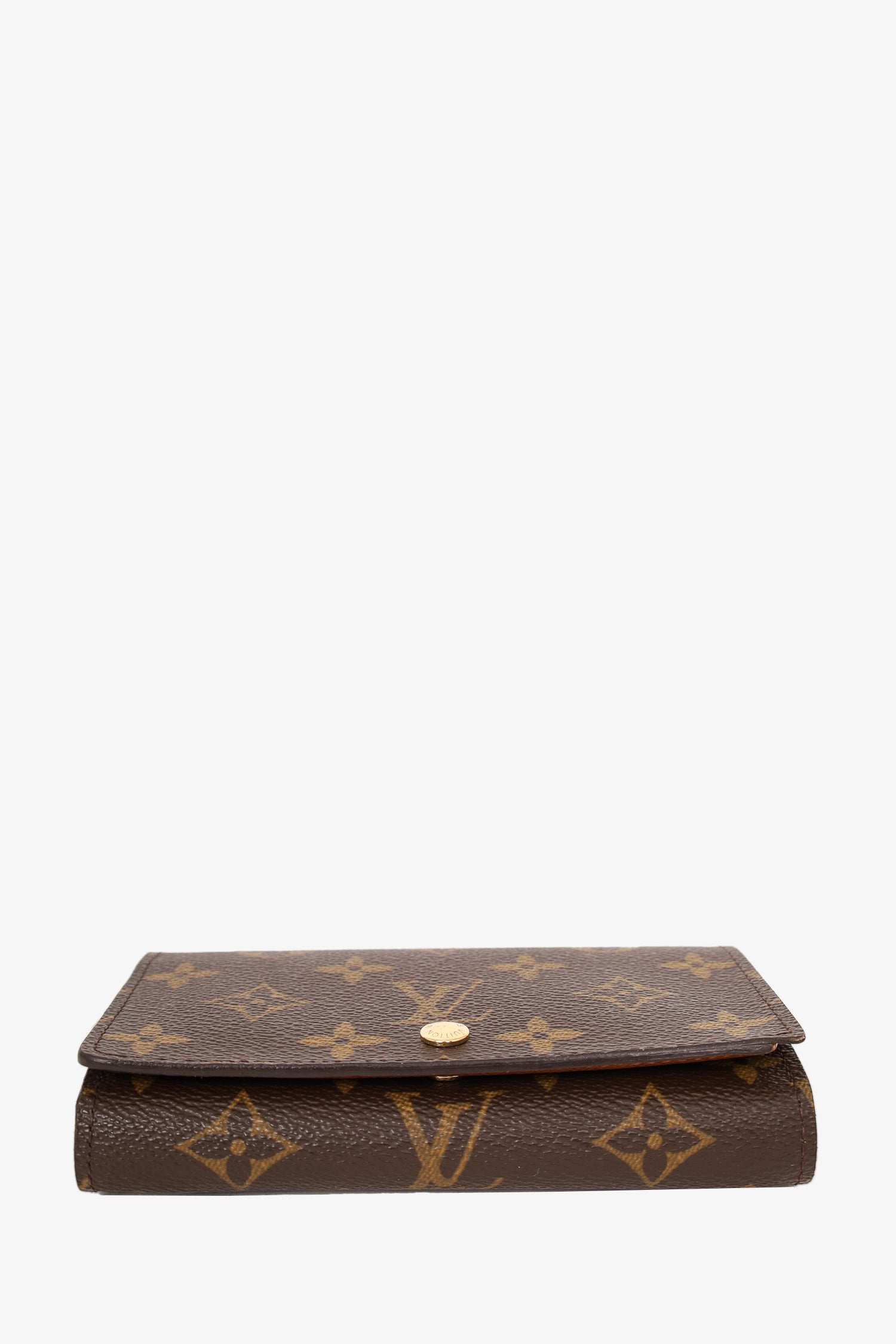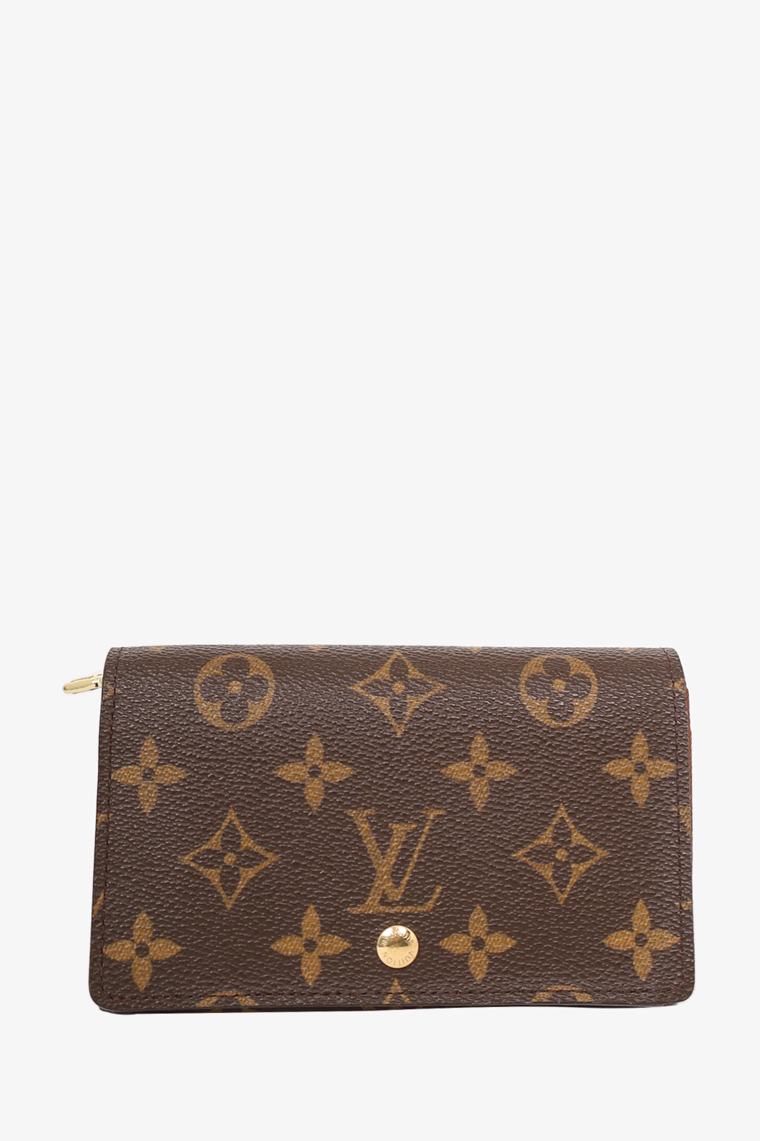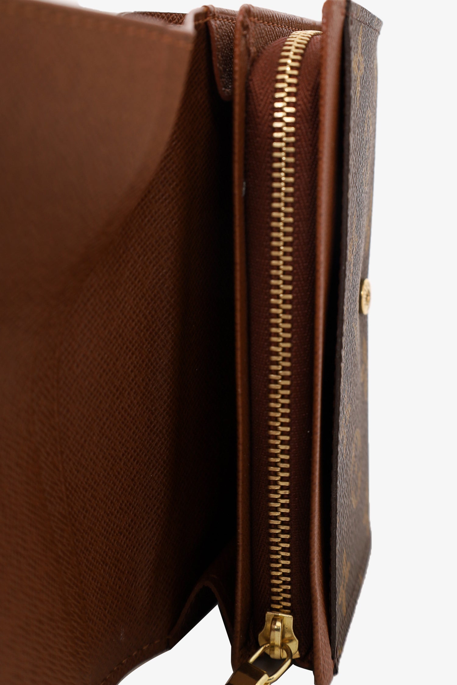 Refresh availabilityLouis Vuitton Brown Monogram Porte Tresor Wallet. Front fold-over flap with snap-button closure. 3 slip pockets. 1 zipper pocket with two compartments. Removable zip pouch. Gold-tone hardware. Tonal stitching.