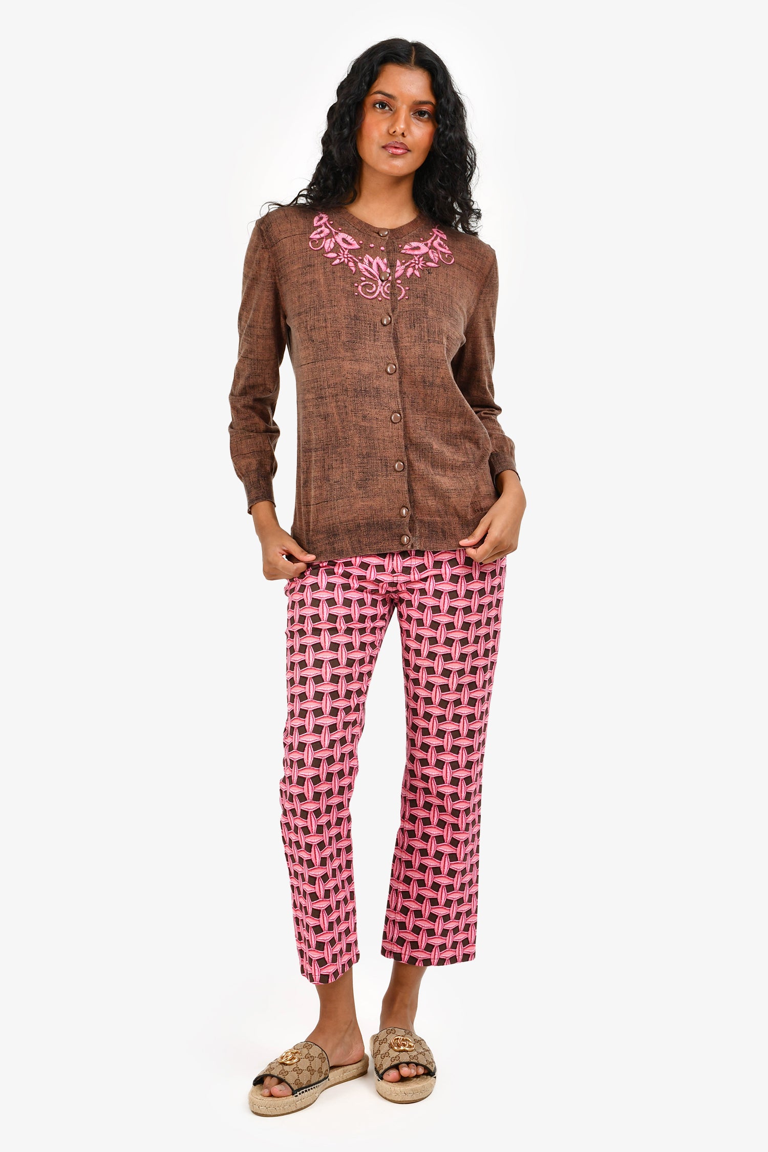 Refresh availabilityLouis Vuitton Brown/Pink Patterned Capri Pants. Front zip fly and button closure. Five-pocket style. Tonal stitching.