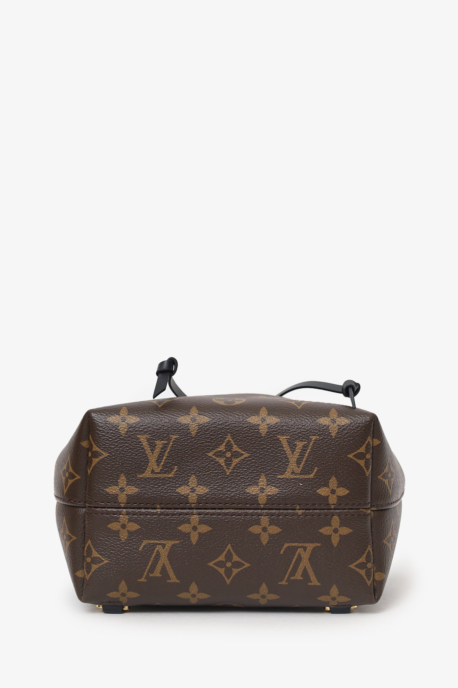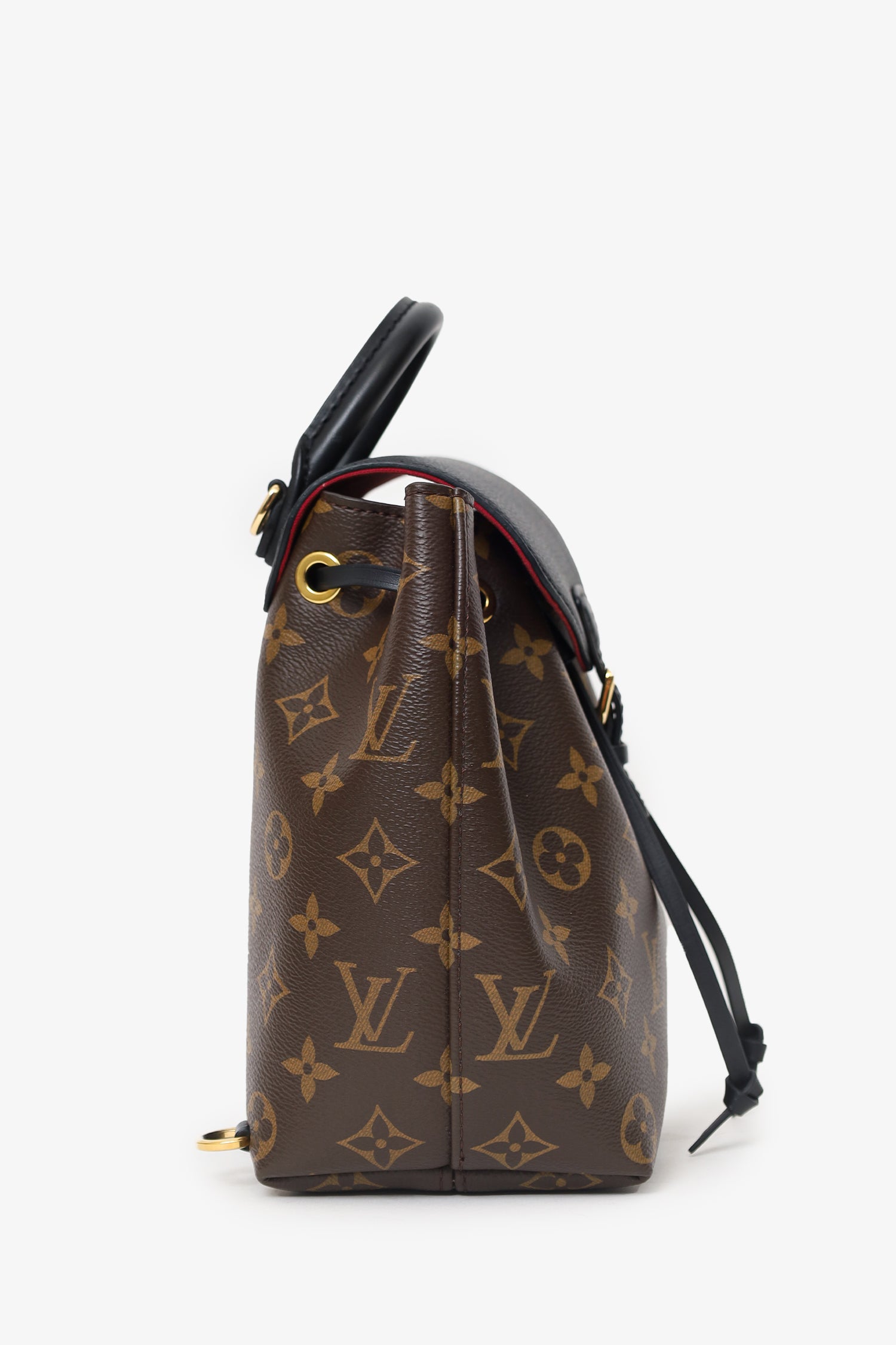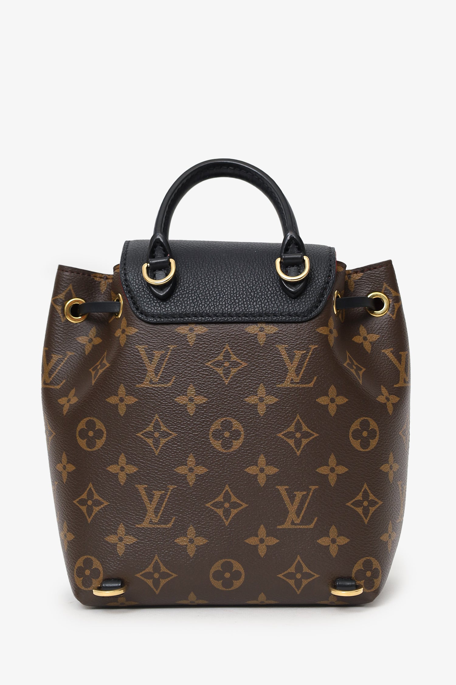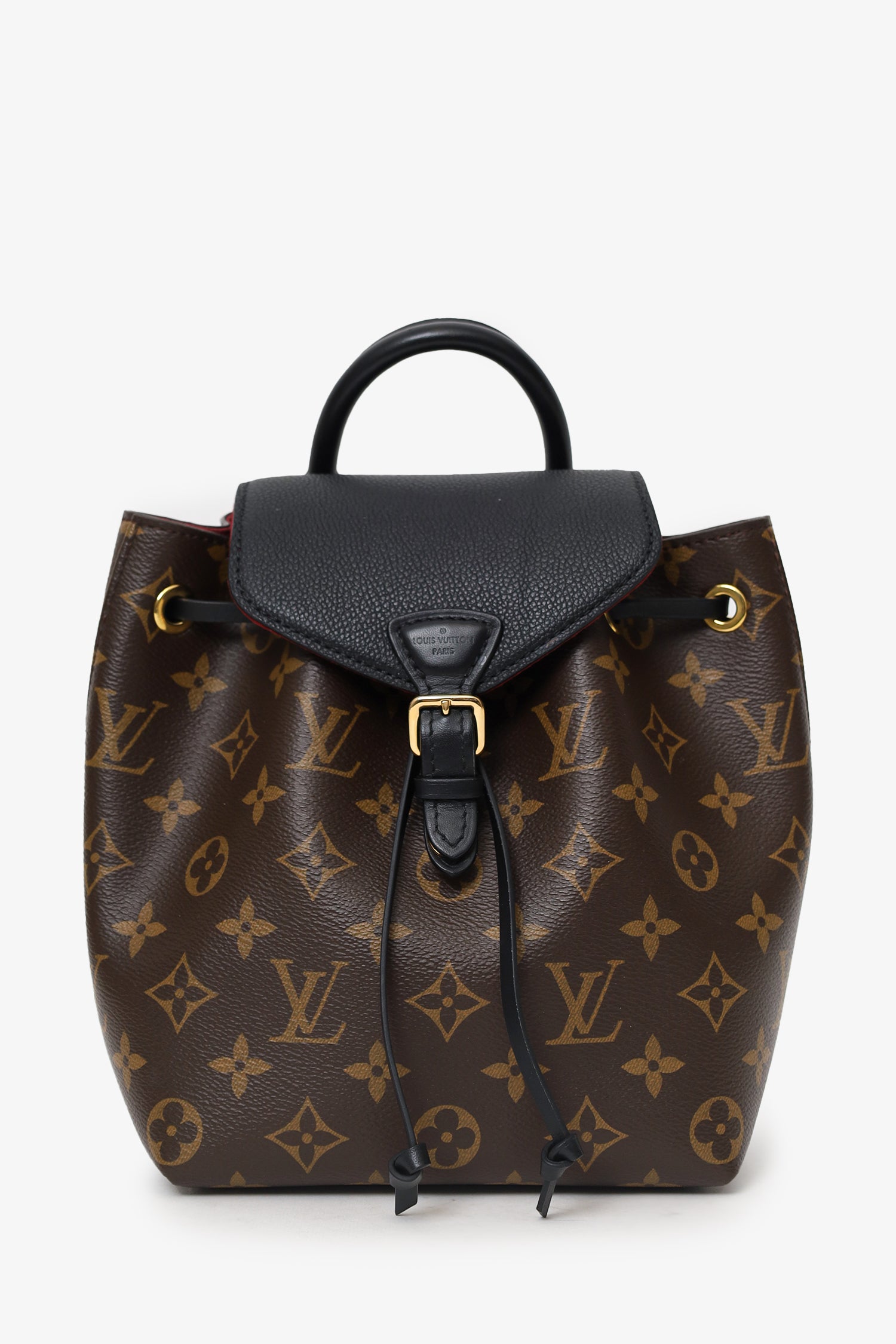 Refresh availabilityLouis Vuitton Brown/Black Monogram Montsouris BB Backpack. Front fold-over flap with snap-button closure. Top cinching closure. Top handle. Rear backpack straps with adjustable push-pin closure. Lined interior. Single interior slip pocket. Gold-tone hardware. Tonal stitching.