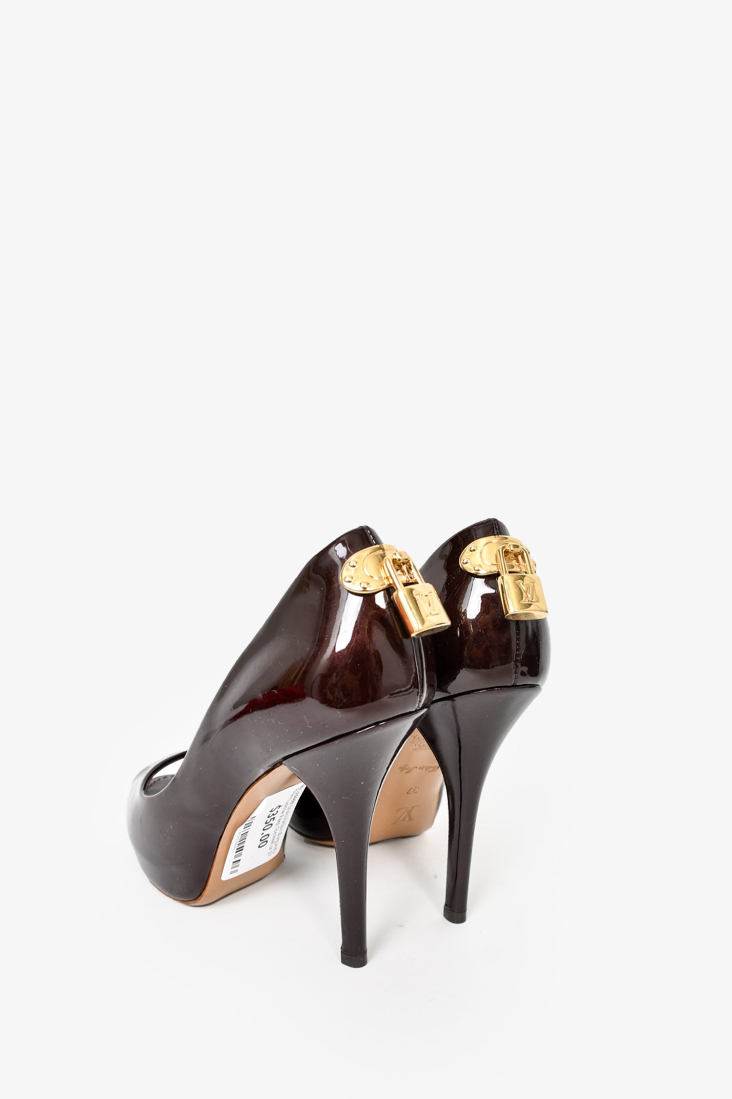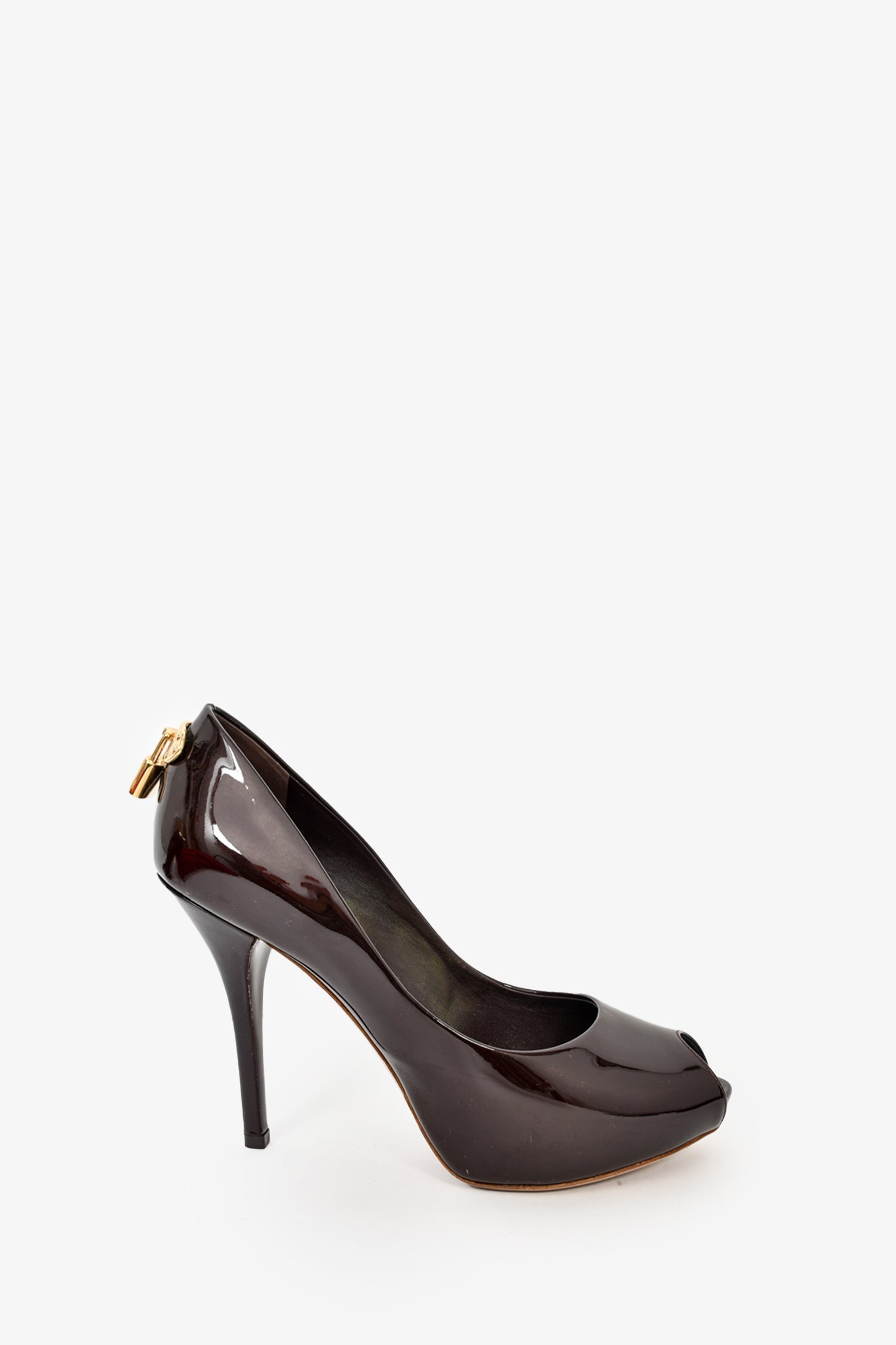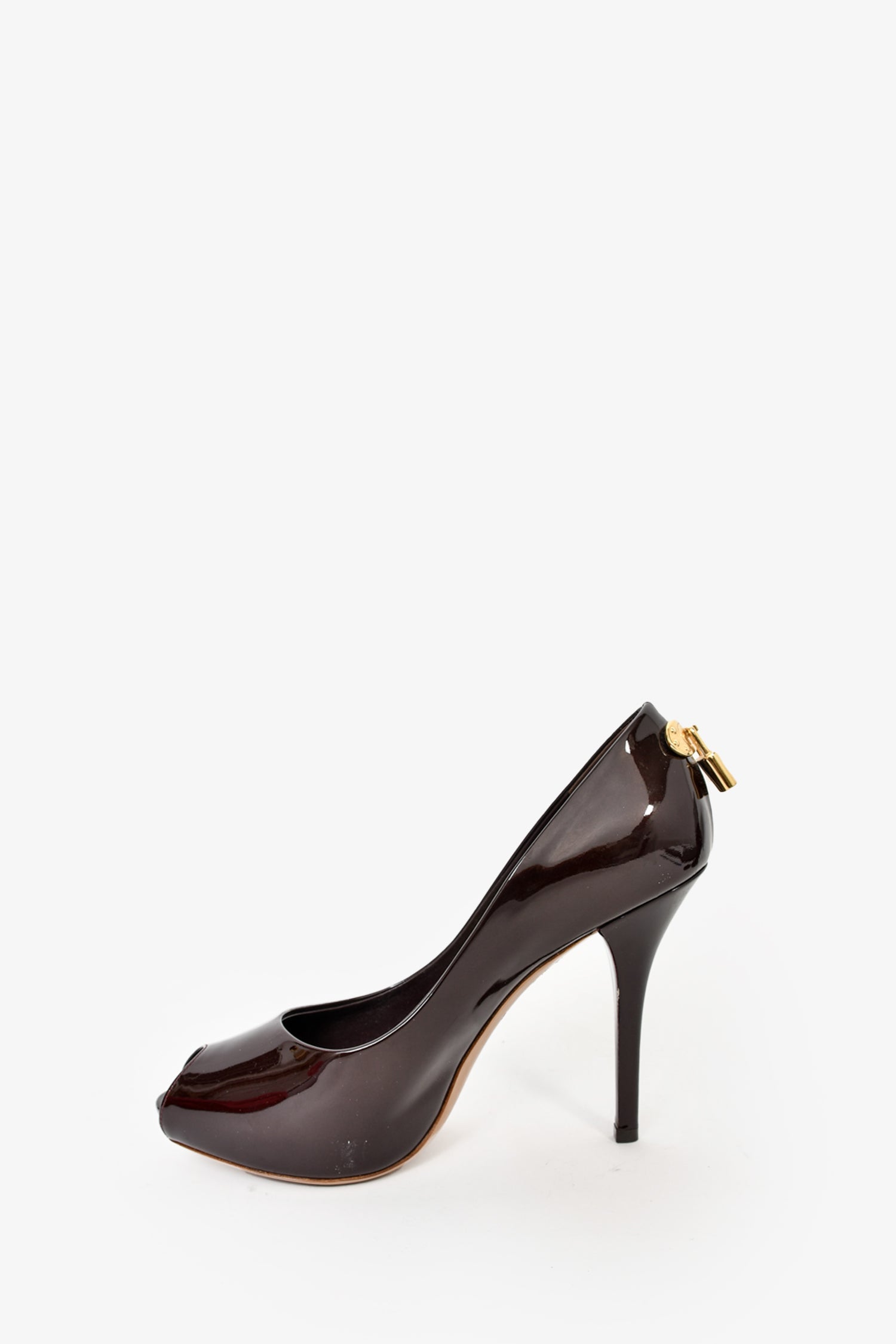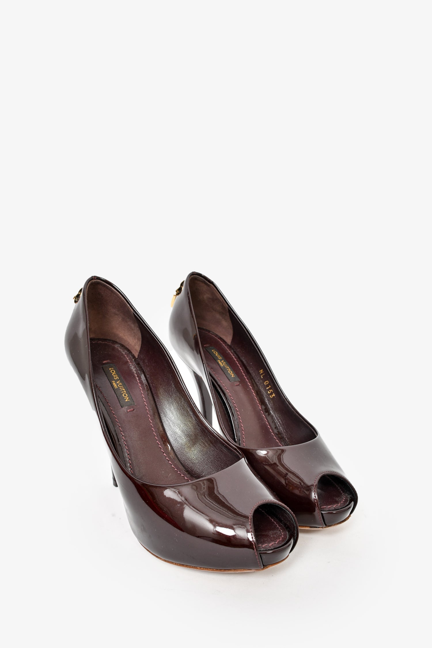 Refresh availabilityLouis Vuitton Burgundy Patent Leather Peep Toe Heel . Round toe. Gold-toned hardware. Tonal stitching.