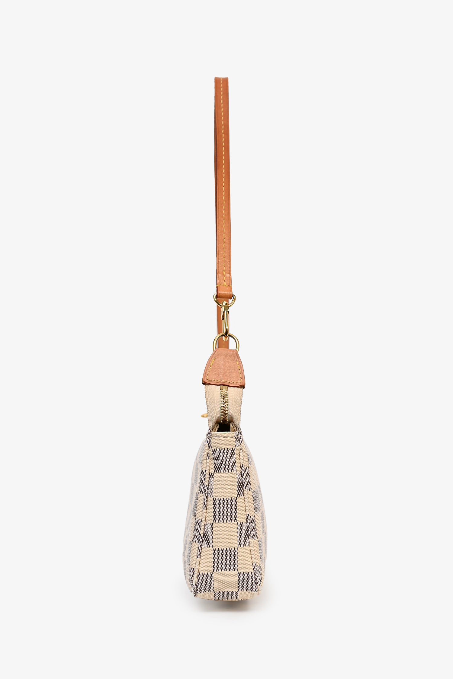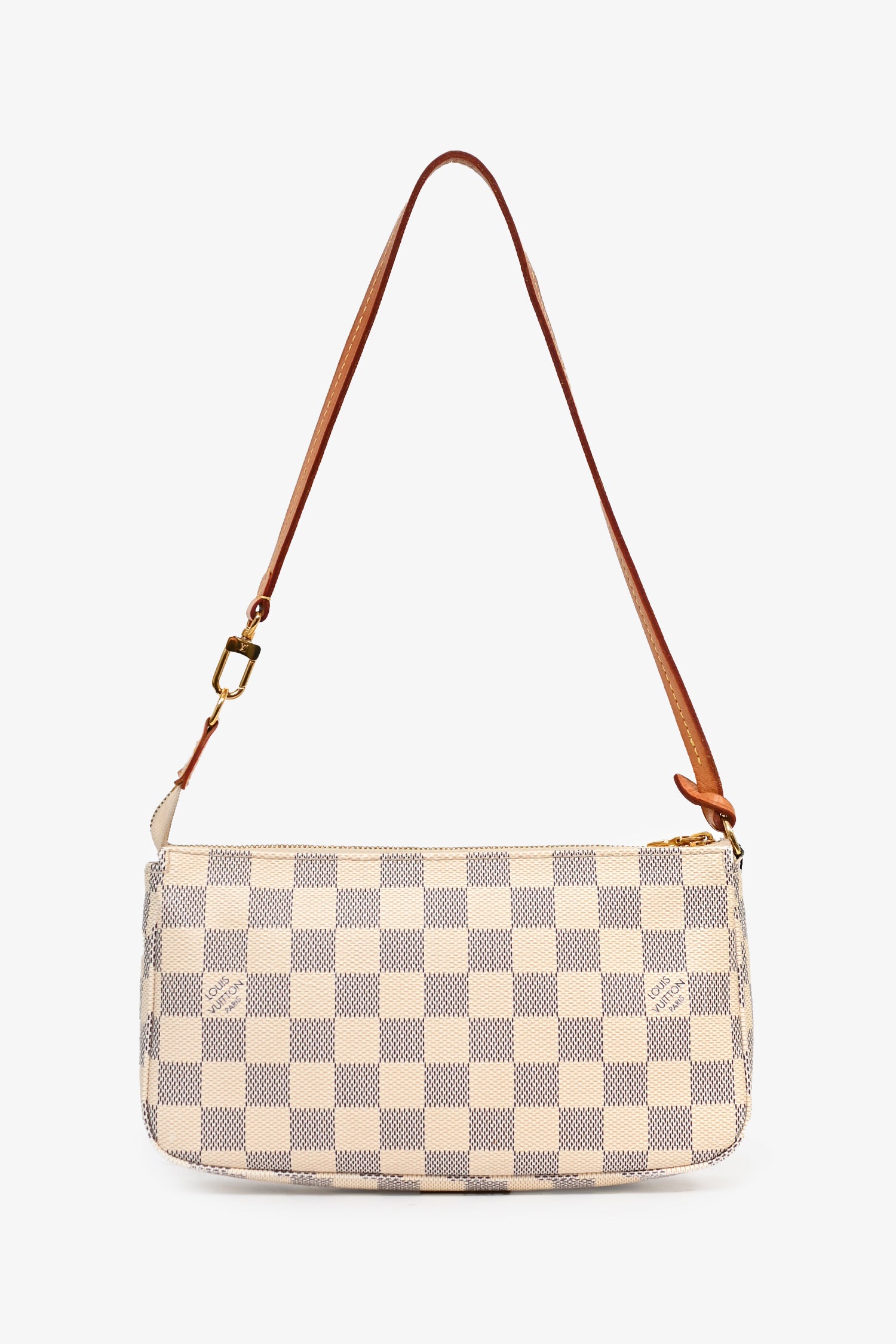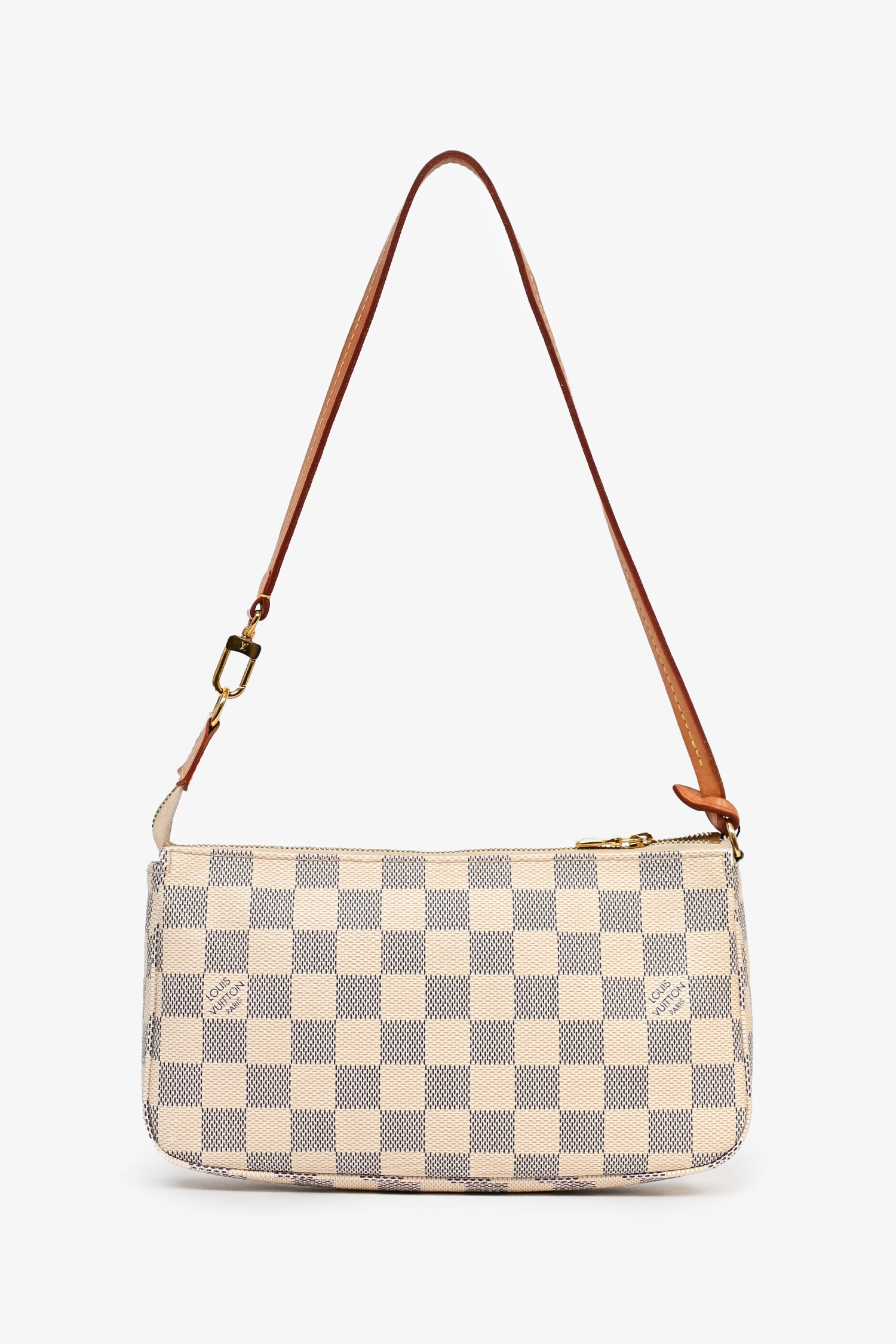 Refresh availabilityLouis Vuitton Damier Azur Pochette Accessories. Single leather shoulder strap. Top zip closure. One interior compartment with one slip pocket. Tonal stitching on bag and contrast stitching on leather strap.