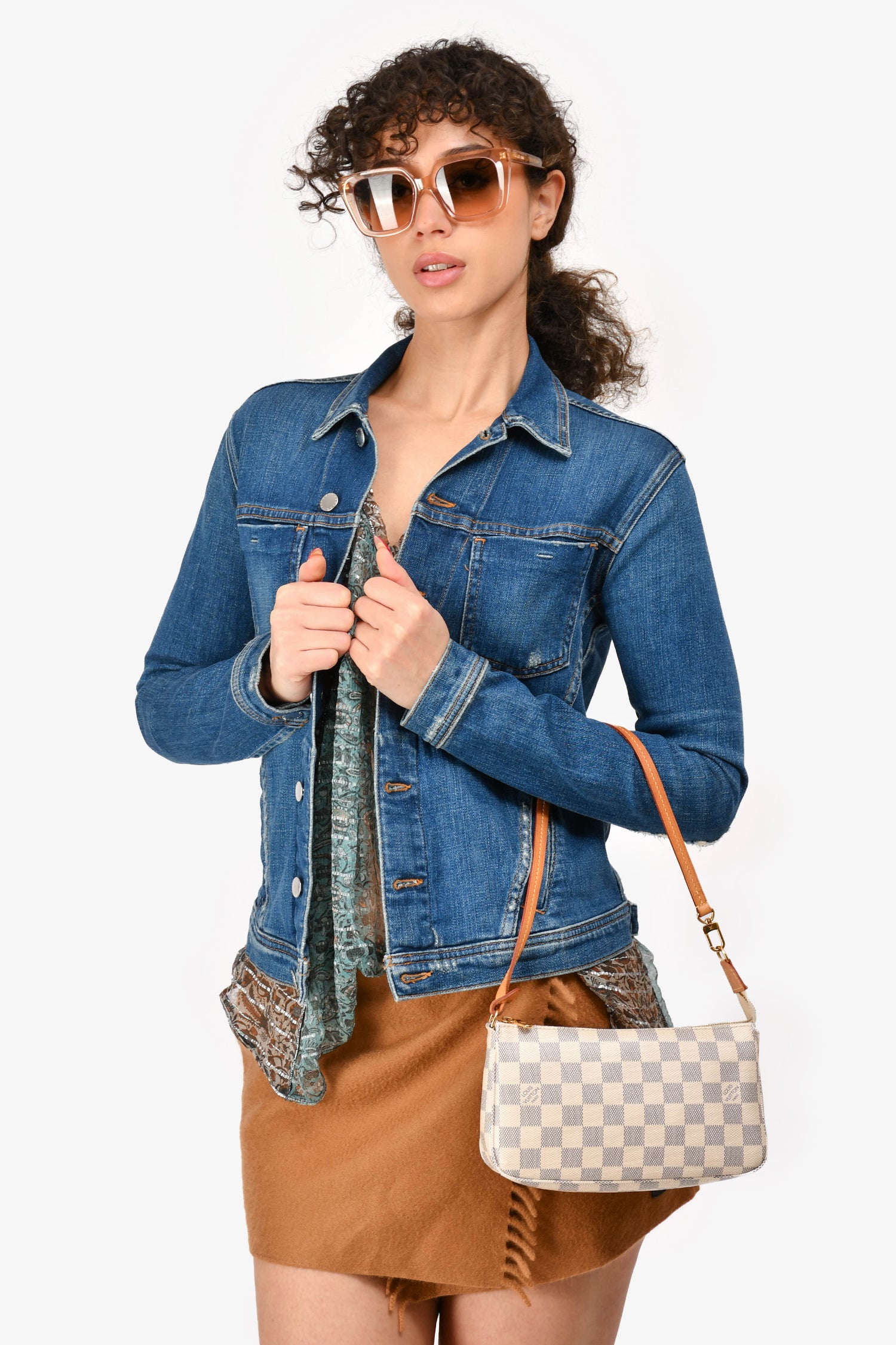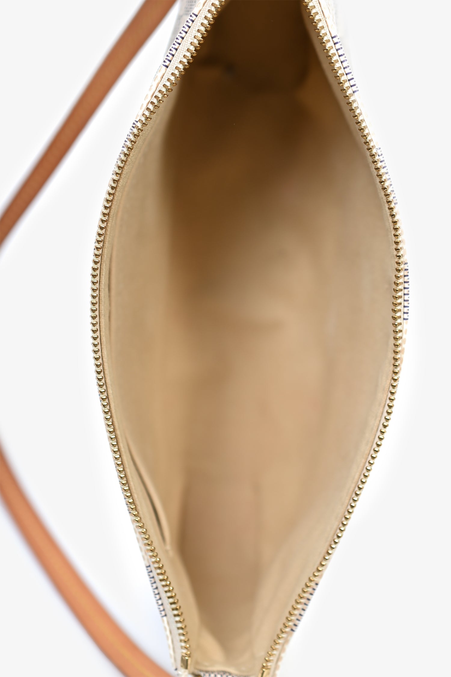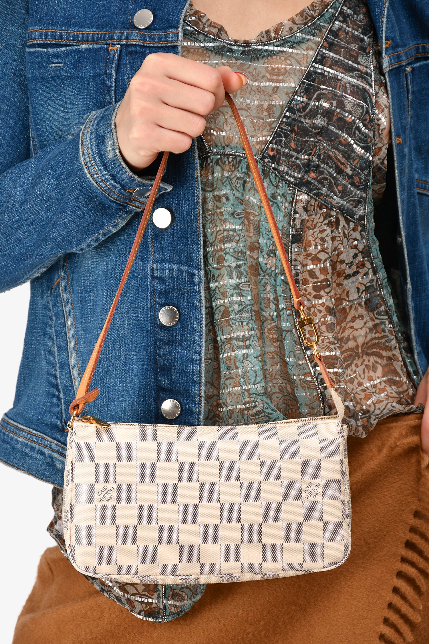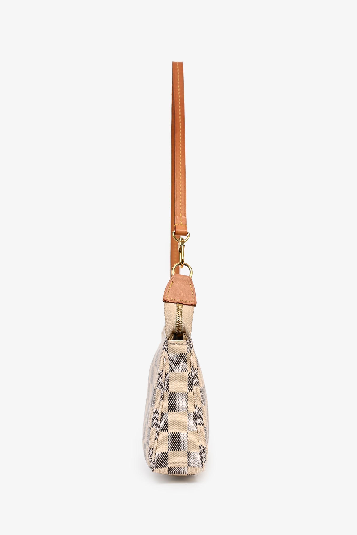 Refresh availabilityLouis Vuitton Damier Azur Pochette Accessories. Single leather shoulder strap. Top zip closure. One interior compartment with one slip pocket. Tonal stitching on bag and contrast stitching on leather strap.