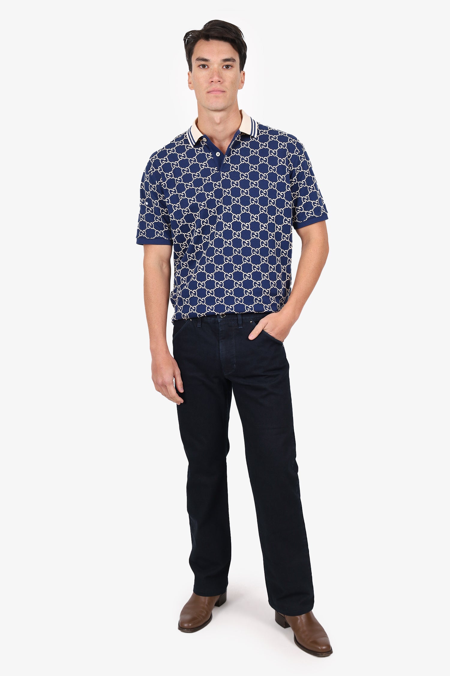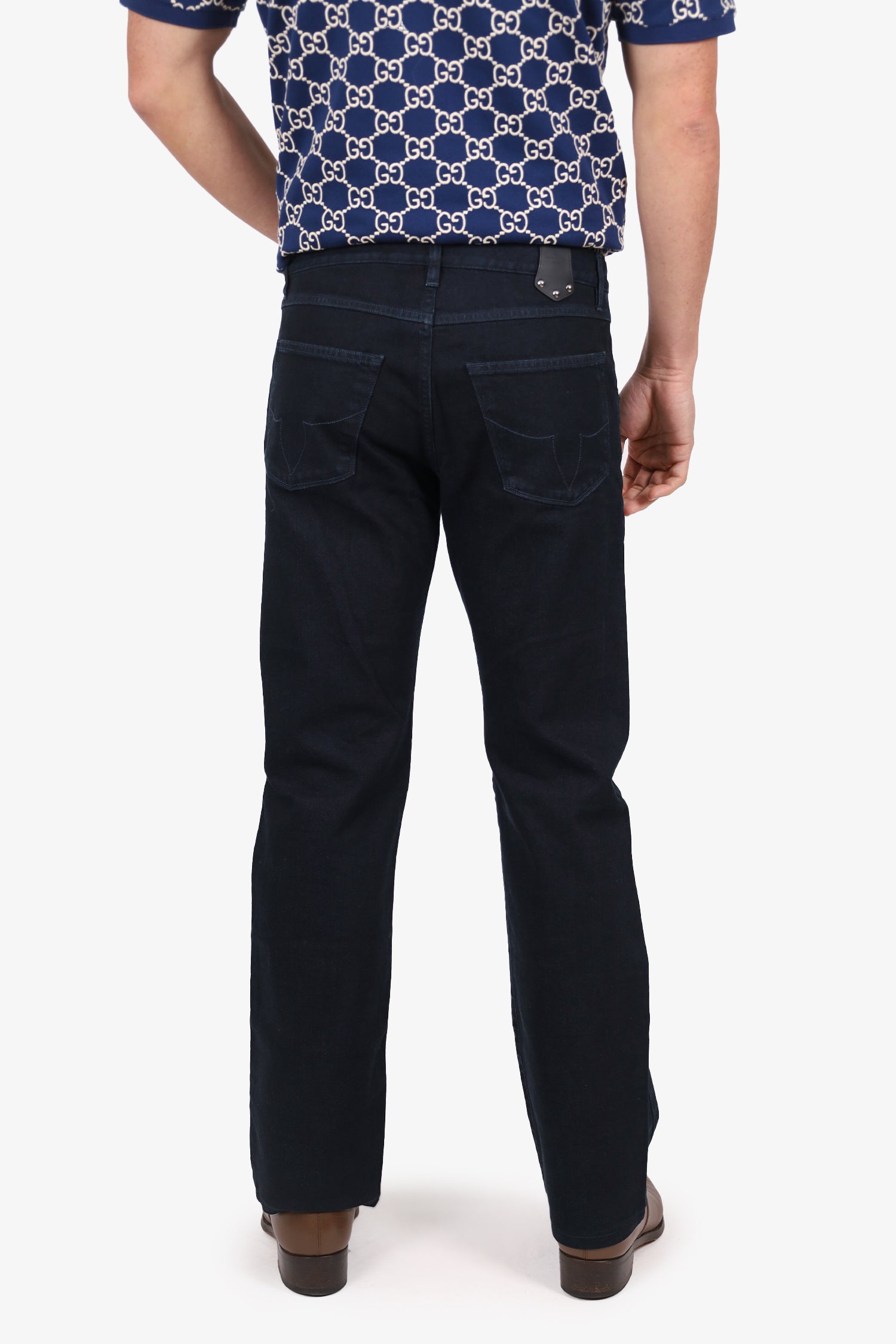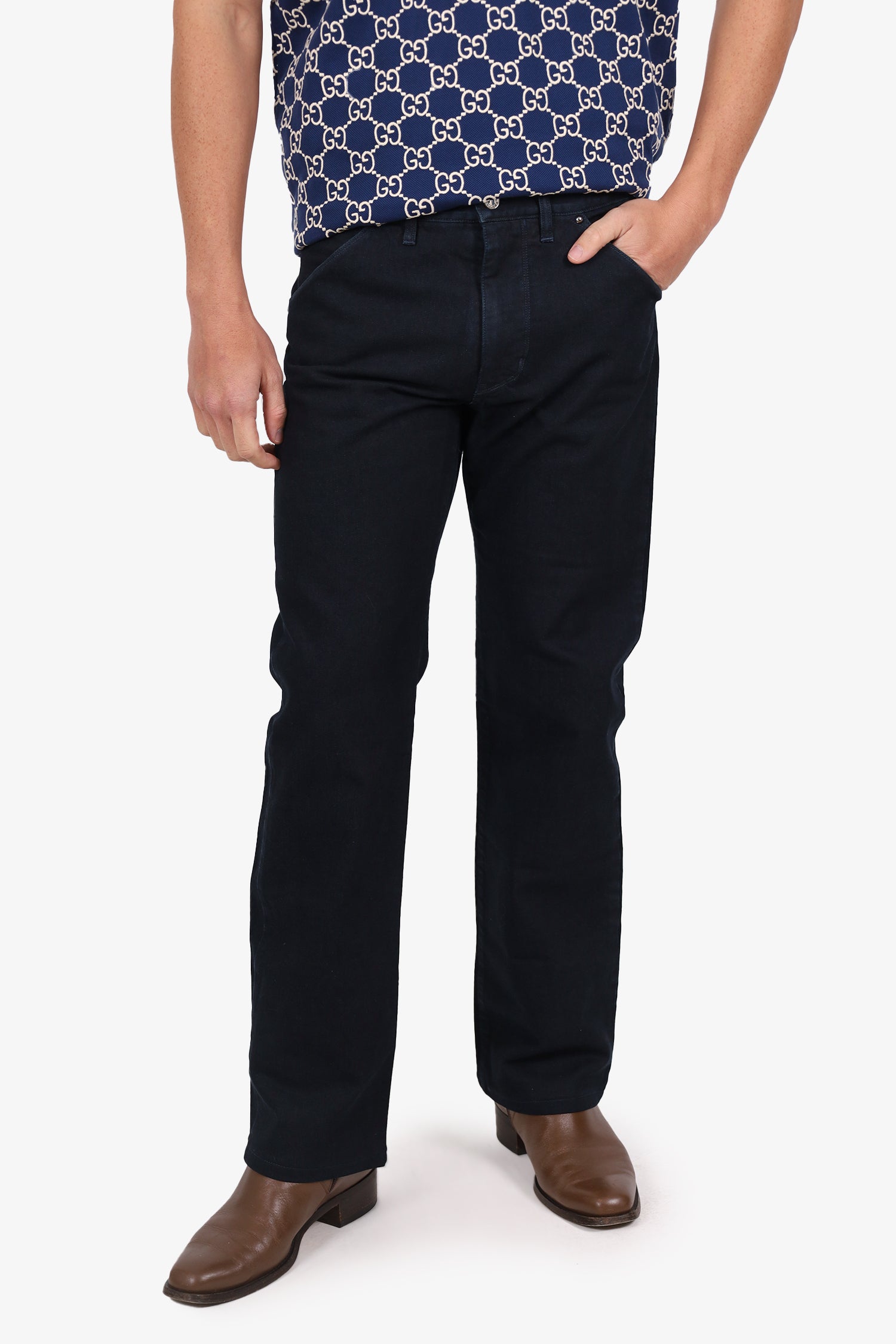 Refresh availabilityLouis Vuitton Dark Blue Denim Straight Leg Jeans. Slip-on. Front zip with button closure. Waistband belt loops. 4 exterior pockets; 2 front side slip and 2 rear slip. Silver-tone hardware. Tonal stitching.