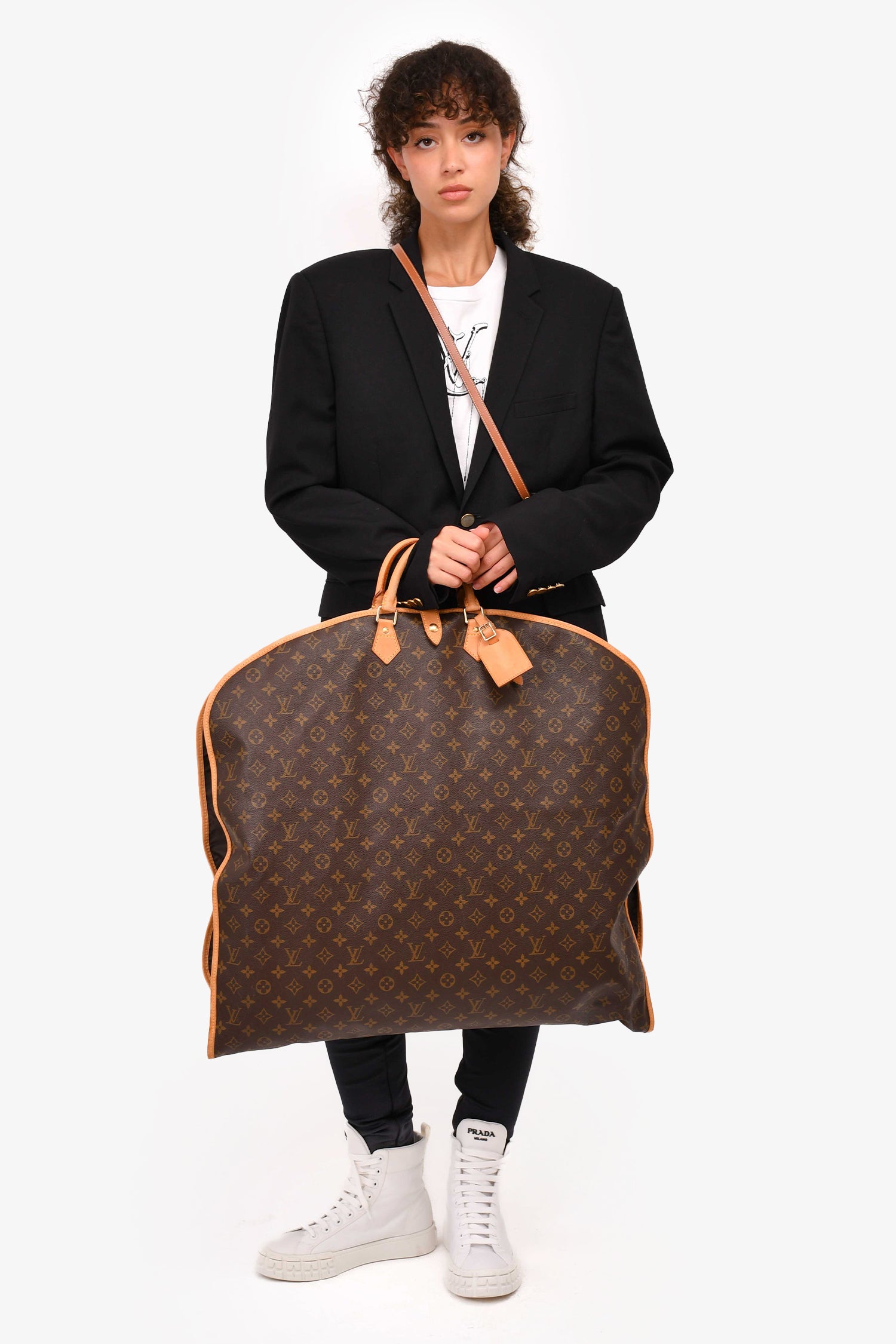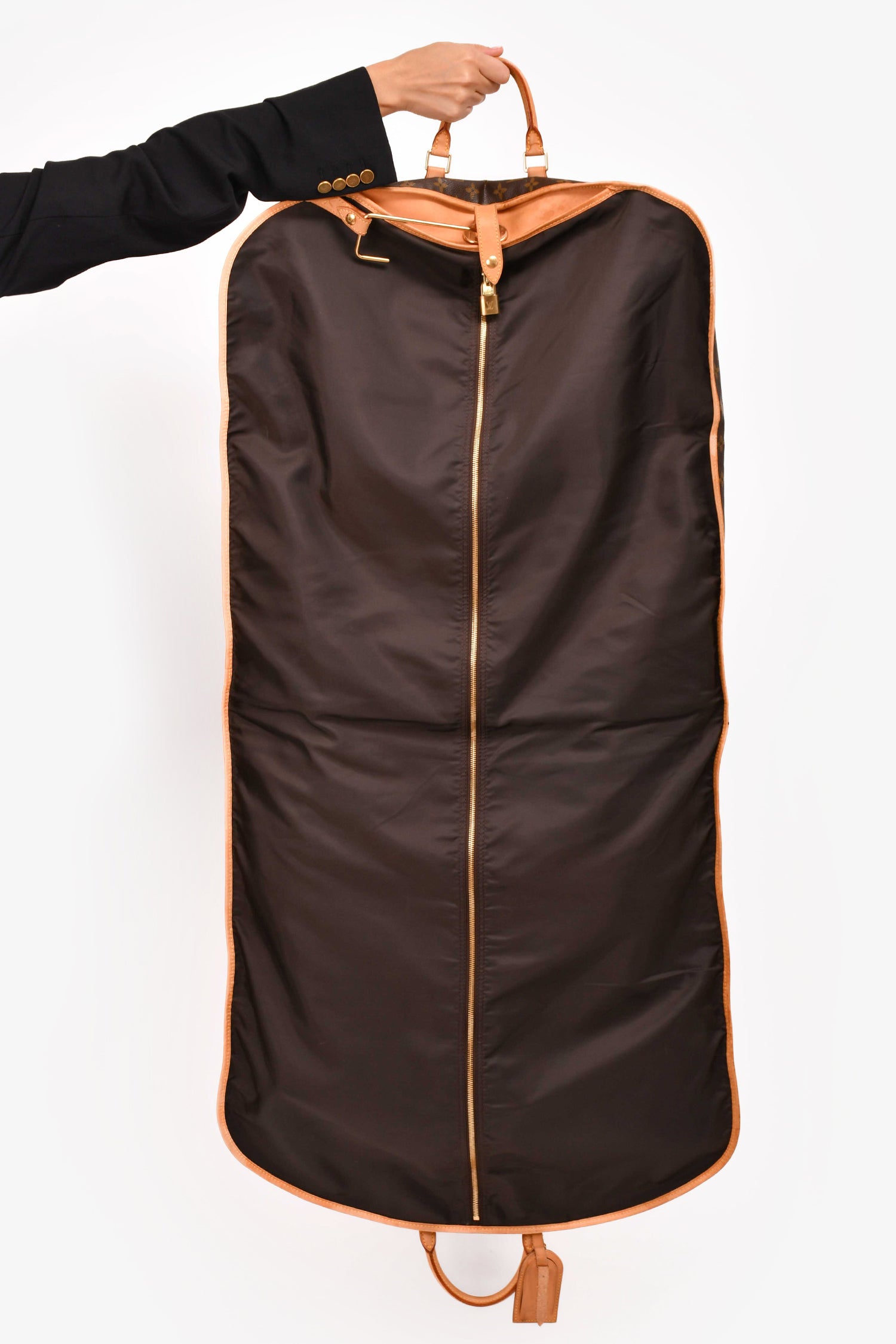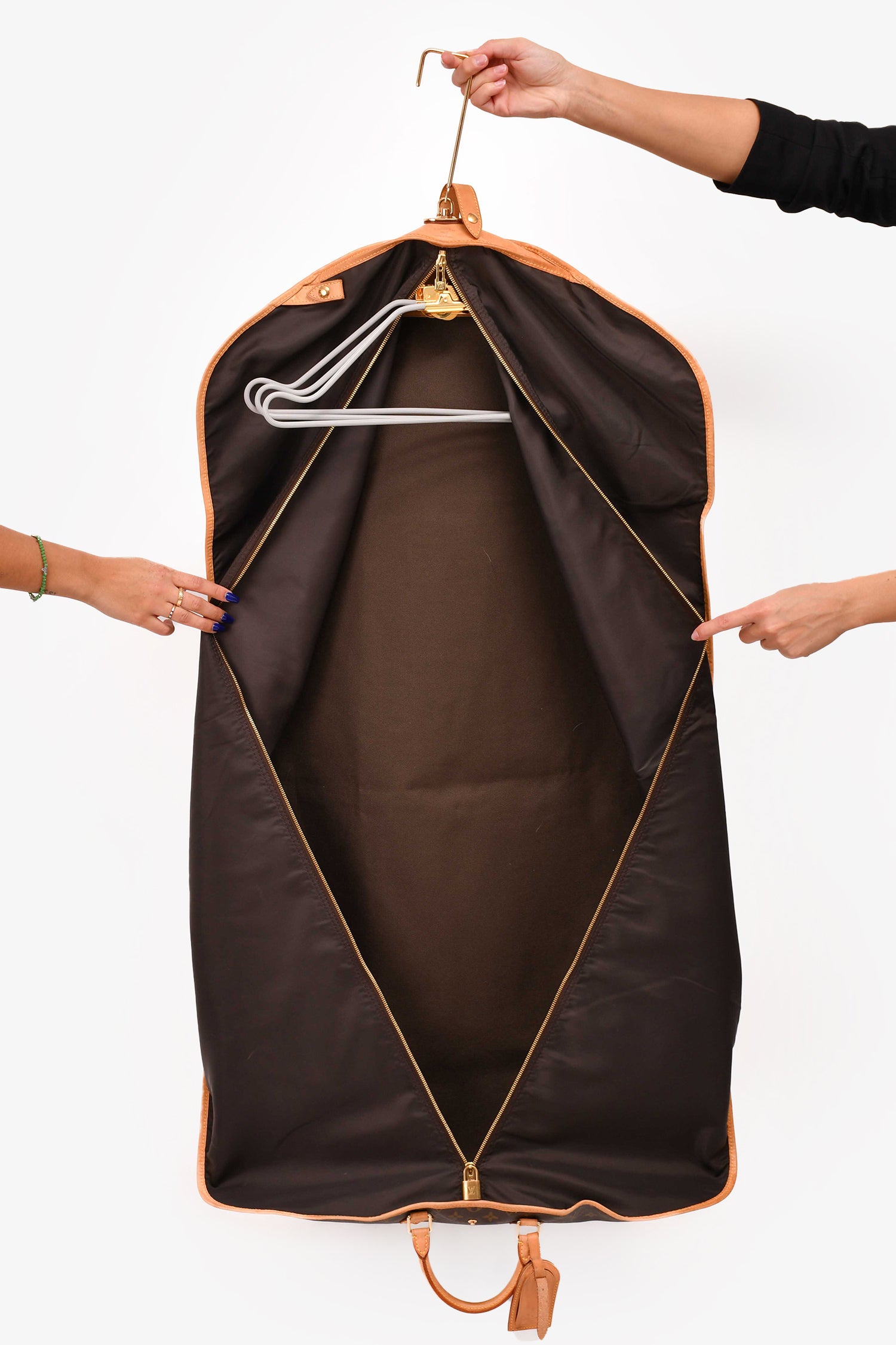 Refresh availabilityLouis Vuitton Monogram Garment Bag with Hangers. Gold-tone hardware. Includes 3 hangers. Full zip closure. Handles on both ends. Luggage tag. Metal hanger component. Yellow stitching.