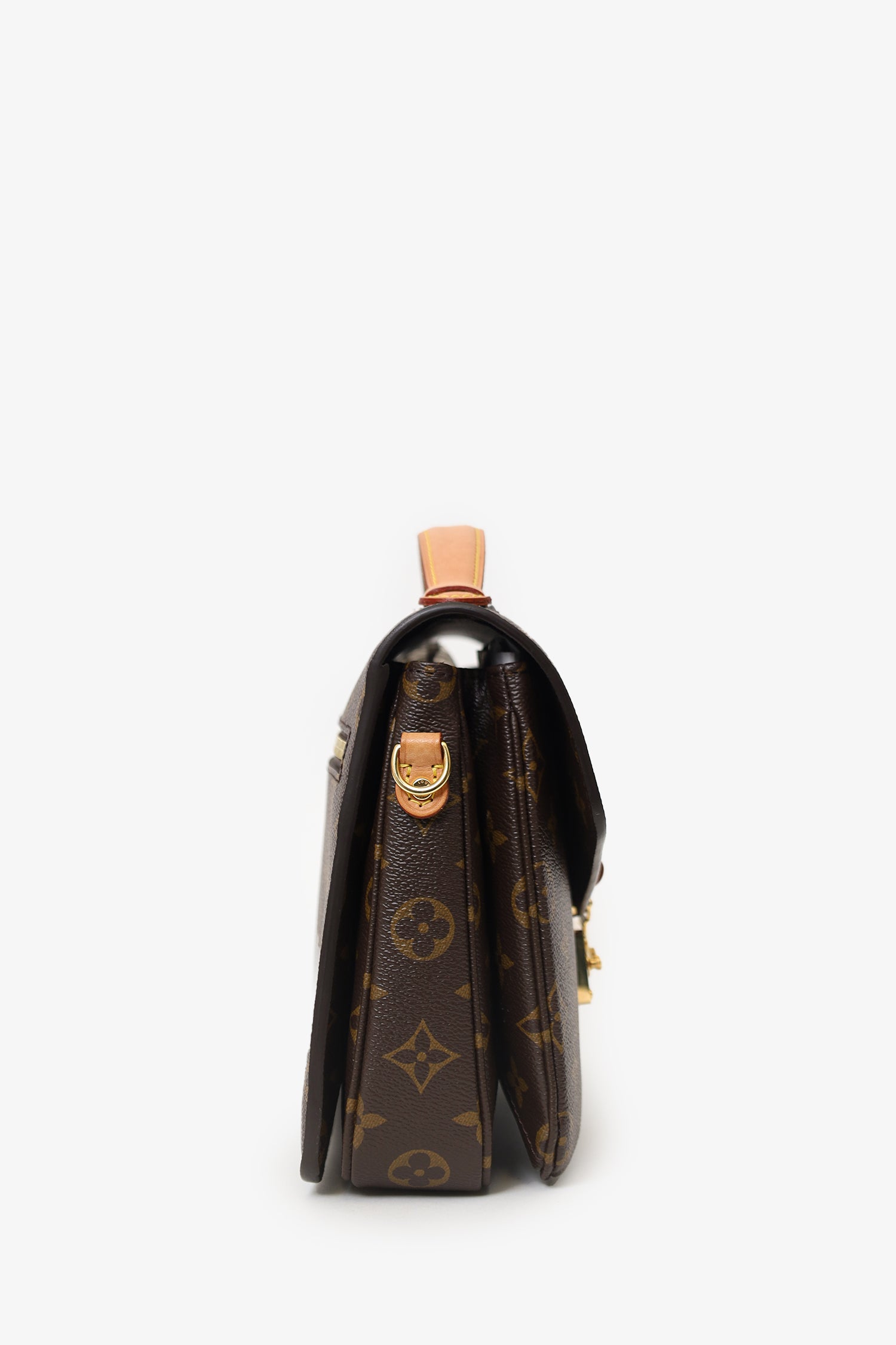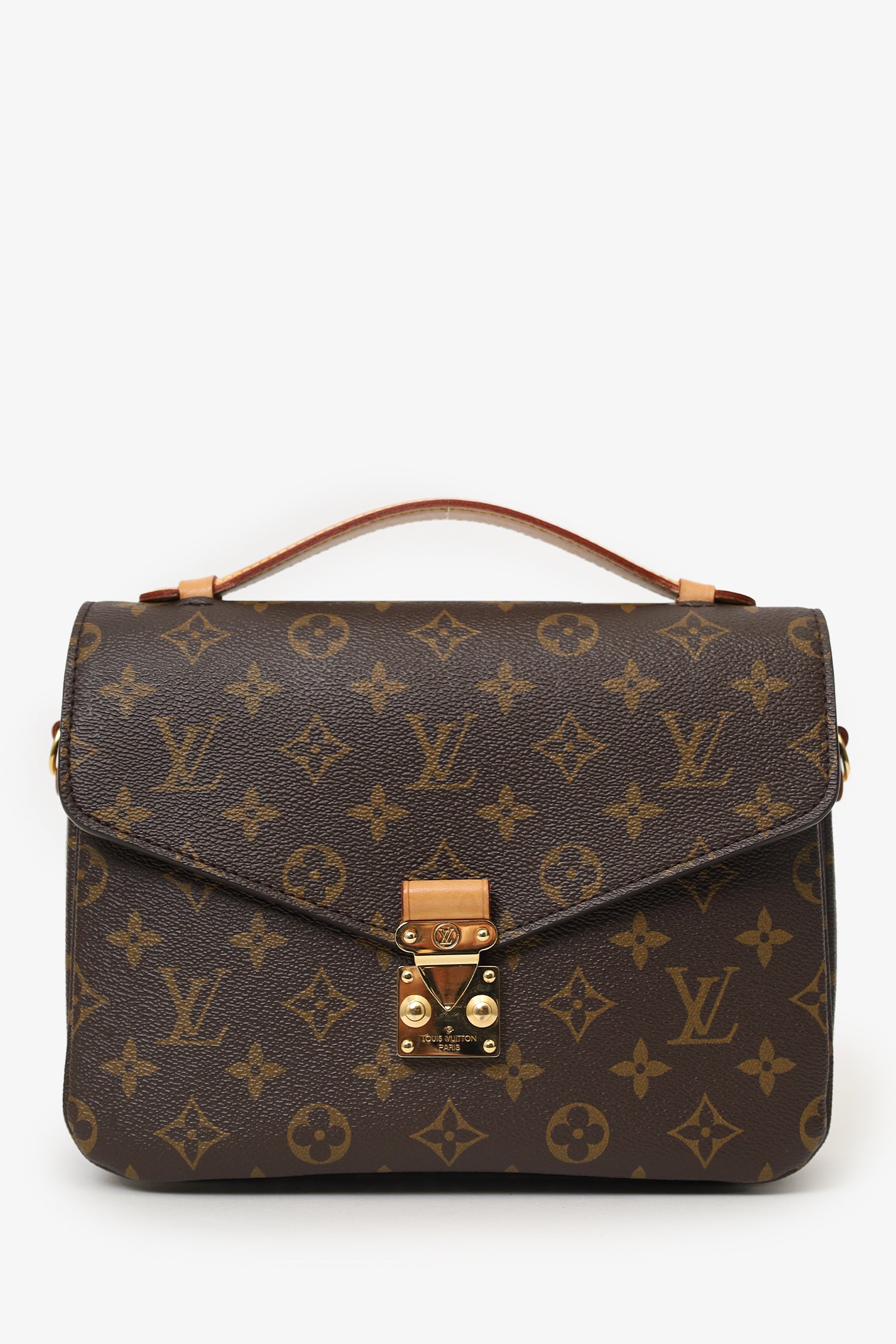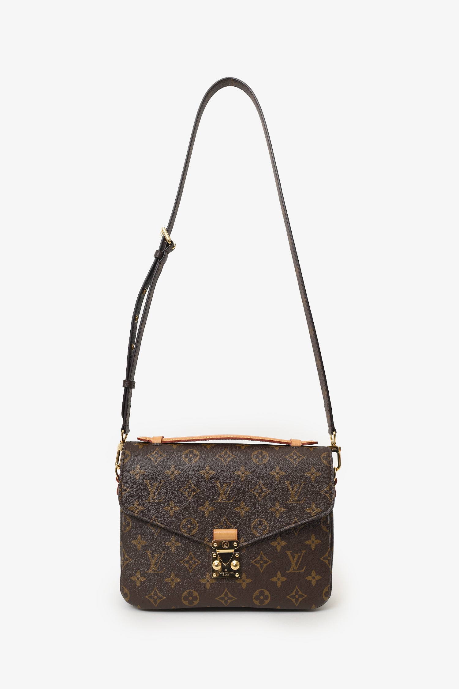 Refresh availabilityLouis Vuitton Monogram Pochette Metis With Strap. Front fold-over flap with push-lock closure. Top handle. Removable crossbody strap with adjustable buckle closure. Single rear exterior pocket. Suede-lined interior. 2 interior compartment. Gold-tone hardware. Tonal stitching.
