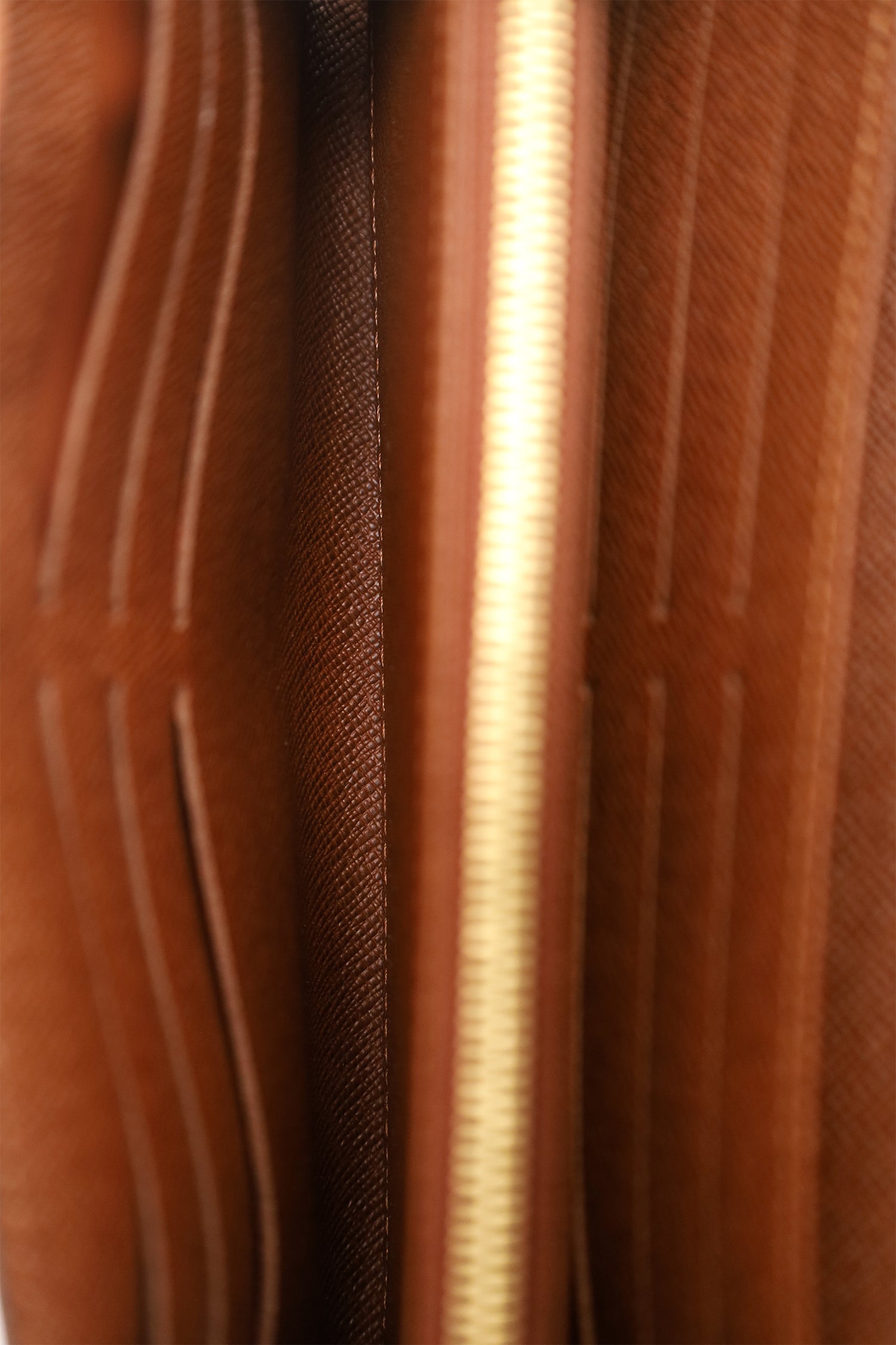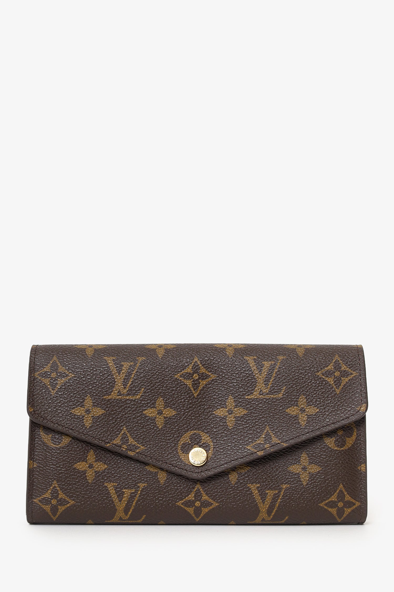 Refresh availabilityLouis Vuitton Monogram Sarah Wallet. Front fold-over flap with snap button-up closure. Single rear slip pocket. Lined interior with 20 pockets; 16 card, 2 slip, 1 bill, and 1 zip. Gold-tone hardware. Tonal stitching.