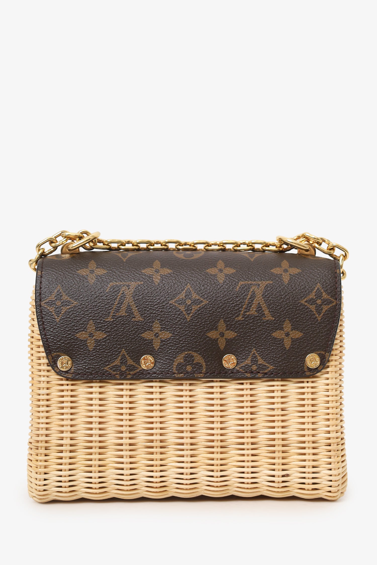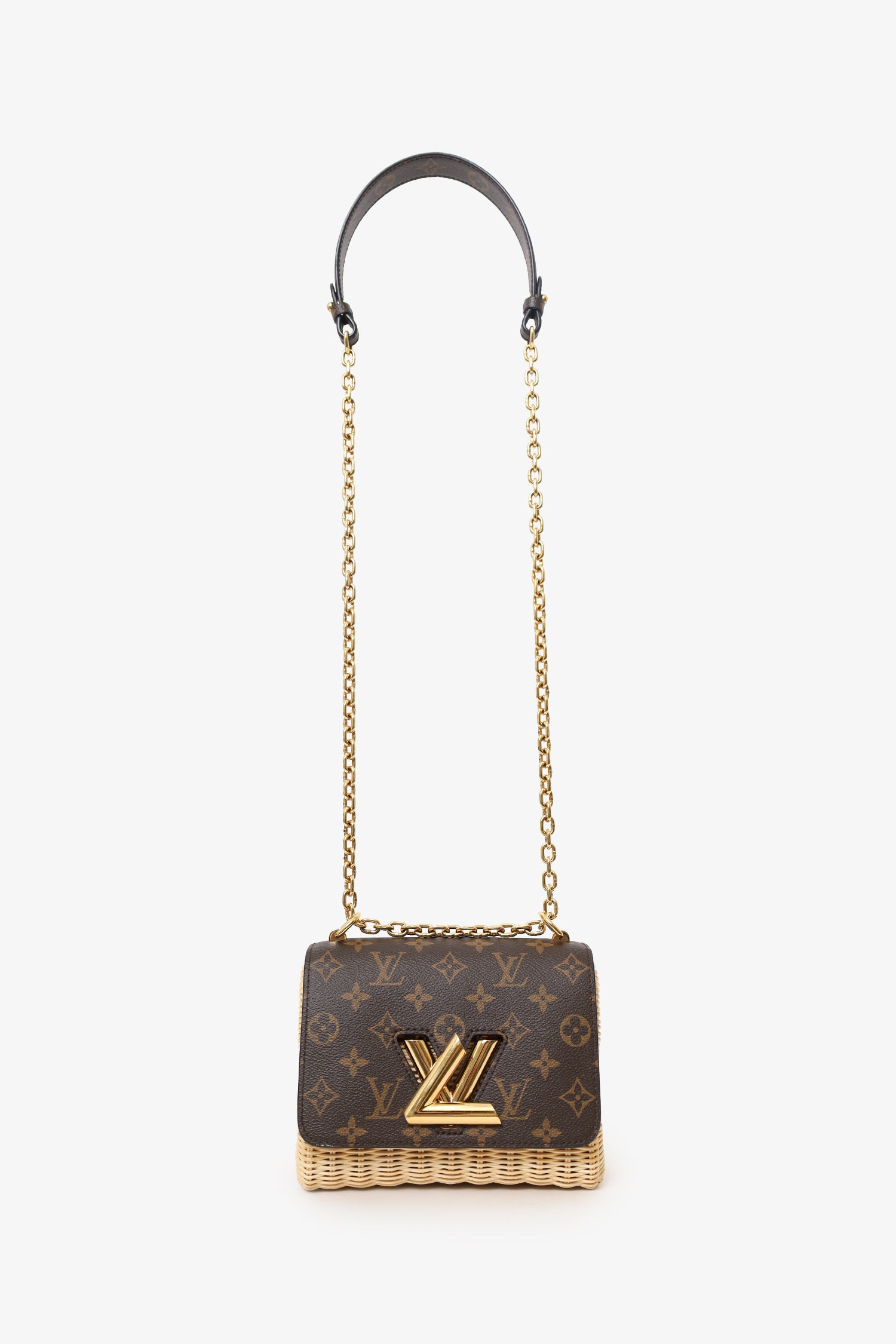 Refresh availabilityLouis Vuitton Monogram Wicker Twist PM Shoulder Bag. Front fold-over flap with turn-lock closure. Chainlink/leather strap that can be doubled as shoulder straps. Suede and leather-lined interior. Single interior slip card slot. Gold-tone hardware. Tonal stitching.