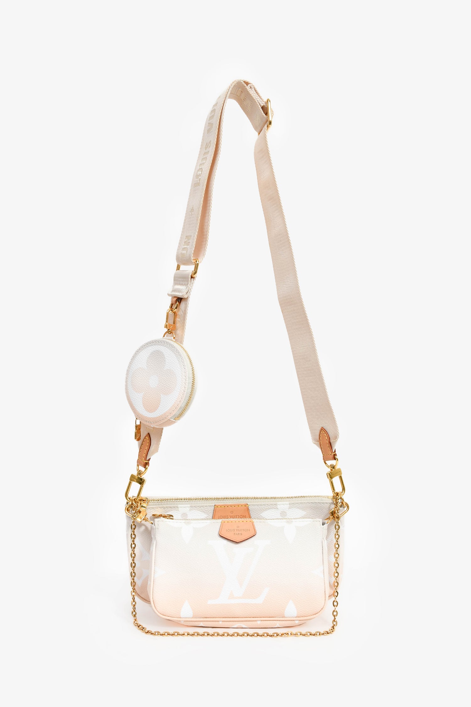 Refresh availabilityLouis Vuitton Peach Monogram 'By The Pool' Multi-Pochette Crossbody. Top zip closure. Detachable web strap, shoulder chain, pouch, and coin pouch. Textile-lined interior. Gold-tone hardware. Tonal stitching.