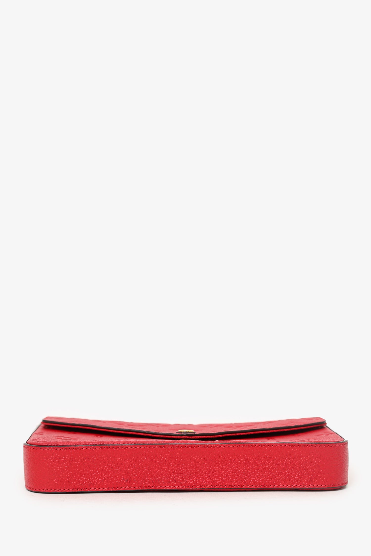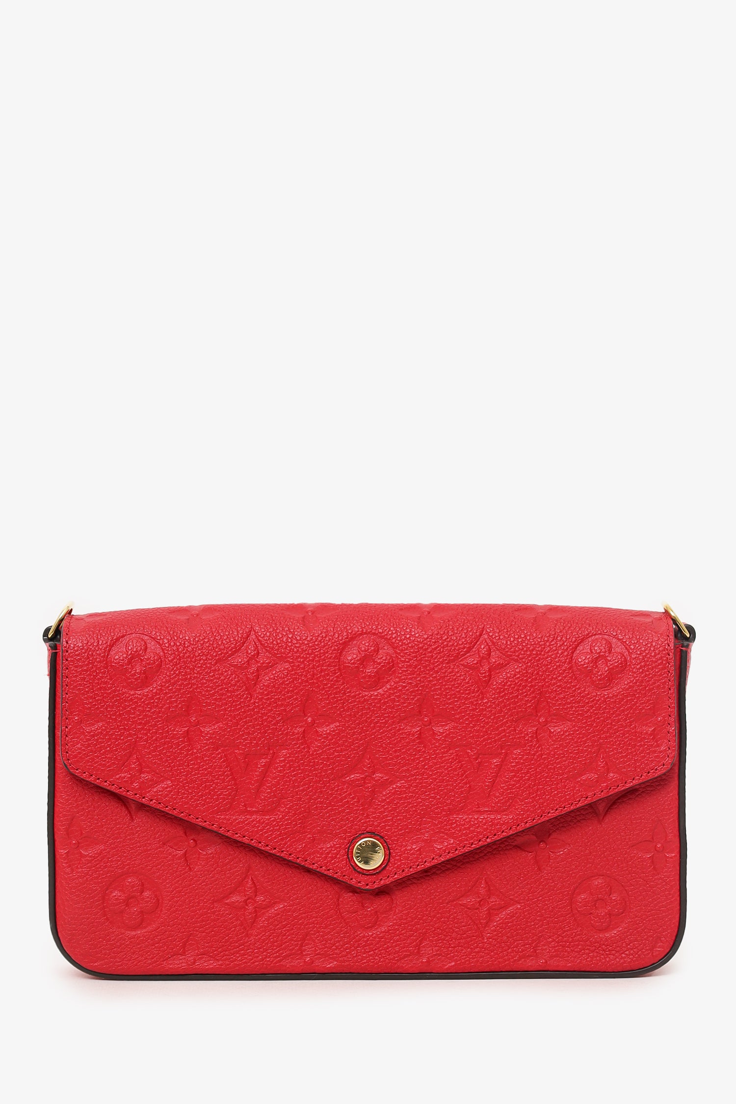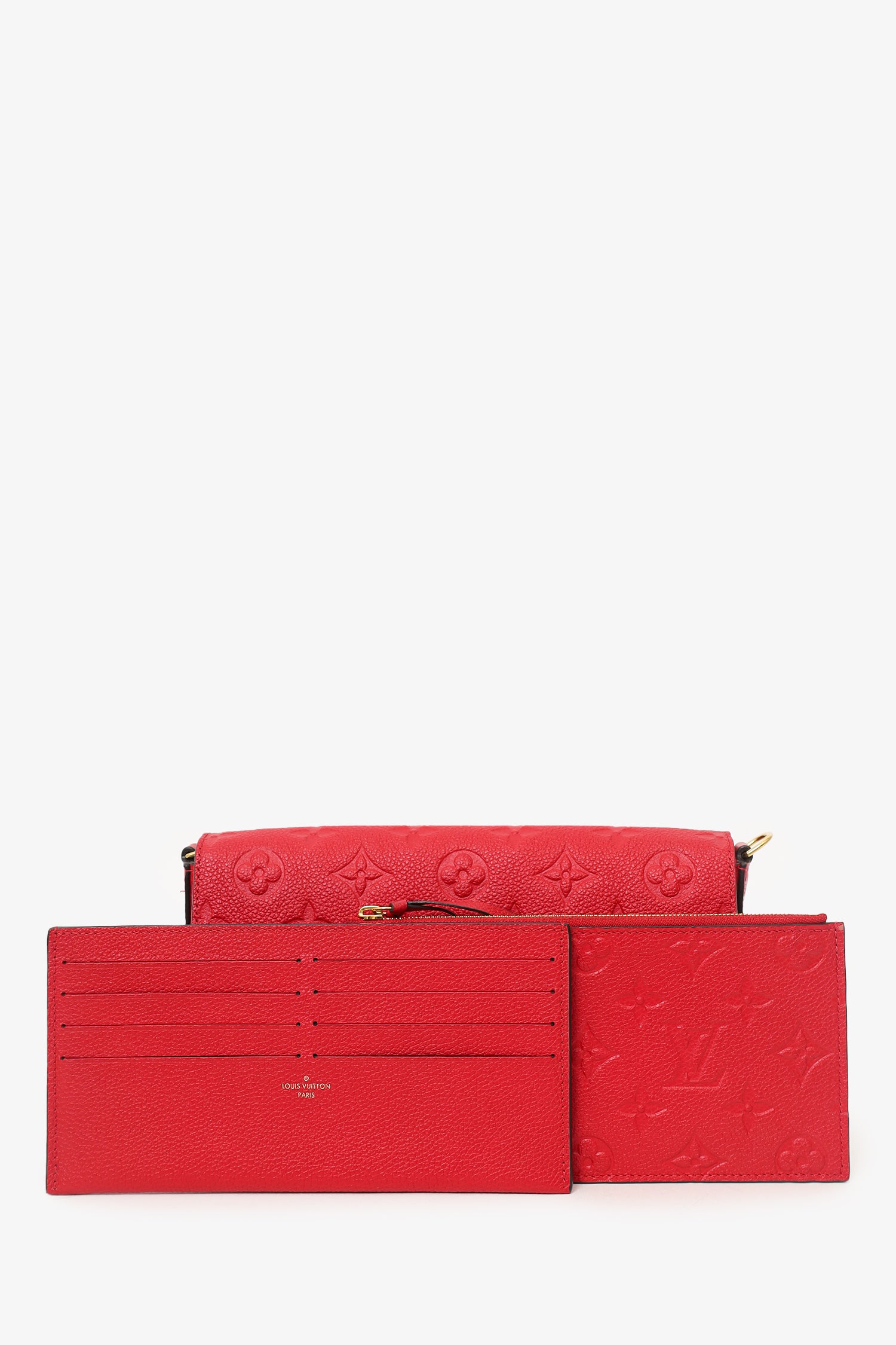 Refresh availabilityLouis Vuitton Red Leather Felicie Pochette. Snap button closure. Interior wall slip pocket. 2 additional inserts; 1 with 9 slip pockets (8 card, 1 wide) and 1 insert with zip closure. Gold-tone hardware. Tonal stitching.