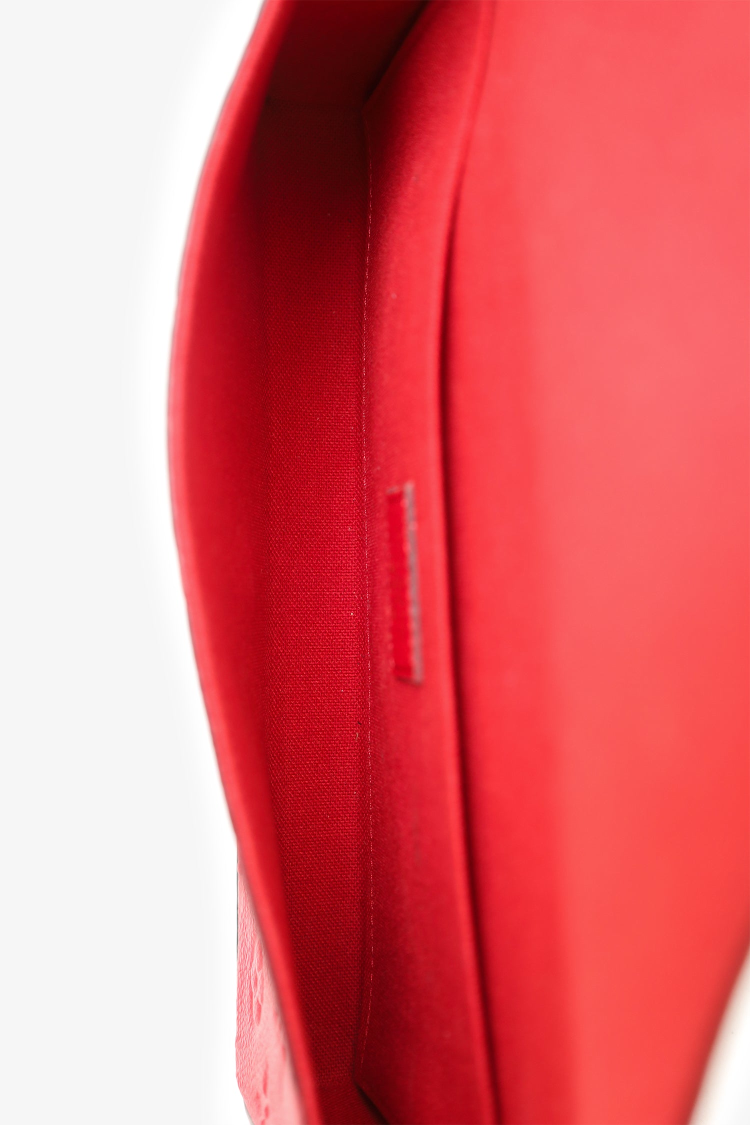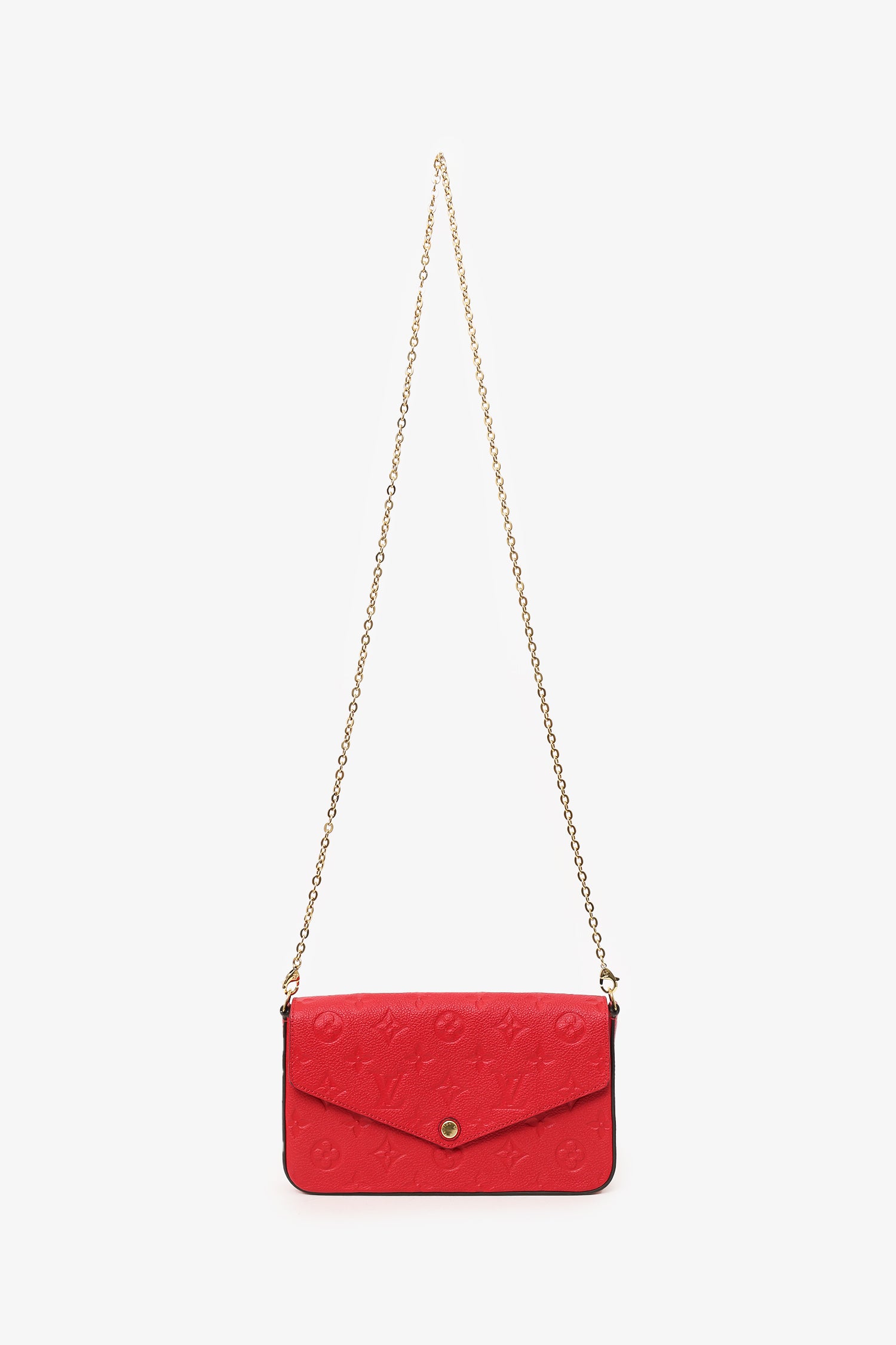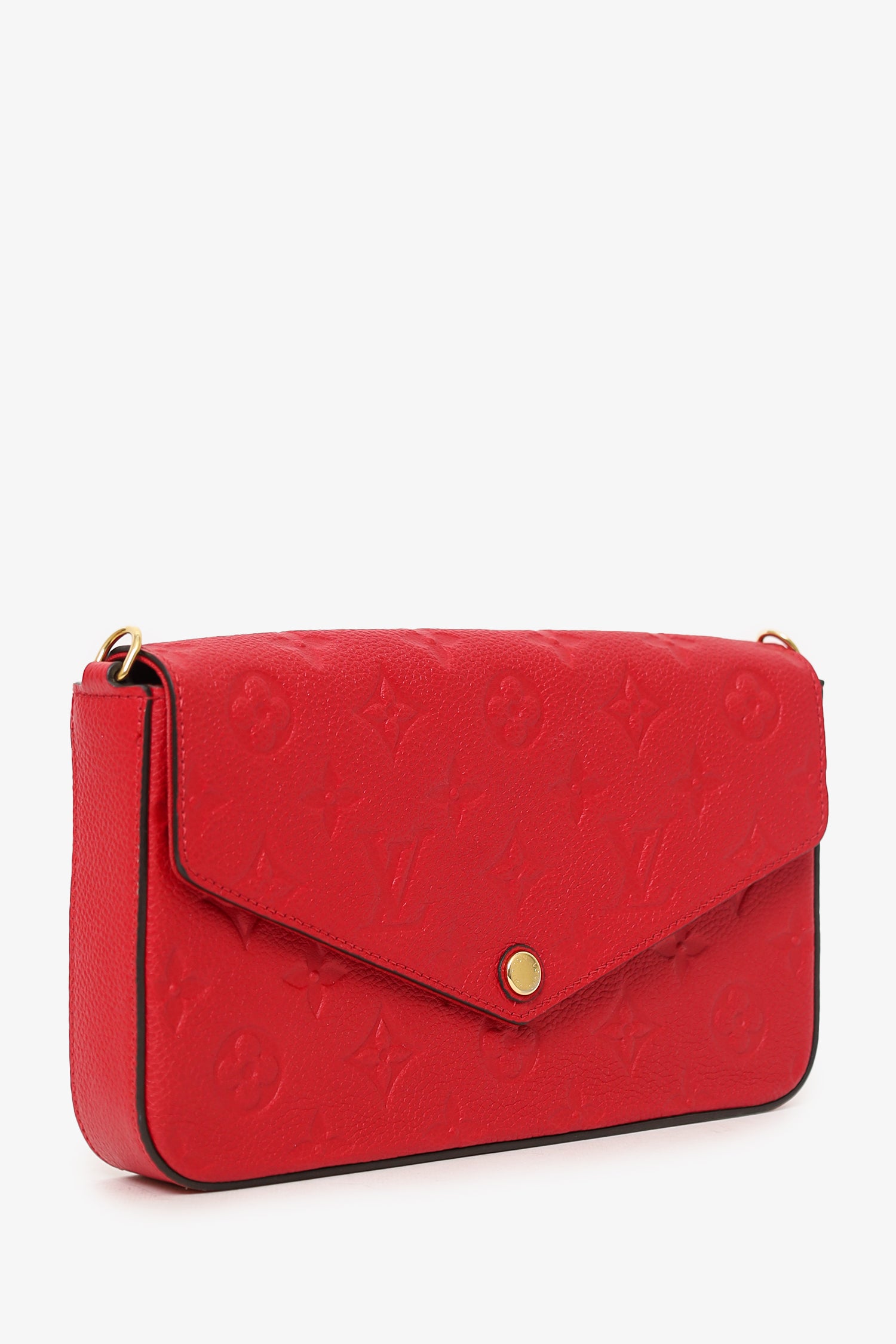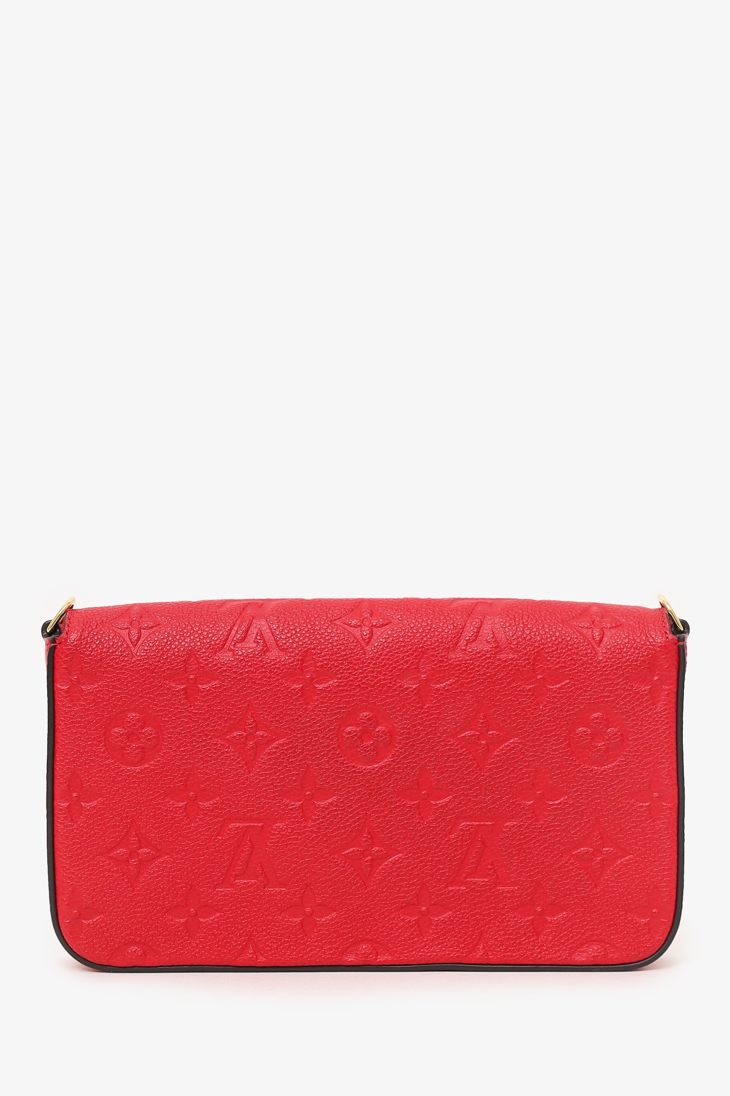 Refresh availabilityLouis Vuitton Red Leather Felicie Pochette. Snap button closure. Interior wall slip pocket. 2 additional inserts; 1 with 9 slip pockets (8 card, 1 wide) and 1 insert with zip closure. Gold-tone hardware. Tonal stitching.