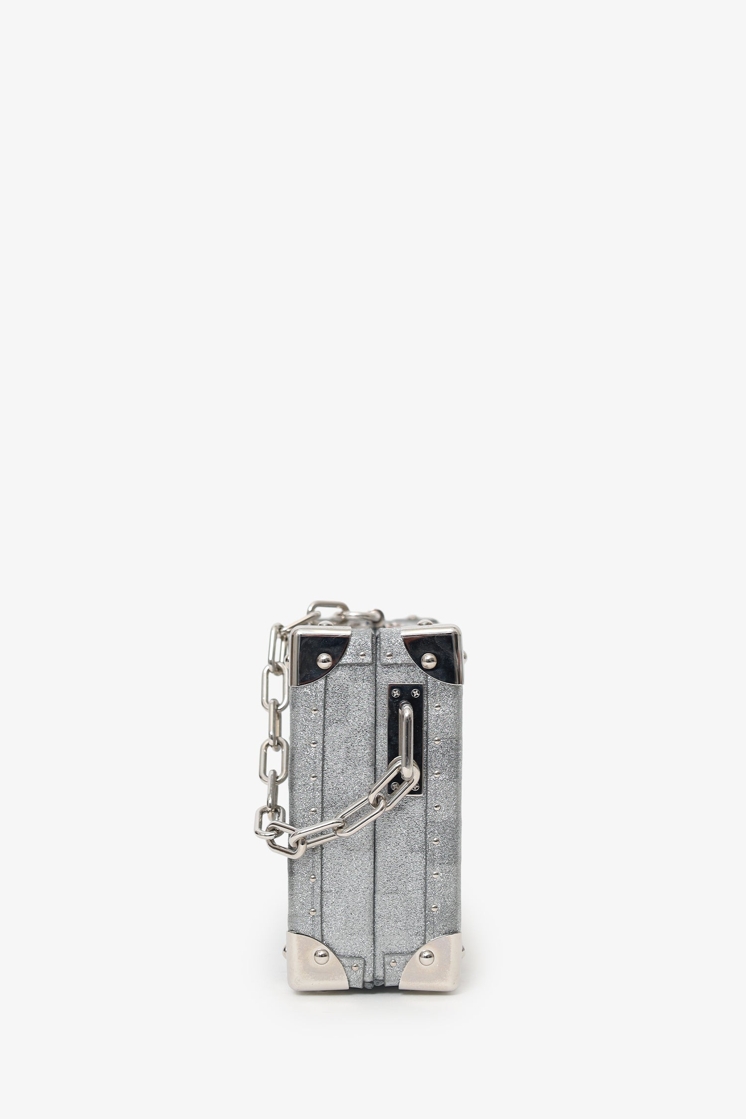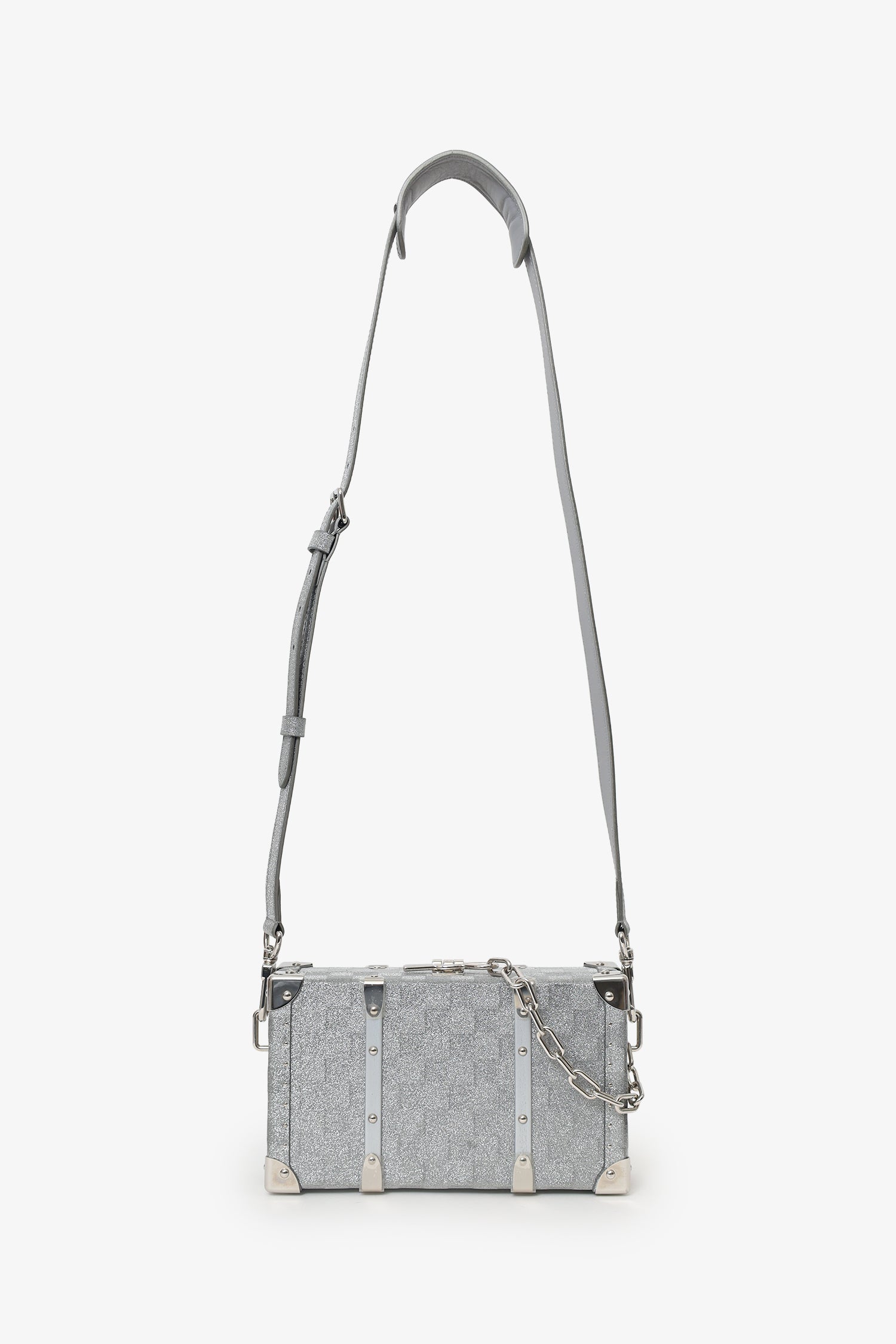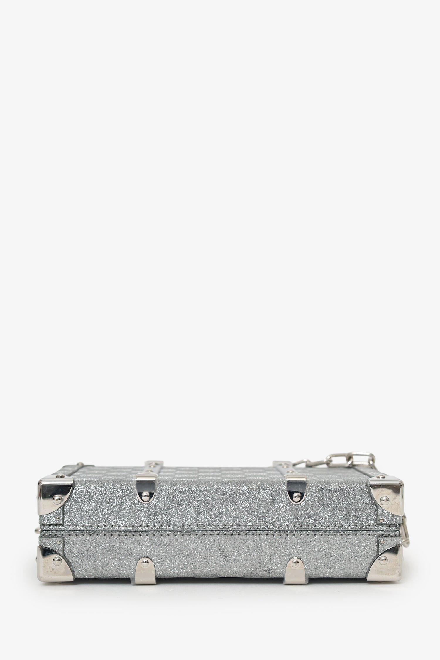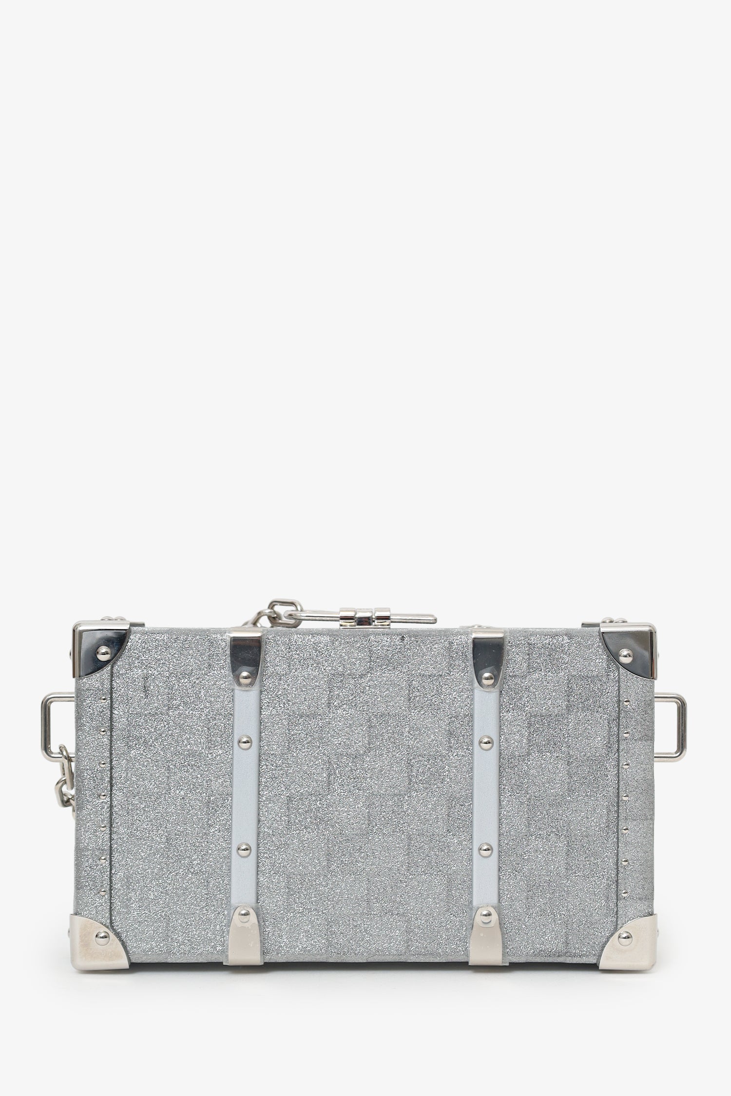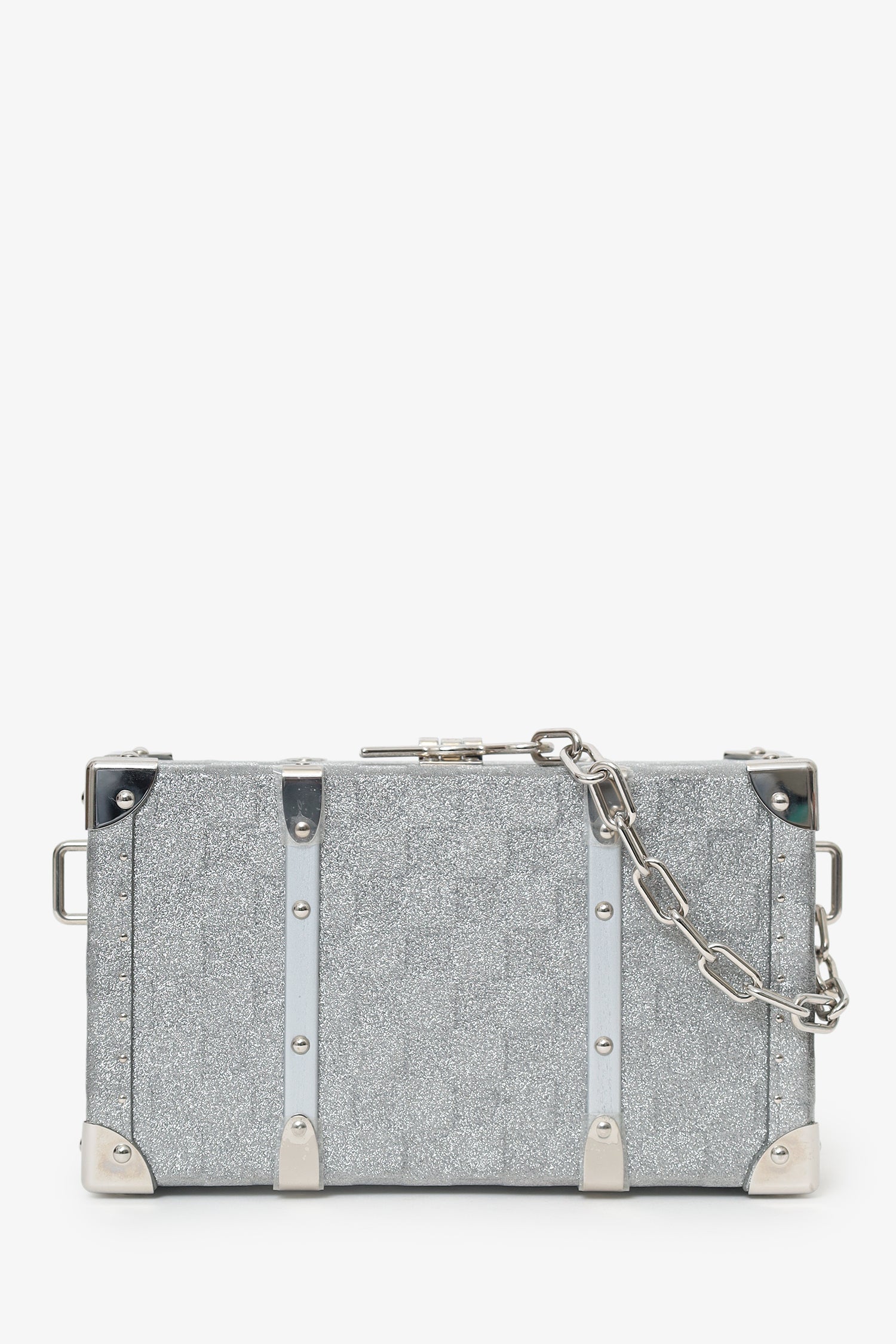 Refresh availabilityLouis Vuitton Silver Glitter Aluminum Monogram Special Order Briefcase Trunk With Strap. Top pull-lock closure. Adjustable and removable crossbody strap with clasp closure. Lined interior with 9 pockets; 6 card slots, and 3 slip. Removable bag tag. Silver-tone hardware. Tonal stitching.