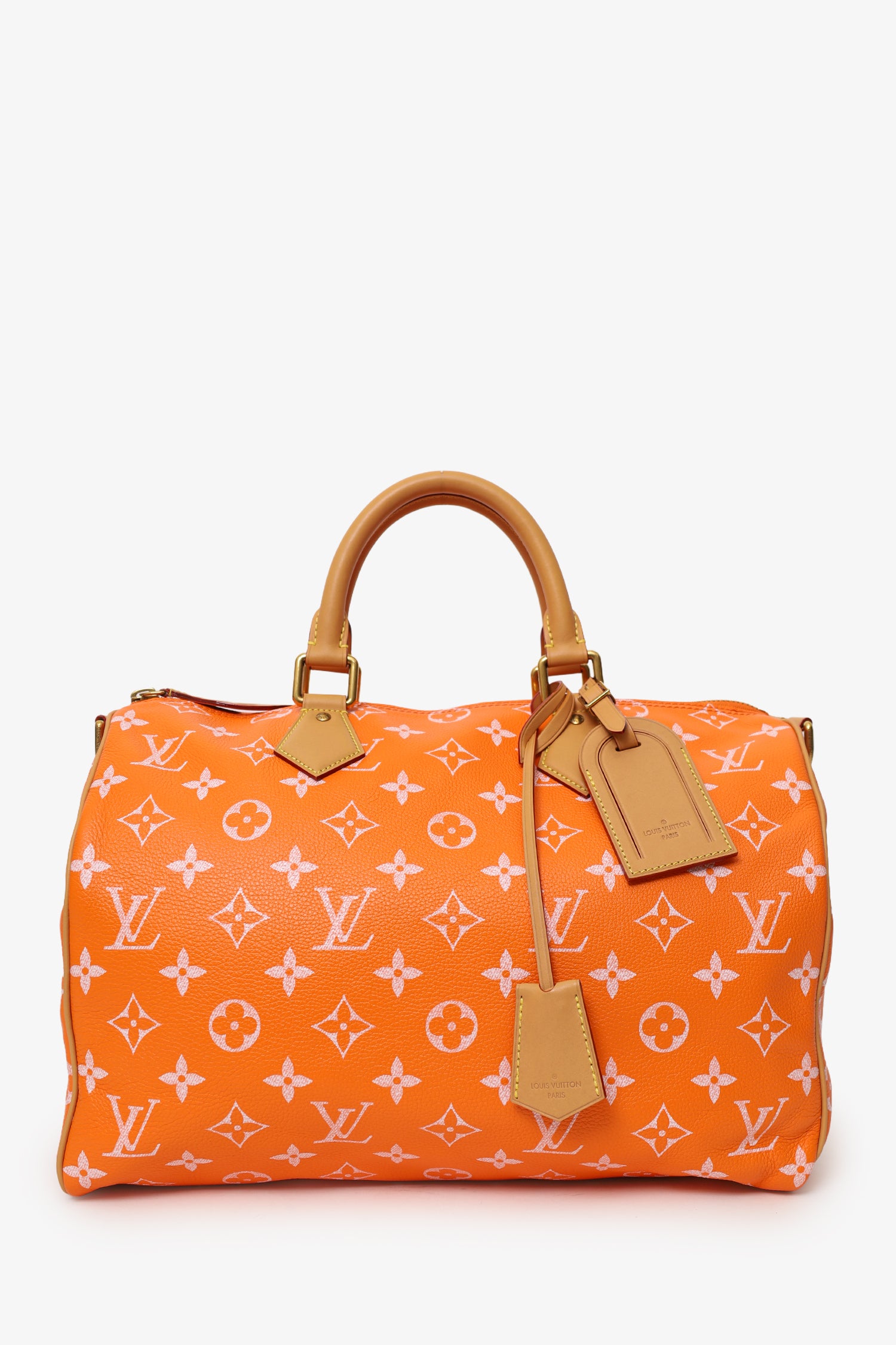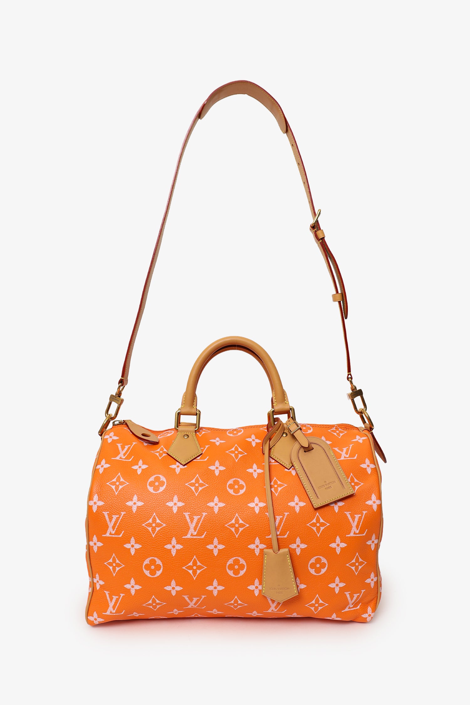 Louis Vuitton VIA Orange Monogram Leather Speedy P9 Bandouliere 40 (Limited Edition 140). Top zip closure. Twin top handles. Removable crossbody strap with adjustable pull-through buckle closure. Leather-lined interior with 3 pockets; 2 slip, and 1 zip. Additional zip pouch with clasp attachment. 2 additional and removable bag tags. Additional LV lock and key. Additional bag insert. Gold-tone hardware. Contrast and tonal stitching.