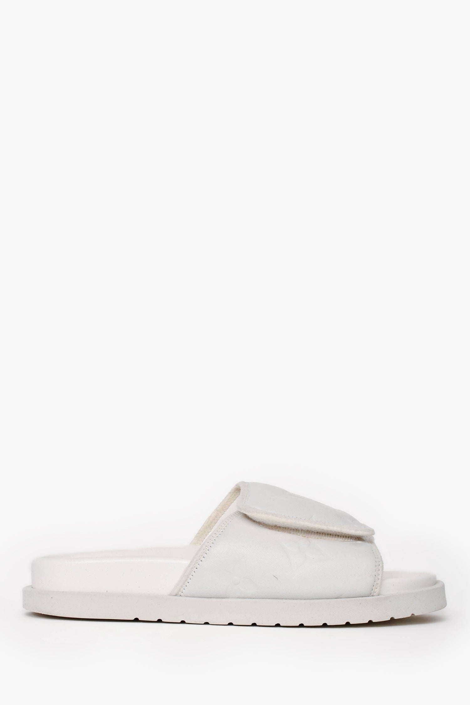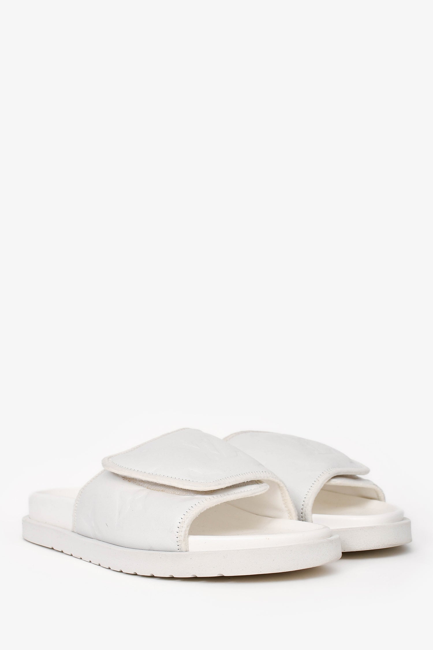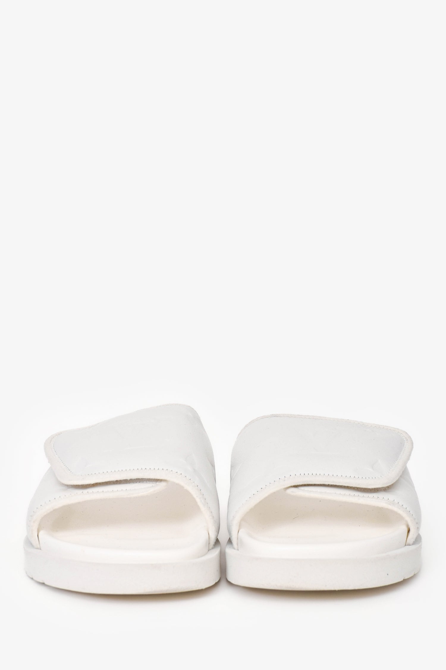 Refresh availabilityLouis Vuitton White Rubber/Leather Miami Slides. Adjustable velcro on the top. Tonal stitching.