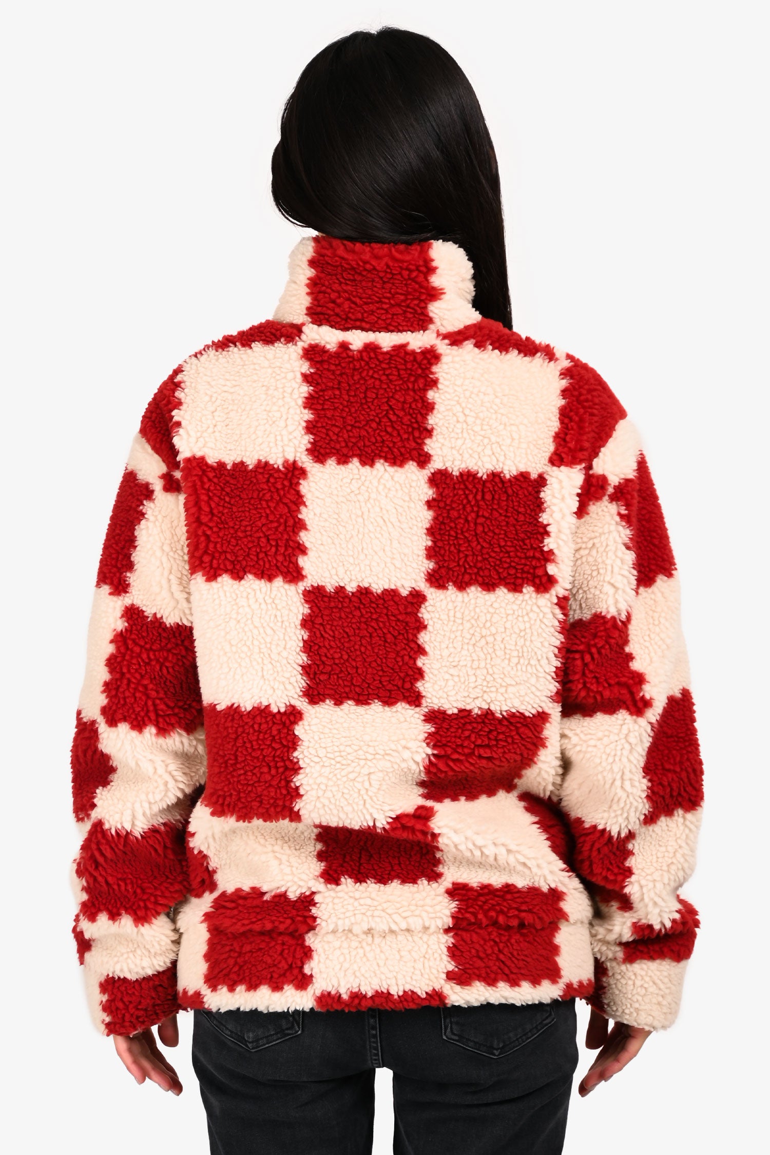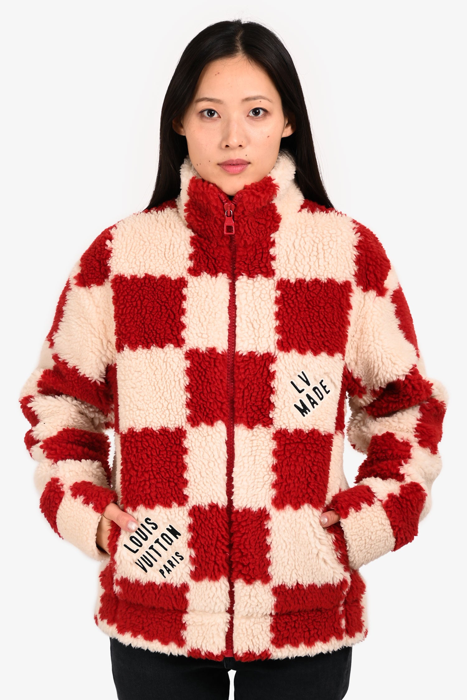 Refresh availabilityLouis Vuitton x Nigo 2022 Cream/Brick Red Checkered Fleece Zip-Up Jacket. Mock neckline. Front zip closure. Two front slip pockets. Lined. Tonal stitching.