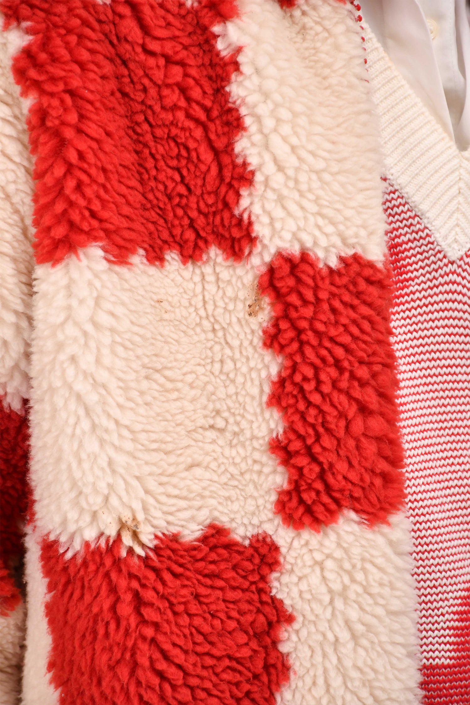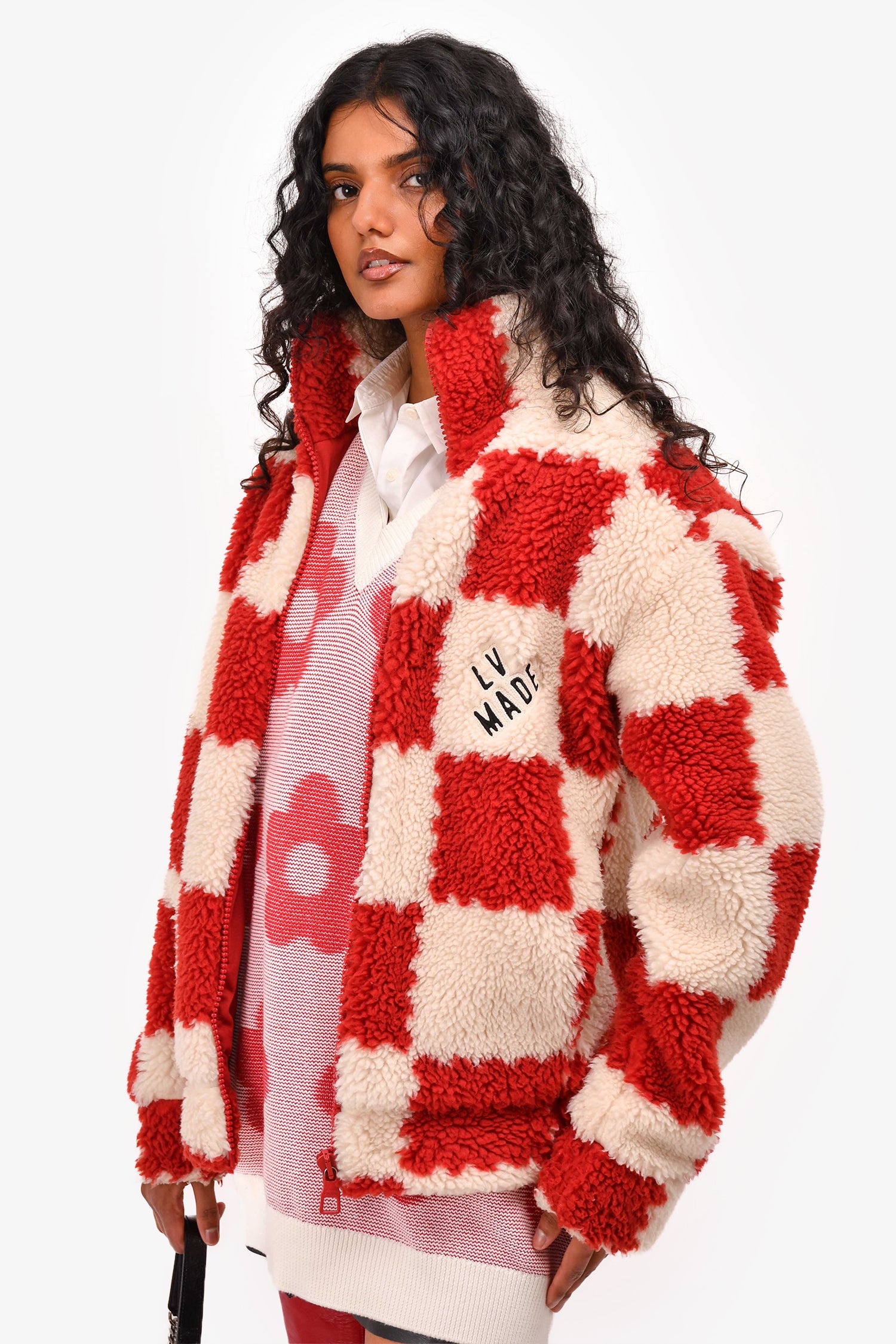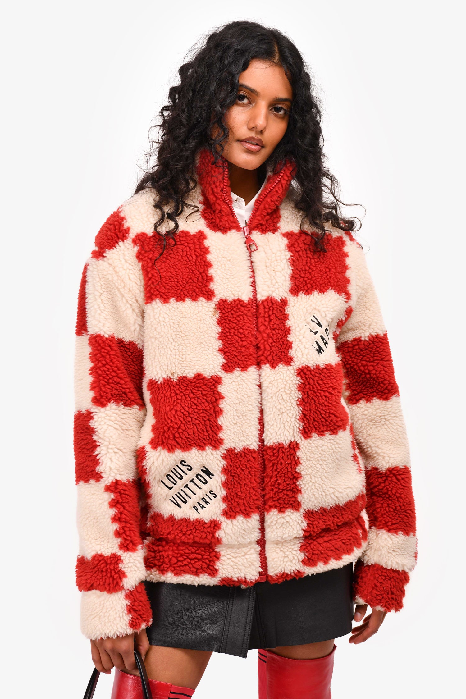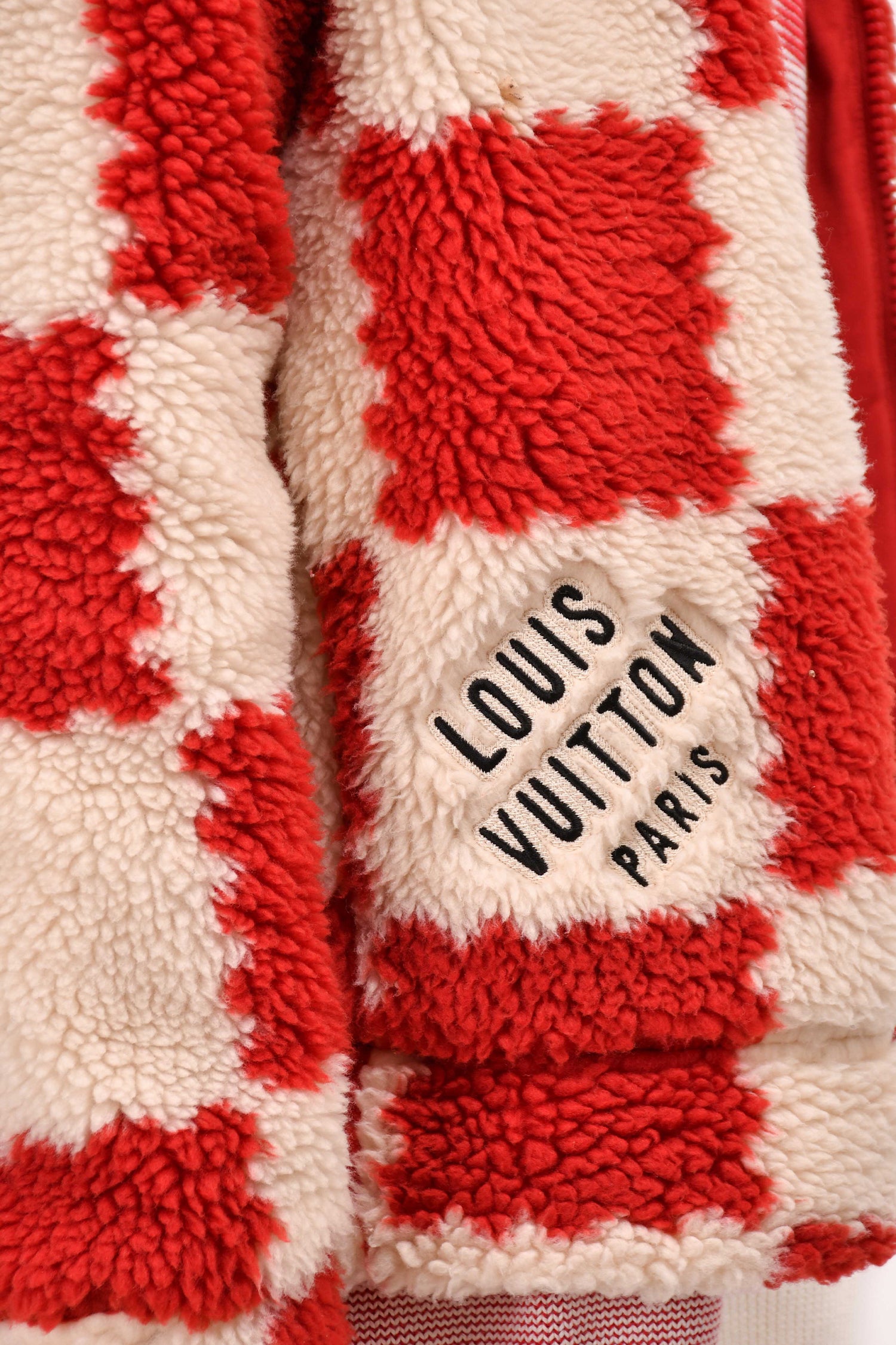Refresh availabilityLouis Vuitton x Nigo 2022 Cream/Brick Red Checkered Fleece Zip-Up Jacket. "LOUIS VUITTON PARIS" and "LV MADE" patches on front. Front zip closure. 2 hand pockets. Lined.