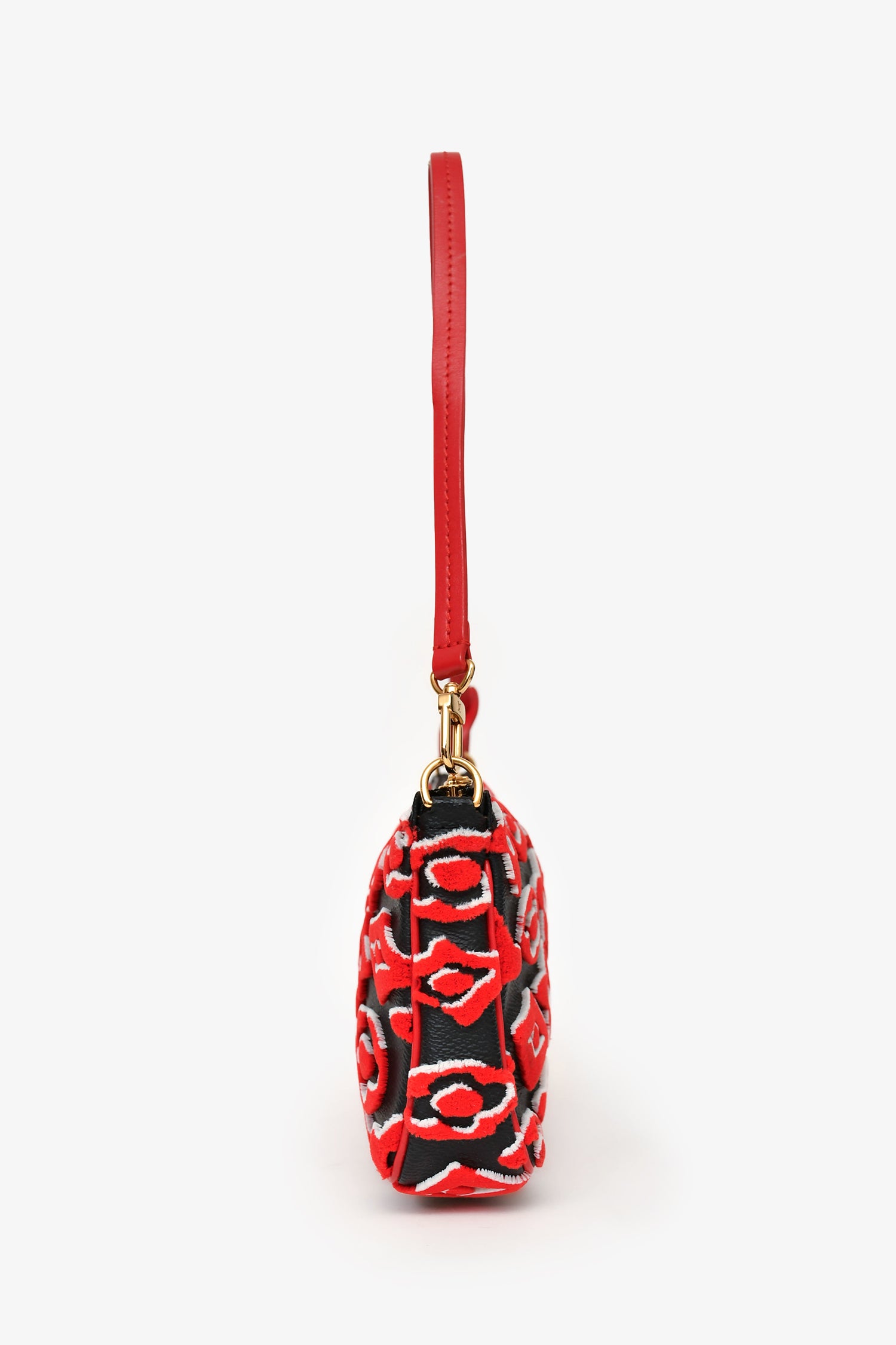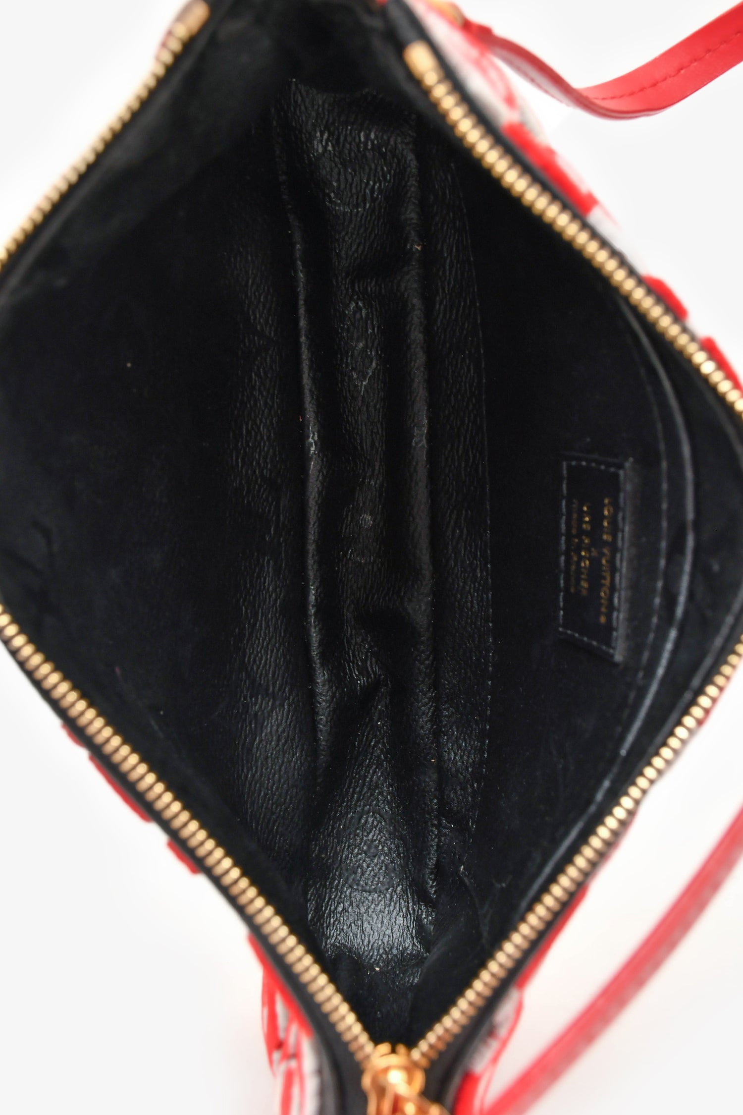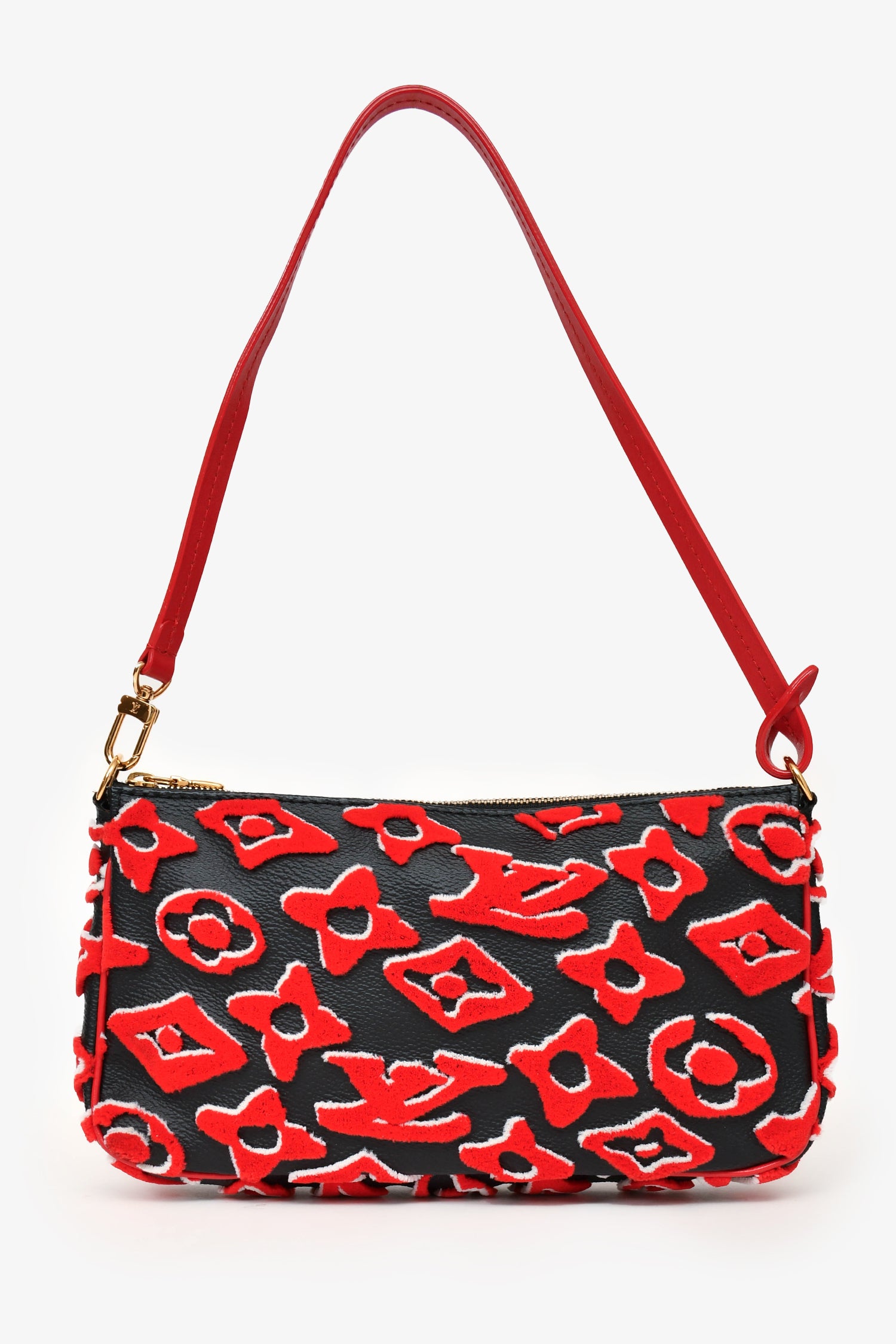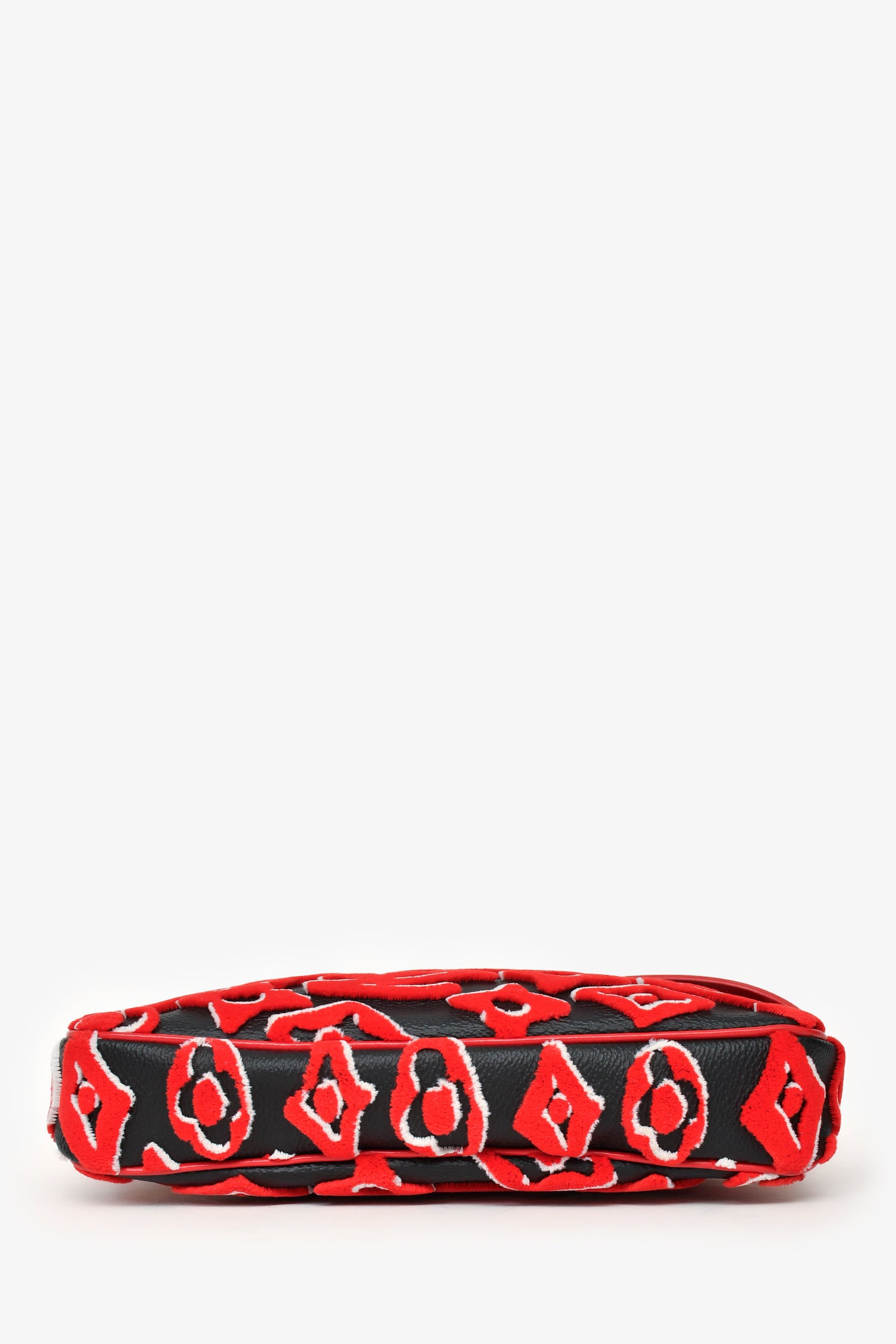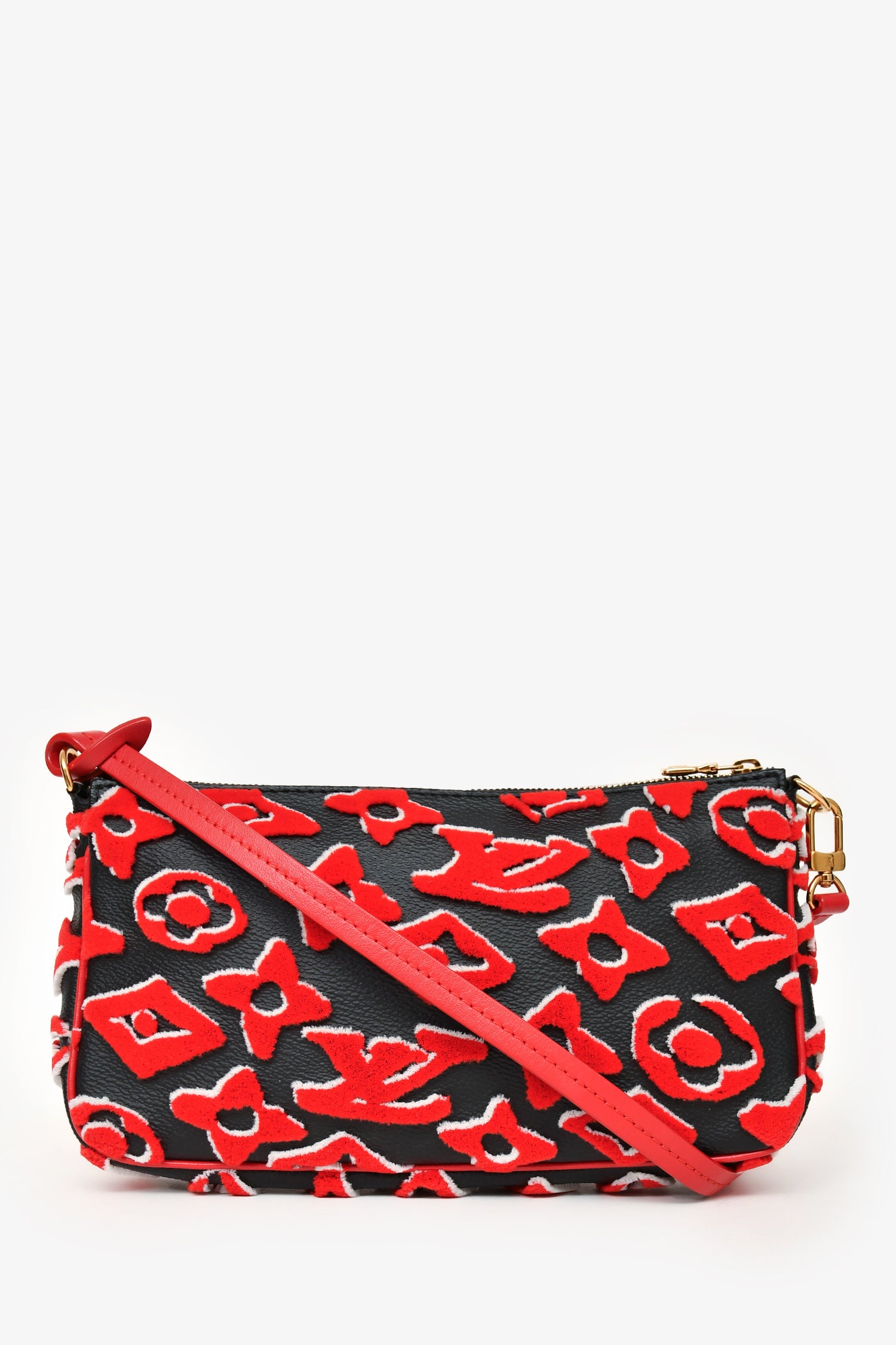 Refresh availabilityLouis Vuitton x Urs Fischer 2020 Black Leather Red Tufted Monogram Pochette. Top zip closure. One single shoulder strap. Single compartment with slip pocket. Gold-tone hardware.