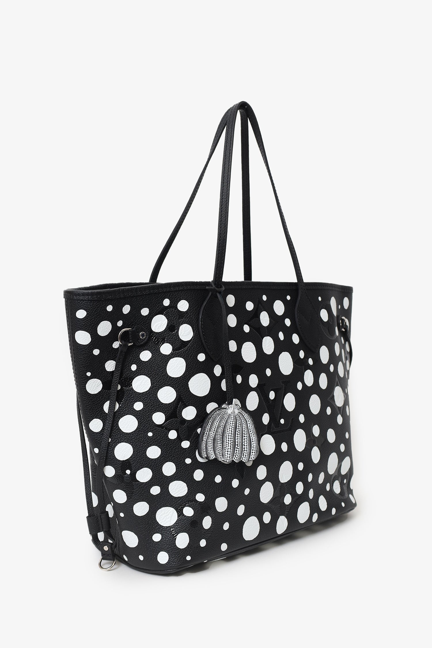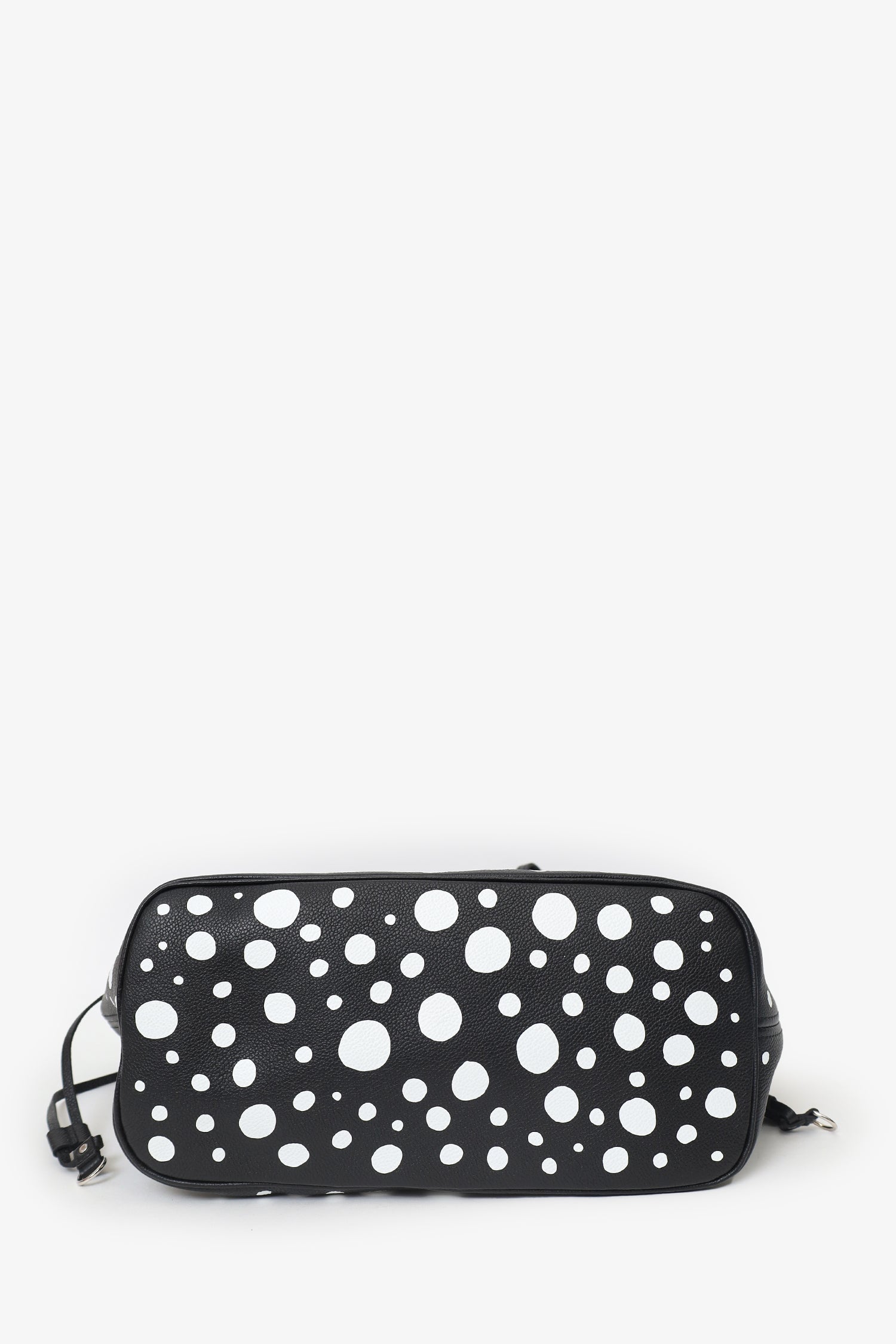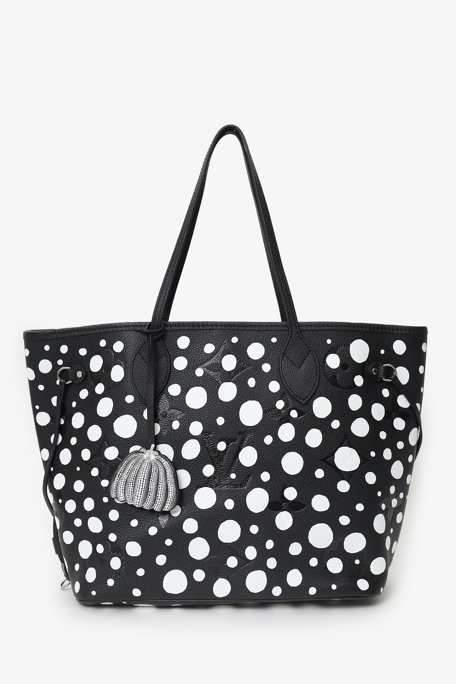 Refresh availabilityLouis Vuitton x Yayoi Kusama 2023 Black/White Monogram Empreinte Dots Neverfull with Pouch MM. Open top with interior clasp closure. Twin shoulder straps. Twin exterior side straps. Lined interior with single zip pocket. Additional detachable zip pouch. Removable bag tag. Silver-tone hardware. Tonal stitching.