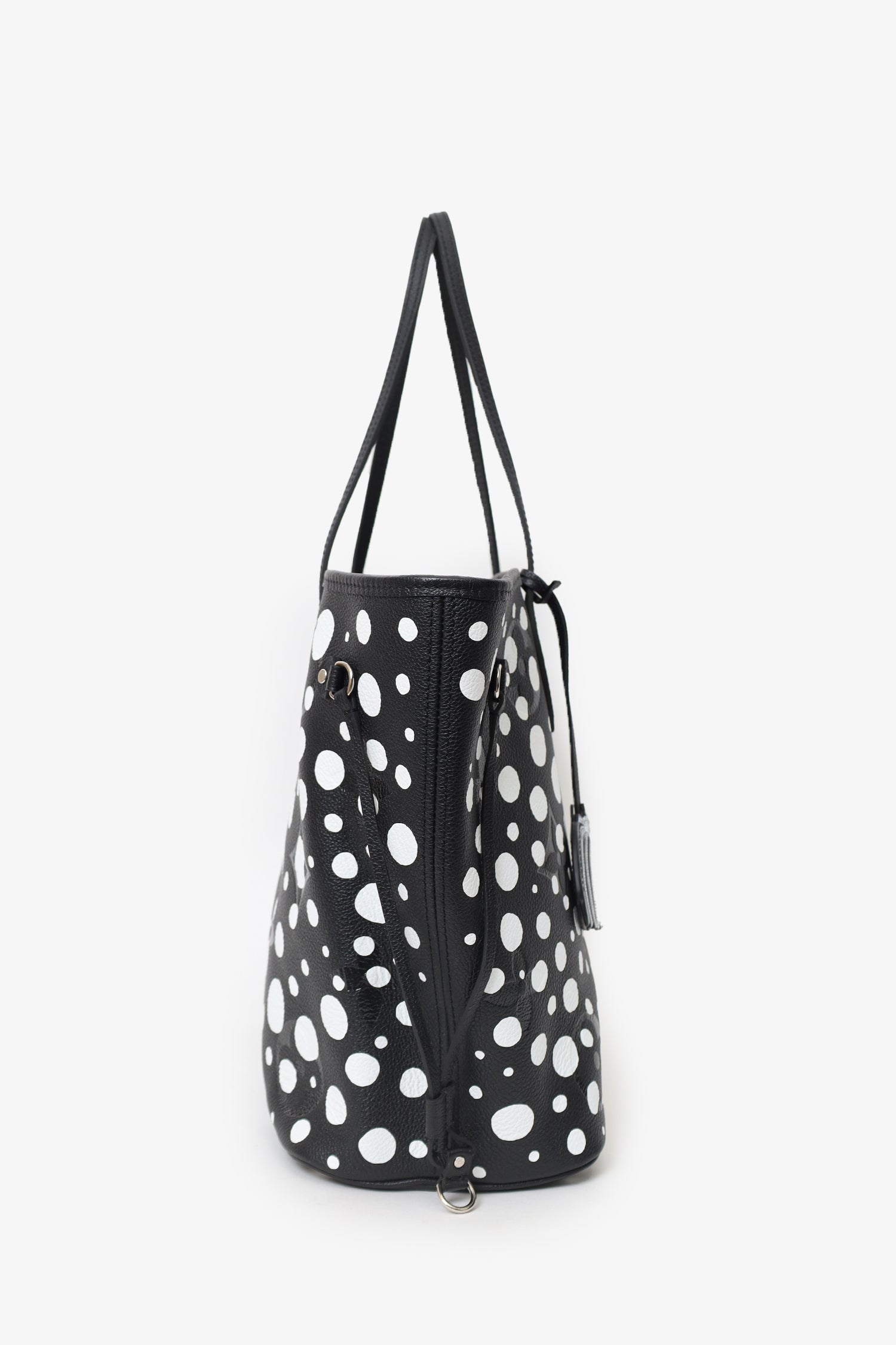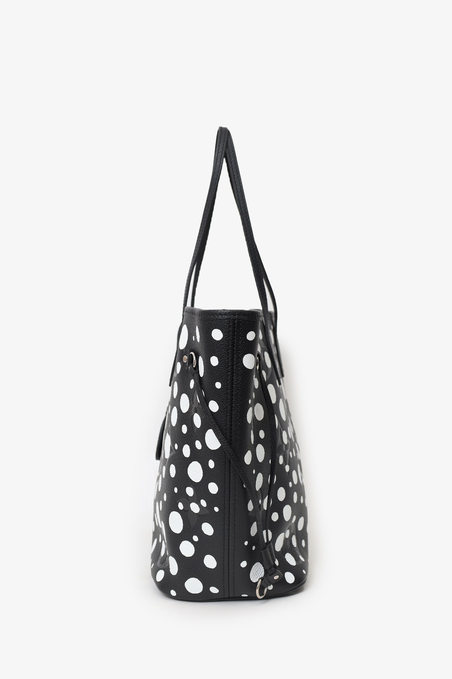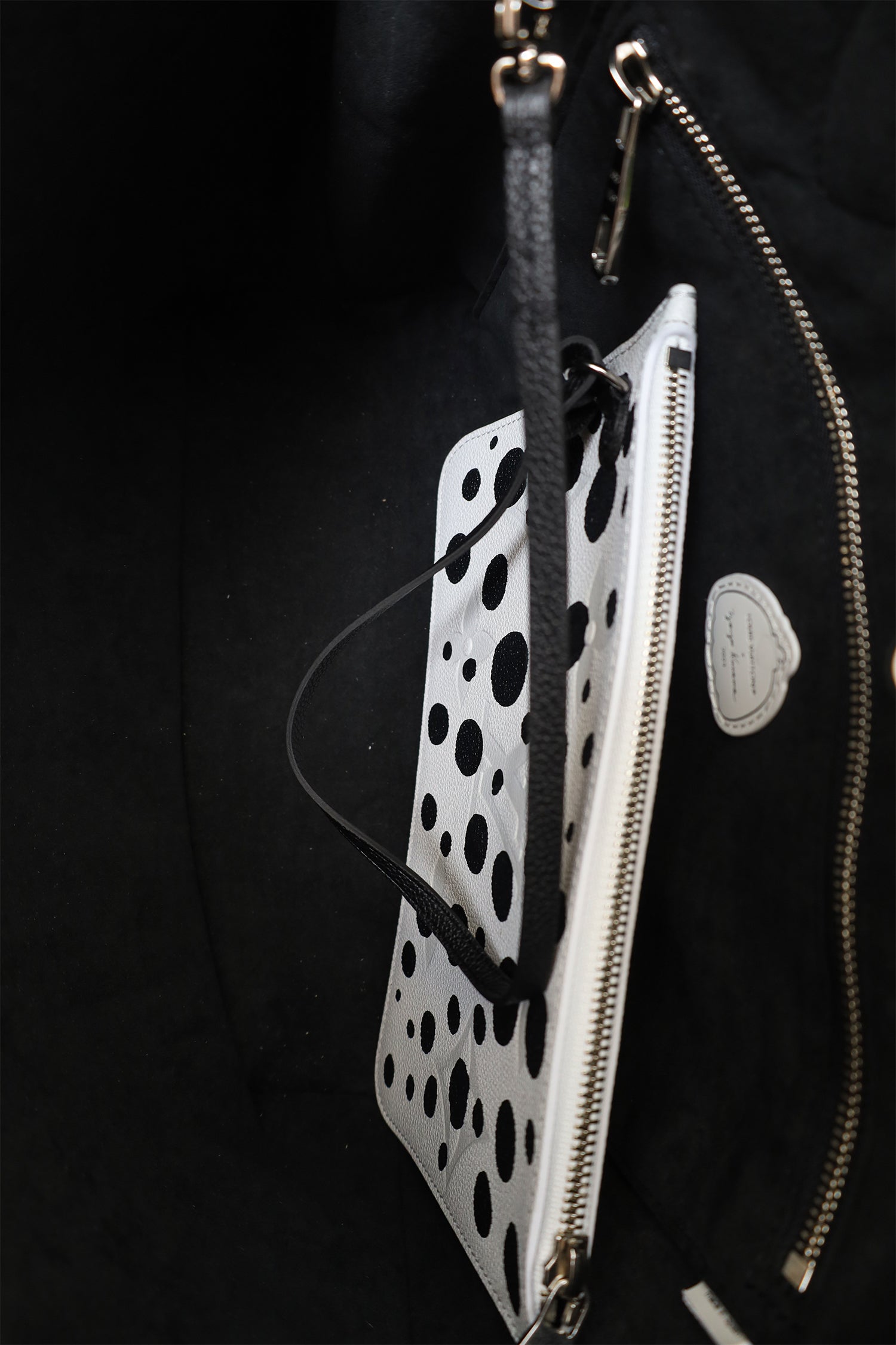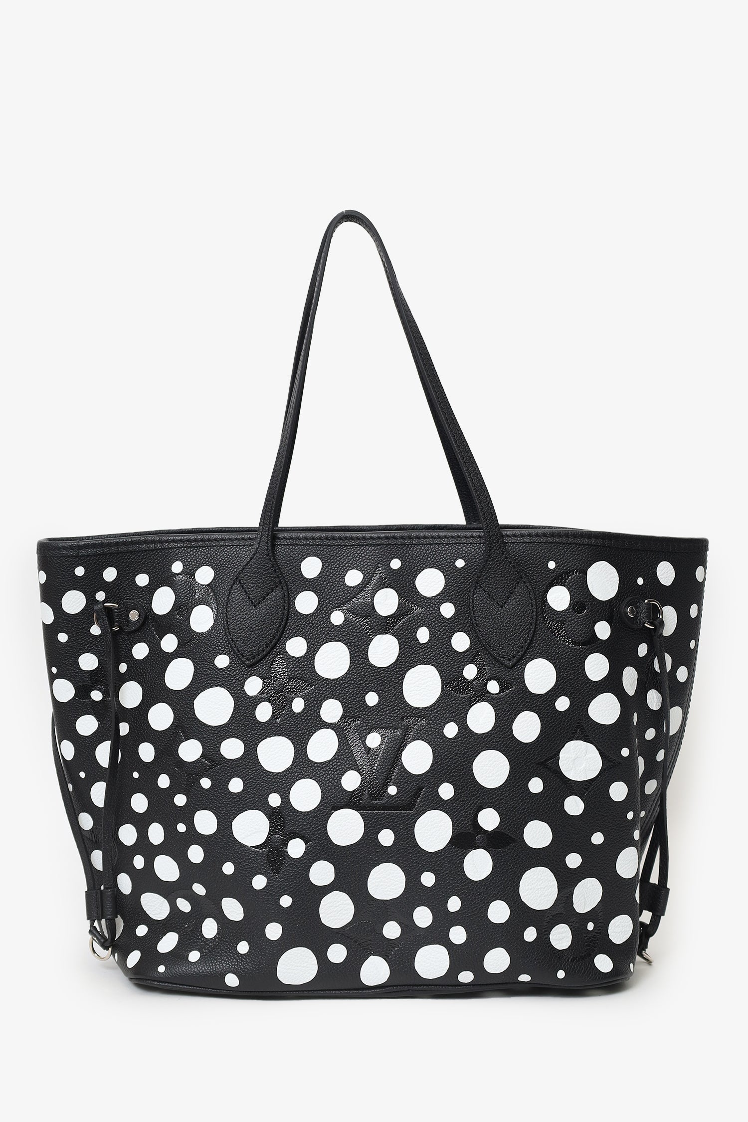 Refresh availabilityLouis Vuitton x Yayoi Kusama 2023 Black/White Monogram Empreinte Dots Neverfull with Pouch MM. Open top with interior clasp closure. Twin shoulder straps. Twin exterior side straps. Lined interior with single zip pocket. Additional detachable zip pouch. Removable bag tag. Silver-tone hardware. Tonal stitching.