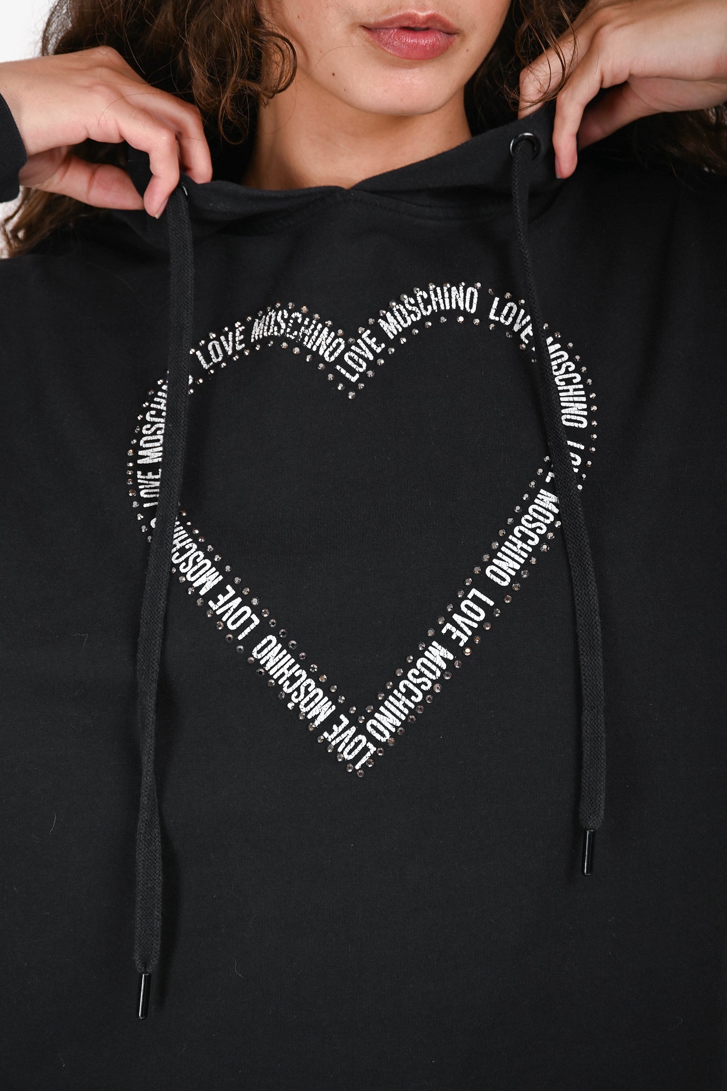 Refresh availabilityLove Moschino Black Heart Shape Logo Print Hoodie Dress. Pull-on. Drawstring on the neckline. Elasticized cuffs. Lined interior. Silver-tone hardware. Tonal stitching.