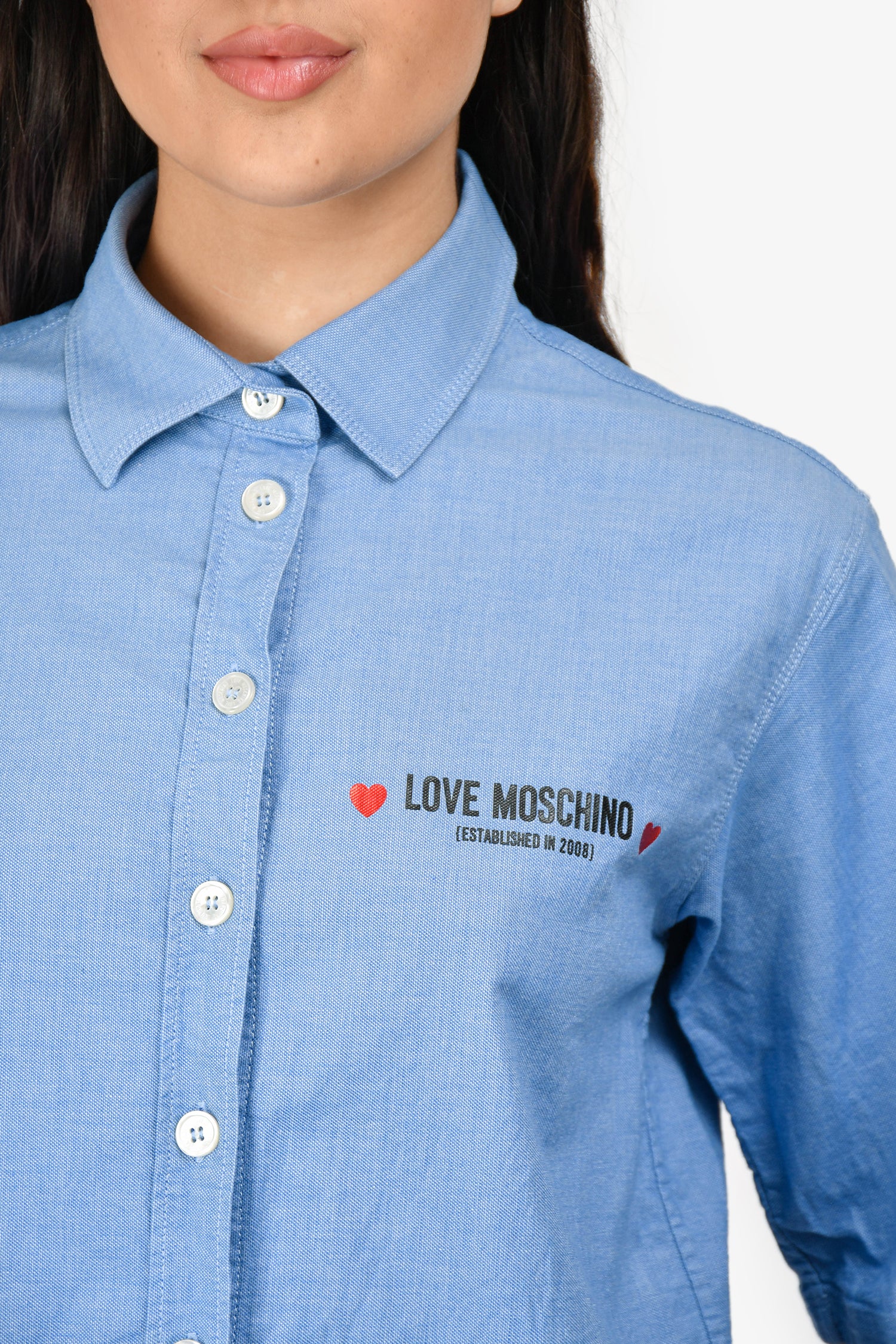 Refresh availabilityLove Moschino Blue Denim Logo Embroidered 3/4 Sleeve Button Up Shirt. Front button-up closure. Unlined. Tonal stitching.