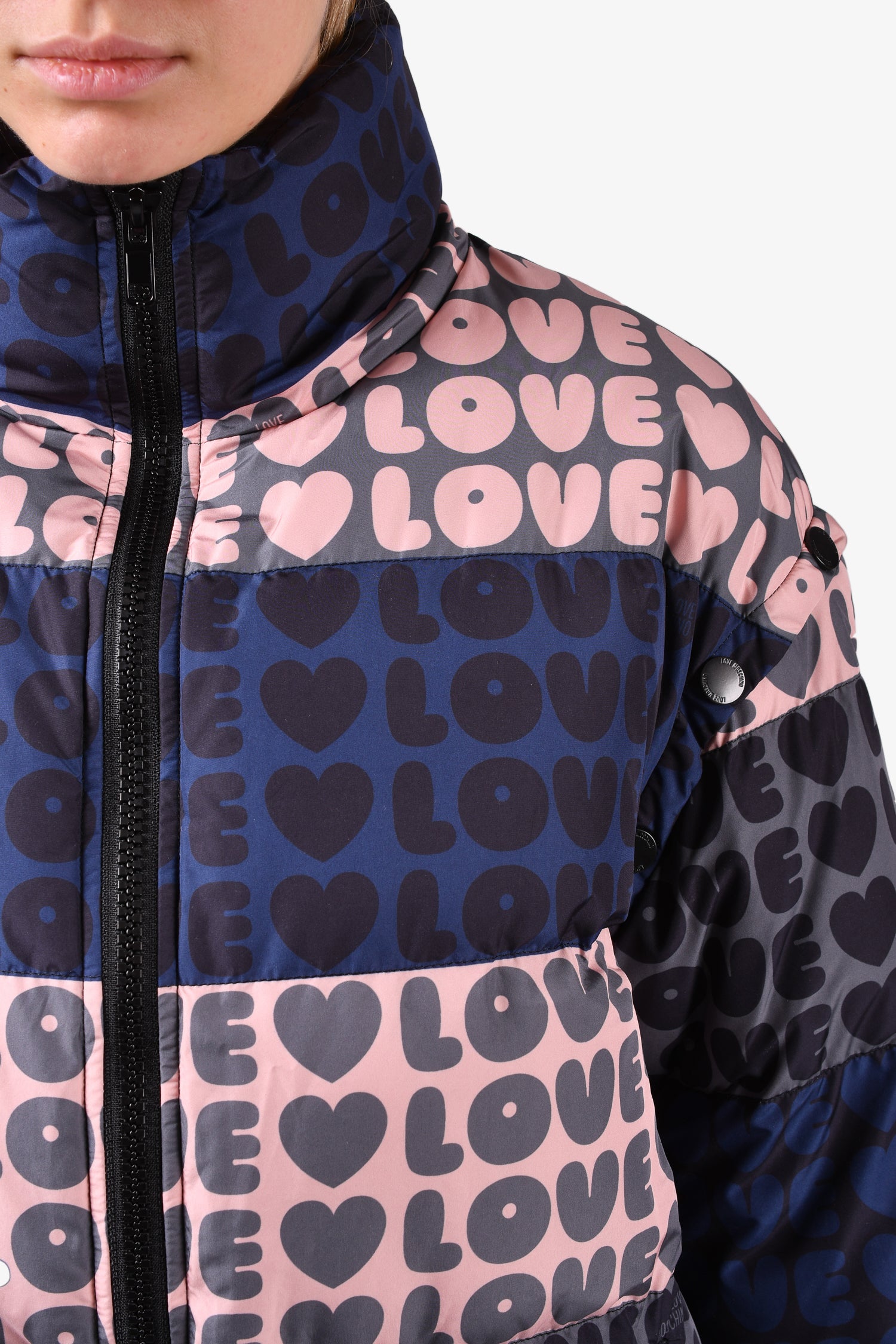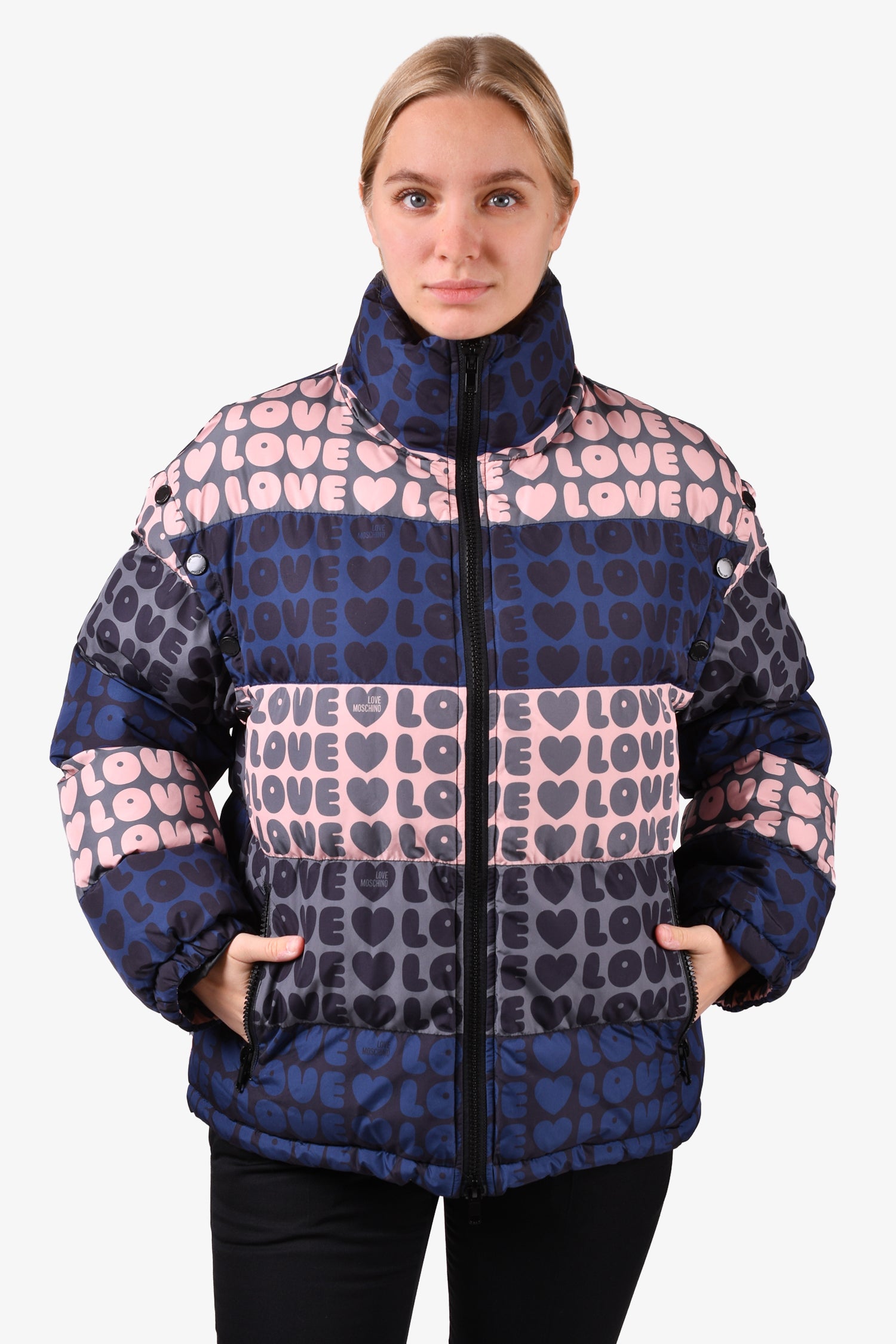 Refresh availabilityLove Moschino Purple/Pink 'Love' Printed Puffer Jacket. Front two-way zip closure. Front zip pockets. Lined. Tonal stitching.