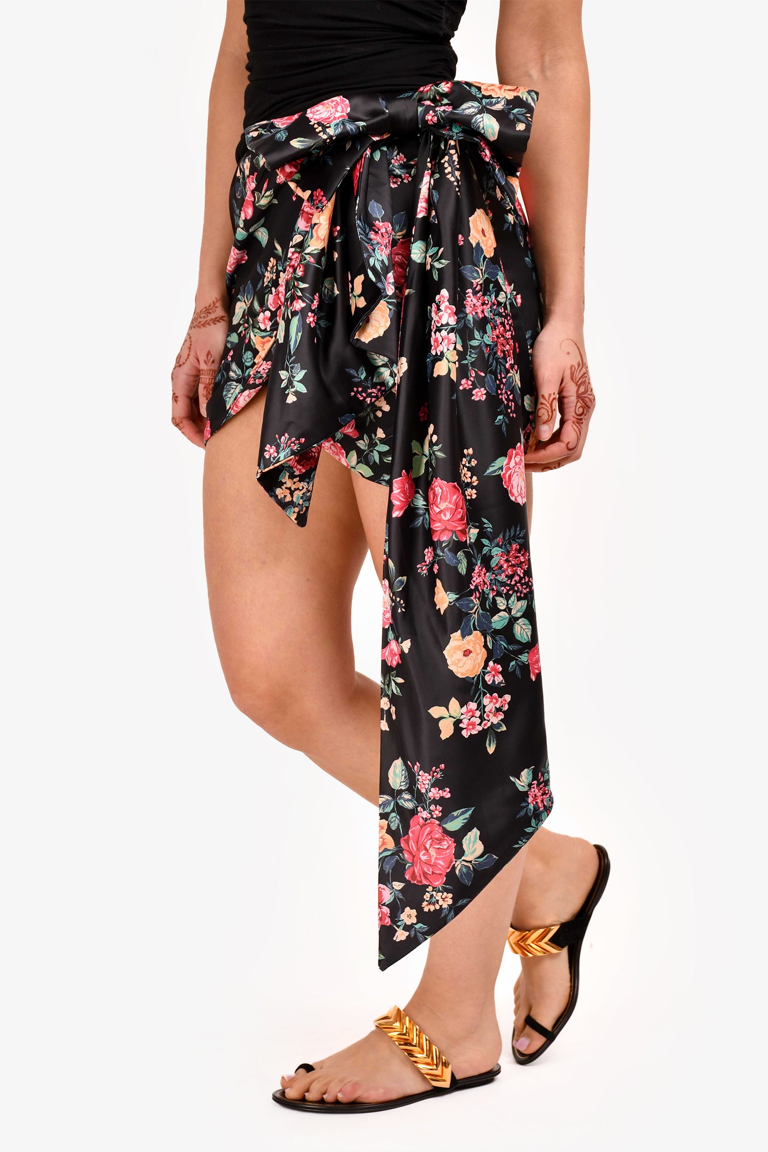 Refresh availabilityLovers + Friends Black Floral Asymmetrical Skirt. Back zip-up closure. Tonal fabric bow detail on the side. Features a slit on the side. Fully lined. Tonal stitching.
