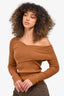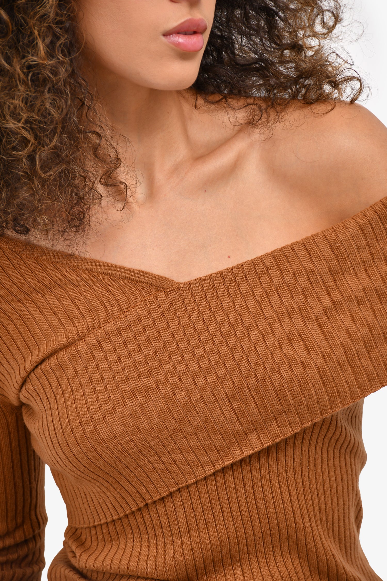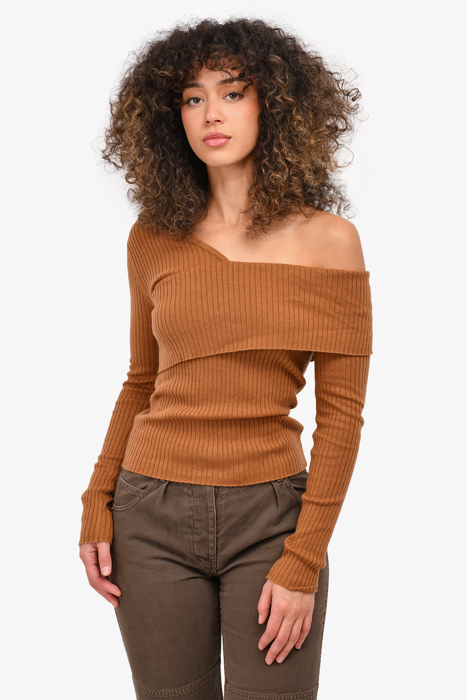 Refresh availabilityLovers + Friends Brown Ribbed Knit Booker Sweater. Pull on. Ribbed details throughout. Single off shoulder. Unlined. Tonal stitching.