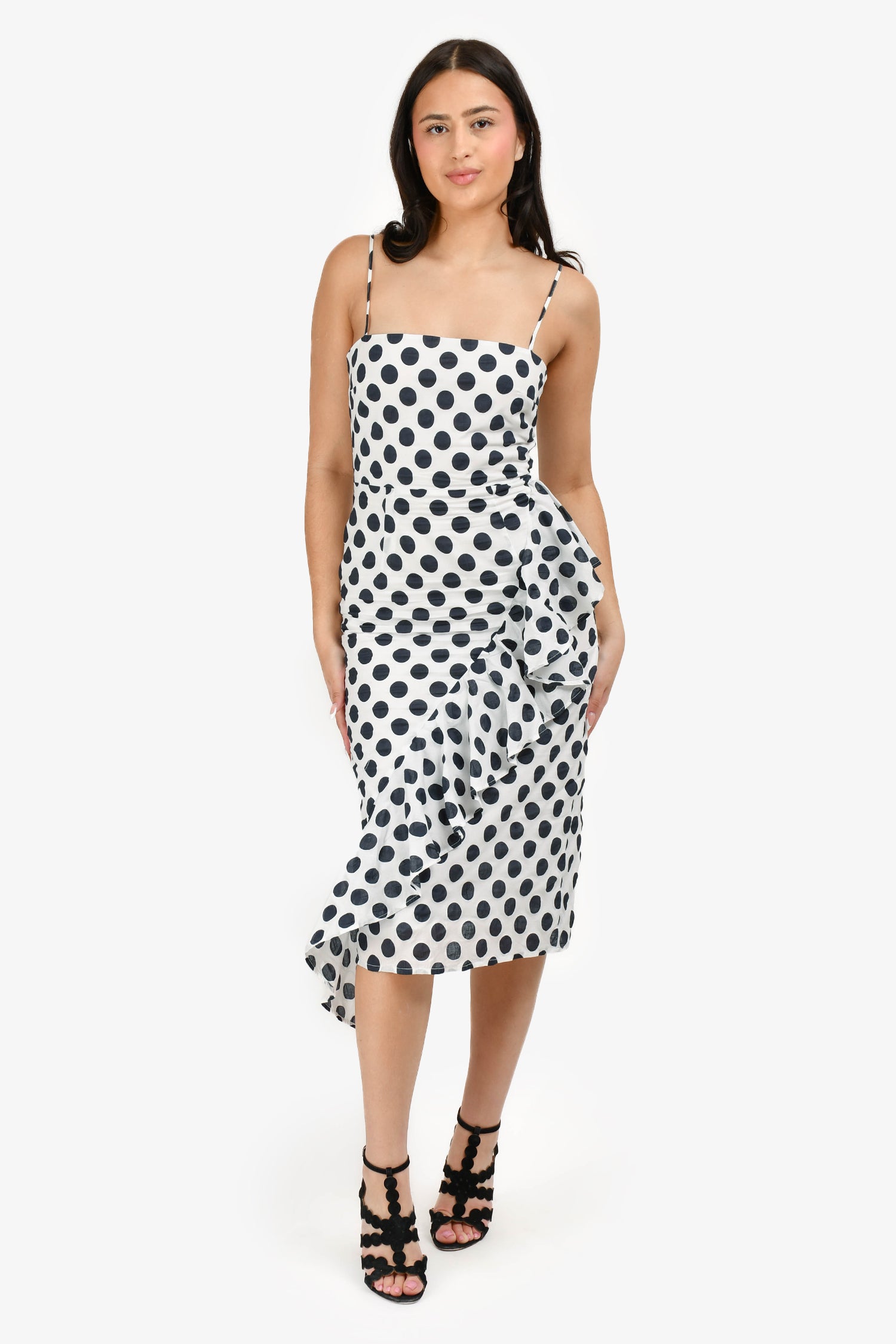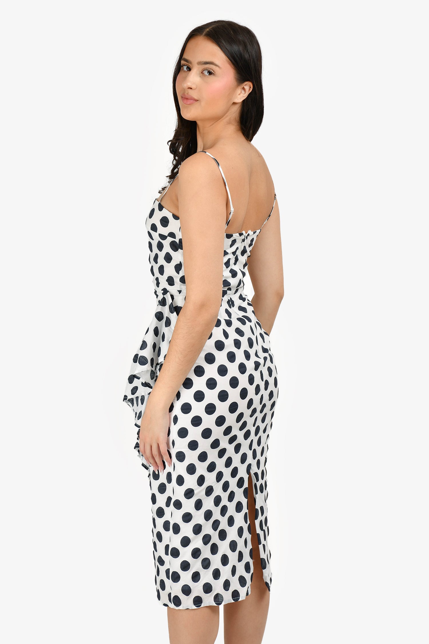 Refresh availabilityLovers + Friends White/Navy Polka Dot Sleeveless Ruffled Midi Dress. Adjustable thin shoulder straps. Back zip-up closure. Flowing fabric detail on the side. Features a small slit in the back. Lined. Tonal stitching.