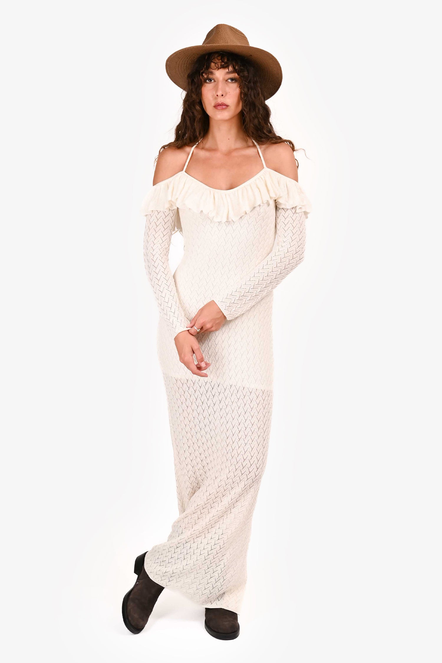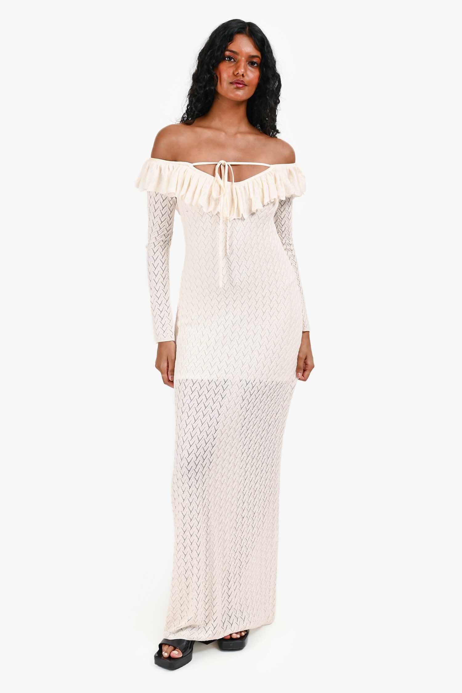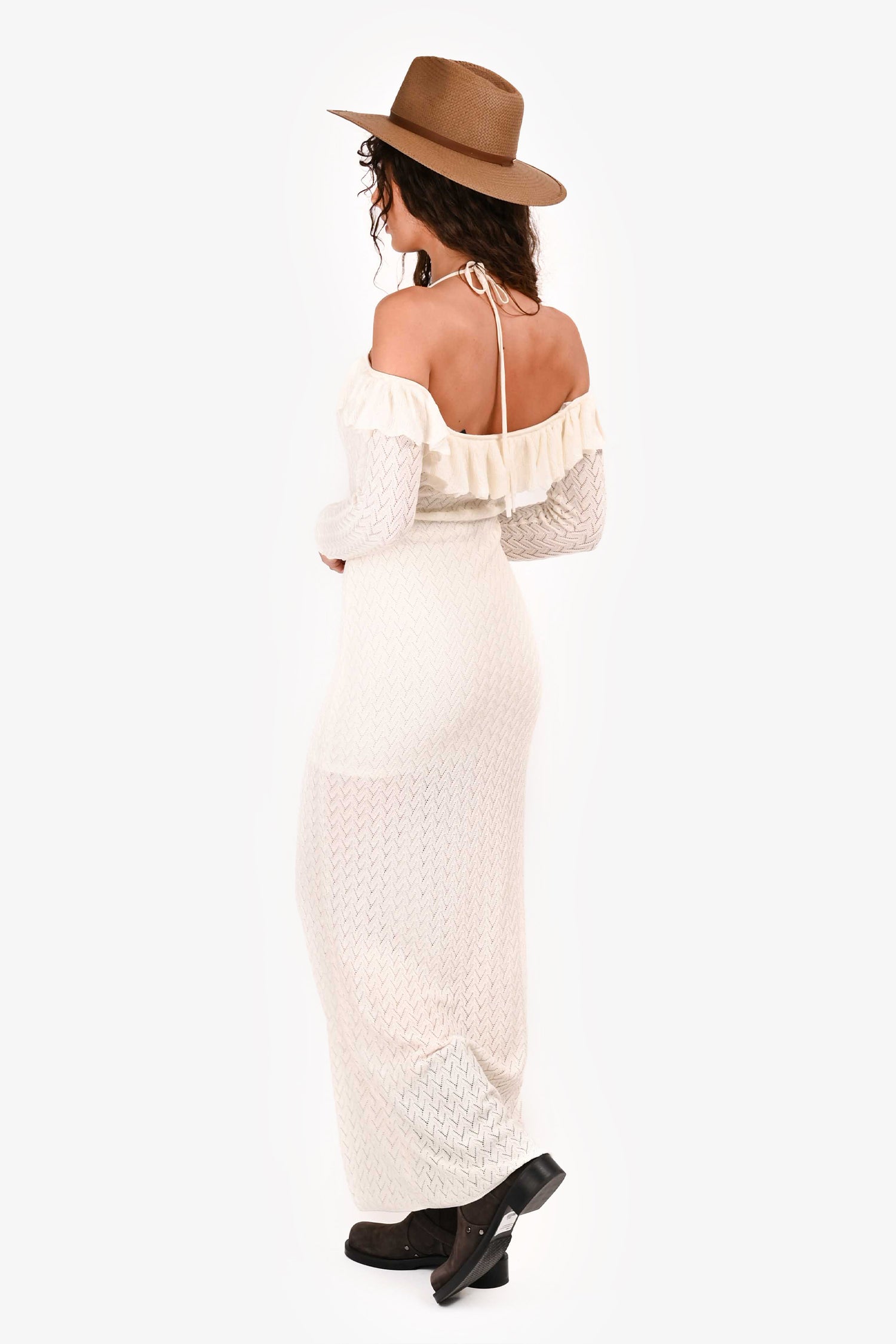 Refresh availabilityLPA White Knit Off The Shoulder Maxi Dress. Long sleeves. Pull-on style. Tie detail on the front. Partially lined. Tonal stitching.