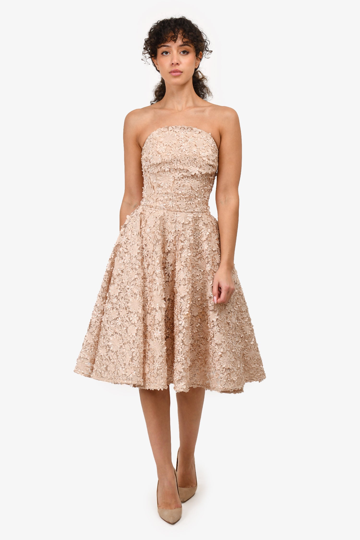 Refresh availabilityLucian Matis Pink Floral Appliqué Strapless Dress. Concealed back zipper. Floral applique overlay on mesh. Double lined interior with tulle filling. Tonal stitching.