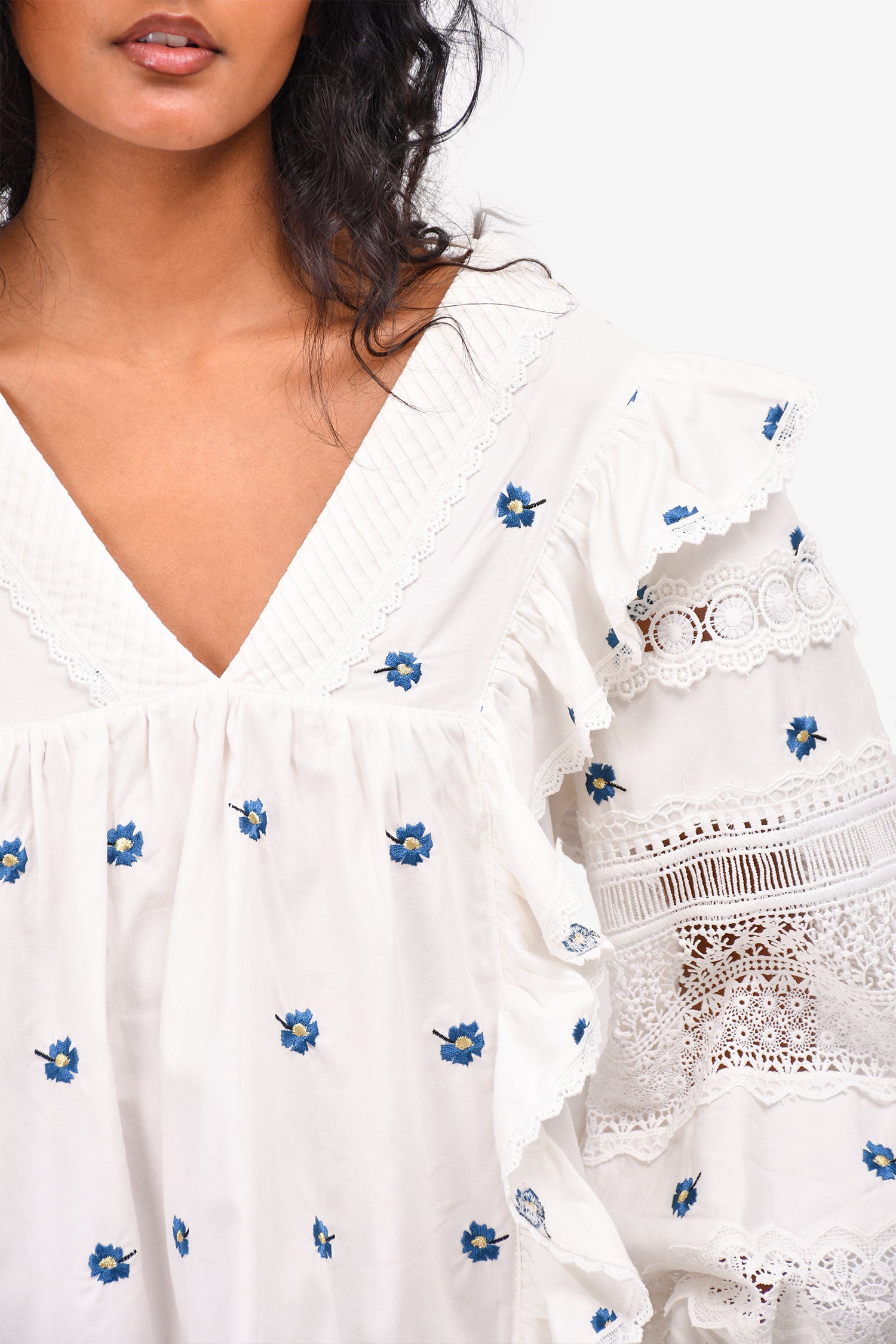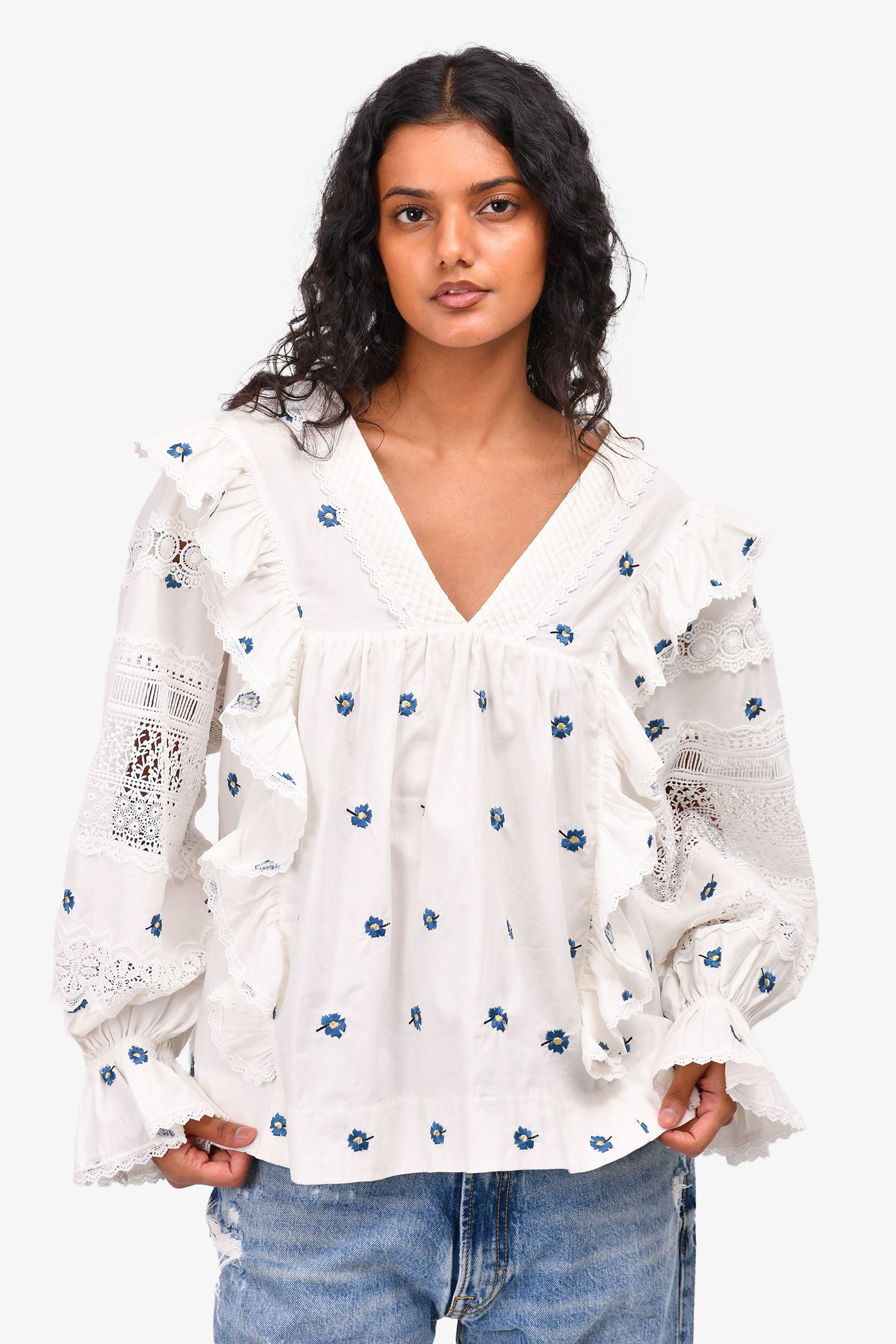 Lug Von Siga White/Blue Floral Embroidered 'Carla' Blouse Size 40