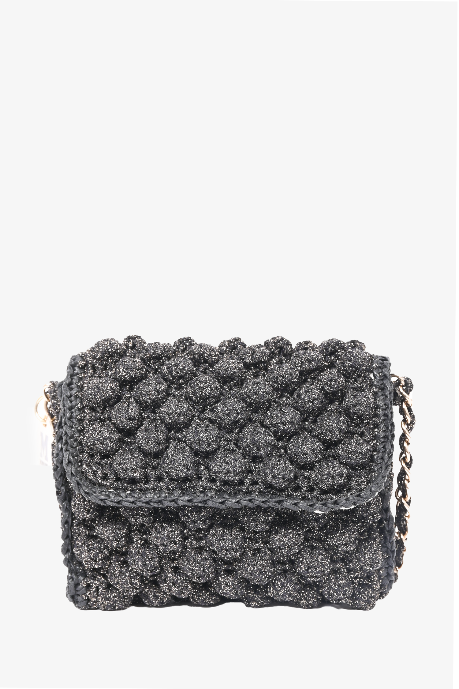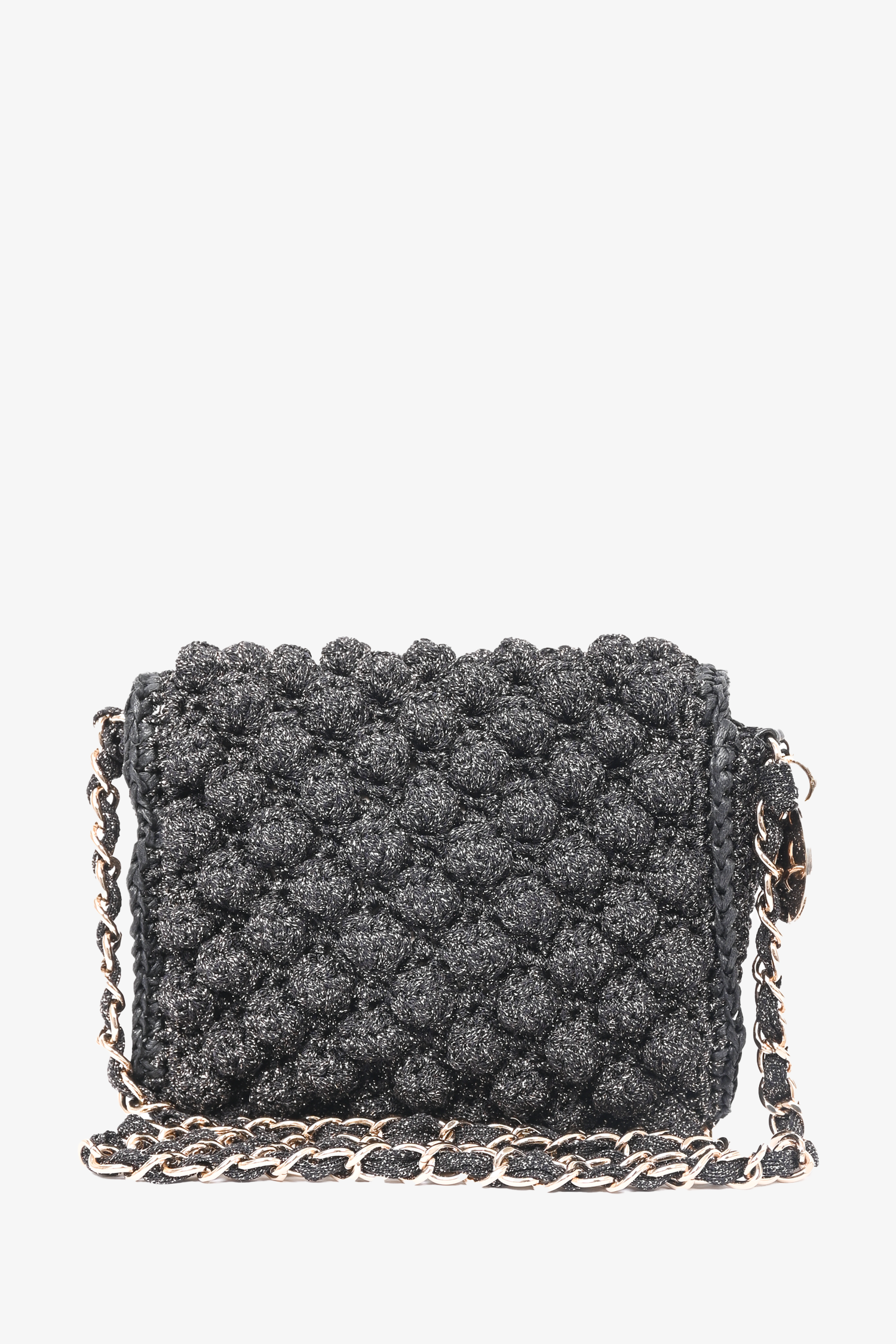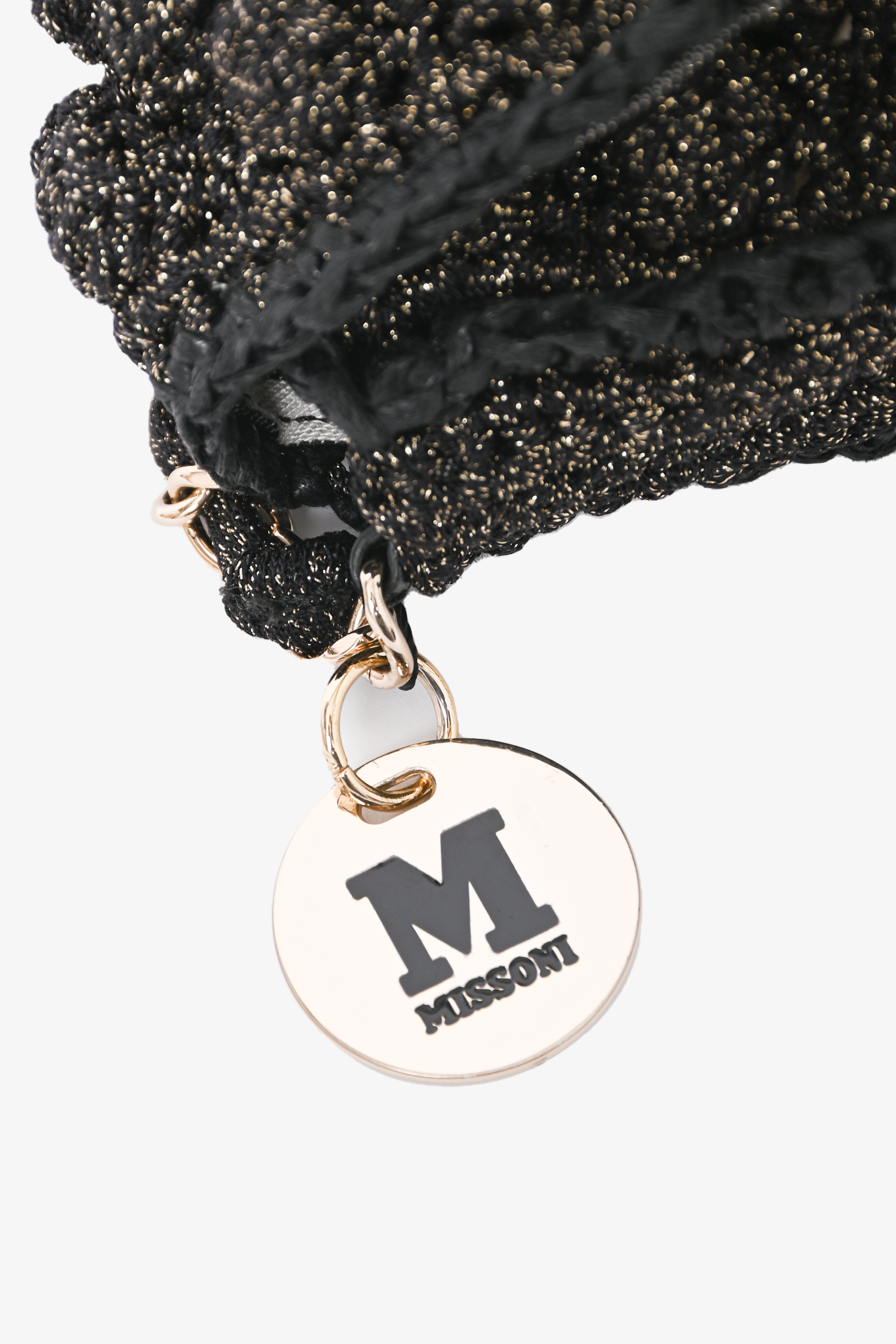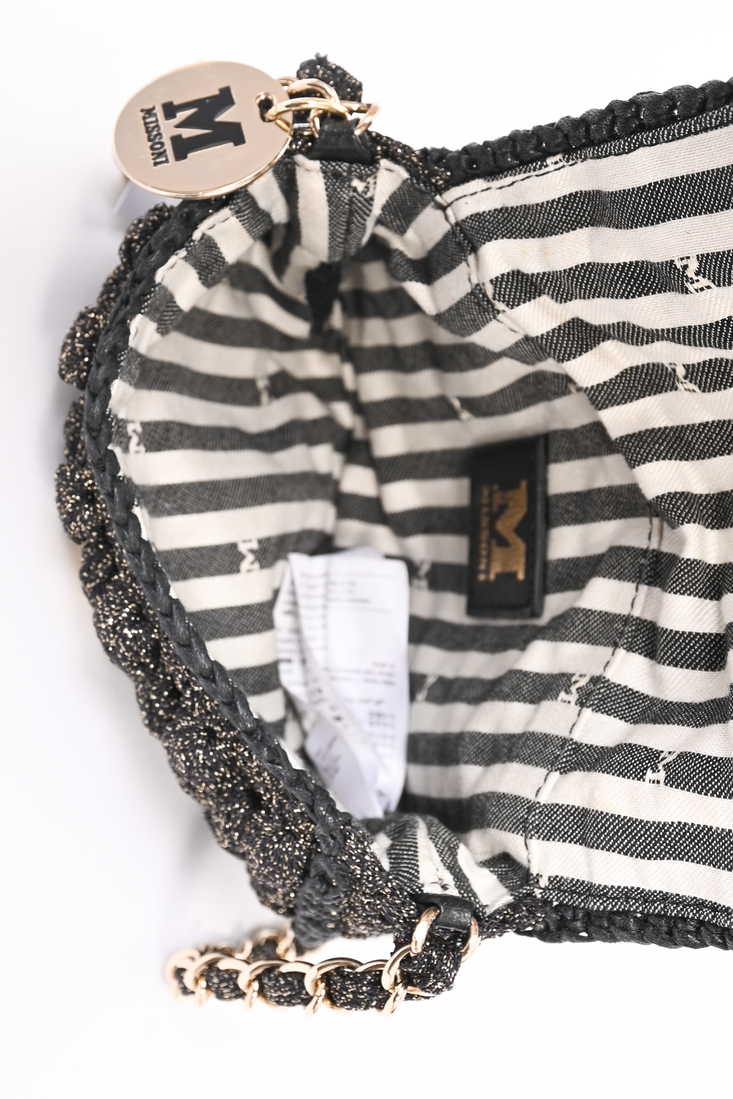 Refresh availabilityM Missoni Black/Gold Chain Crossbody Bag. Front fold-over flap with magnetic button closure. Striped textile interior lining. Open interior. Gold-tone hardware. Tonal stitching.