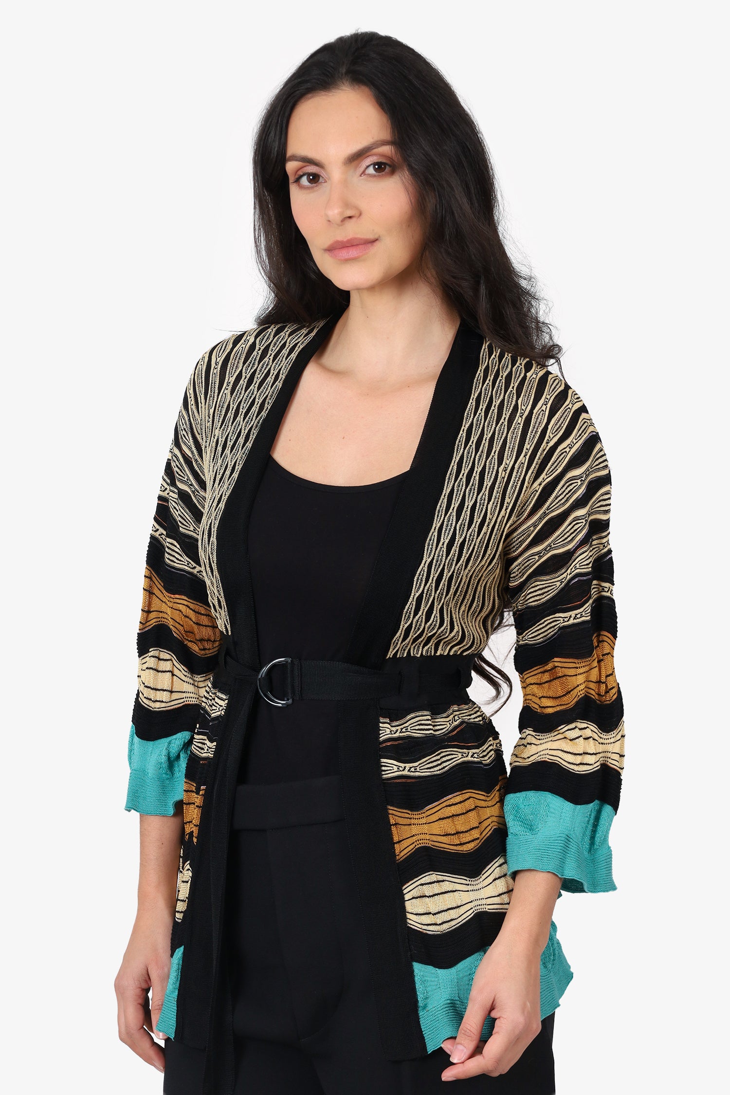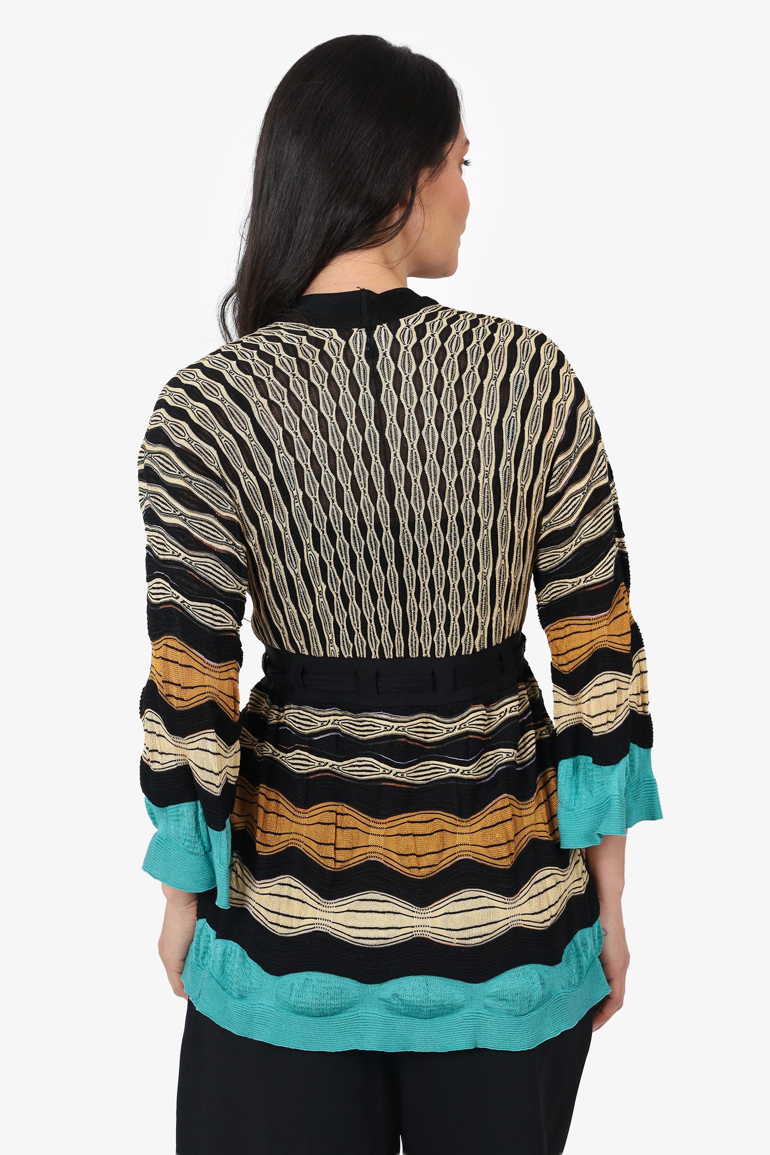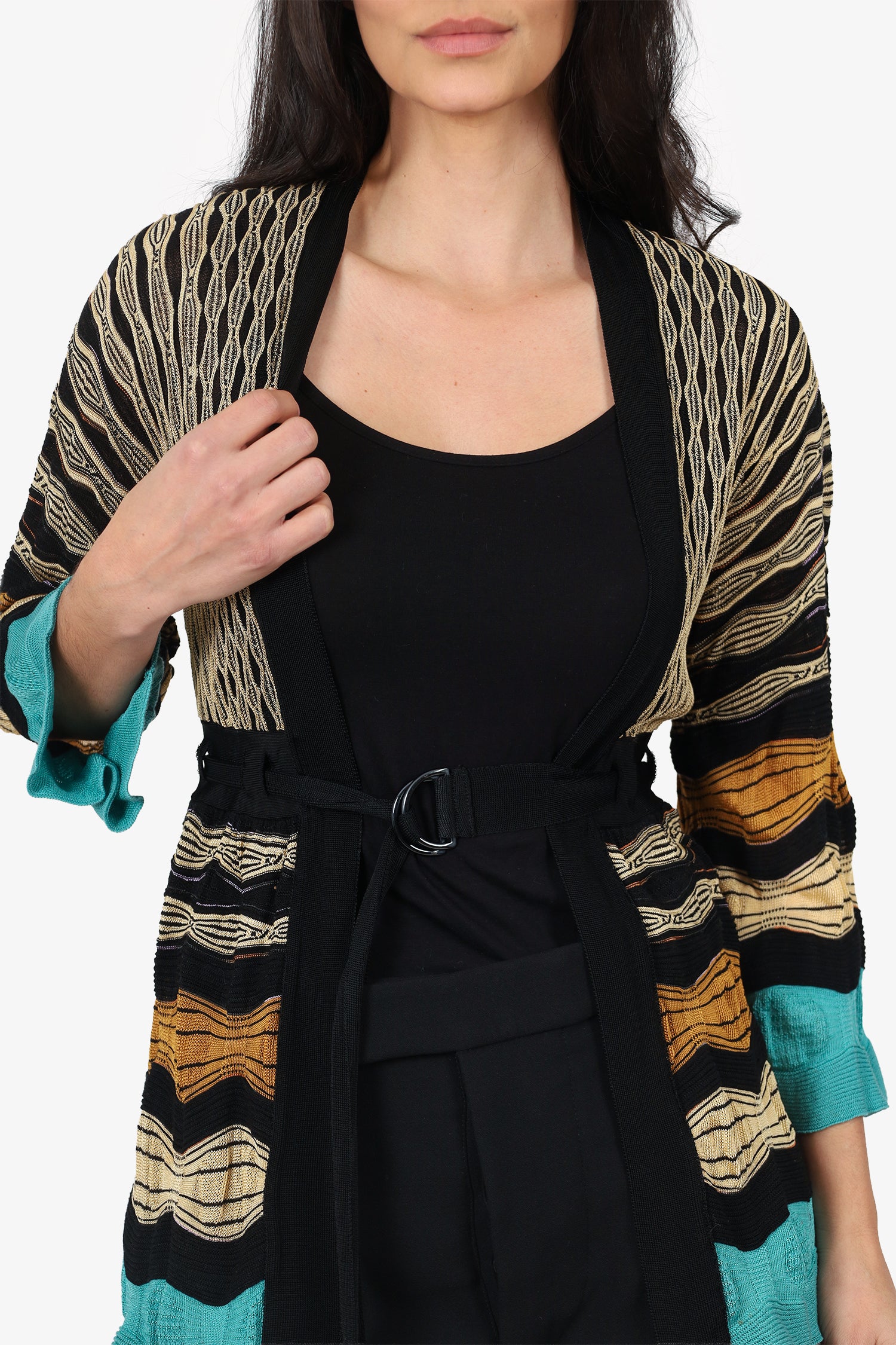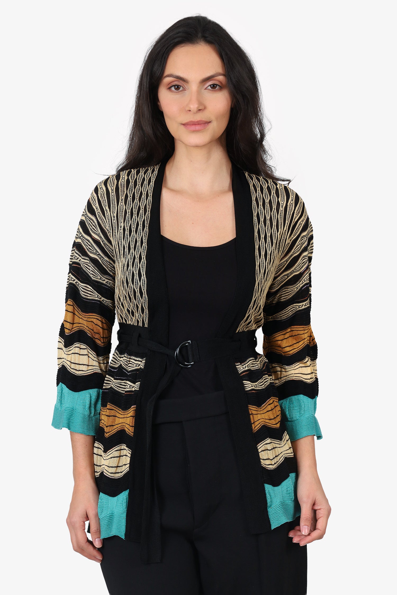 Refresh availabilityM Missoni Black/Multicolour Striped Belted Knit Cardigan. Pull-on. V-neckline. Front open with adjustable pull-through buckle closure. Gunmetal-tone hardware. Tonal stitching.
