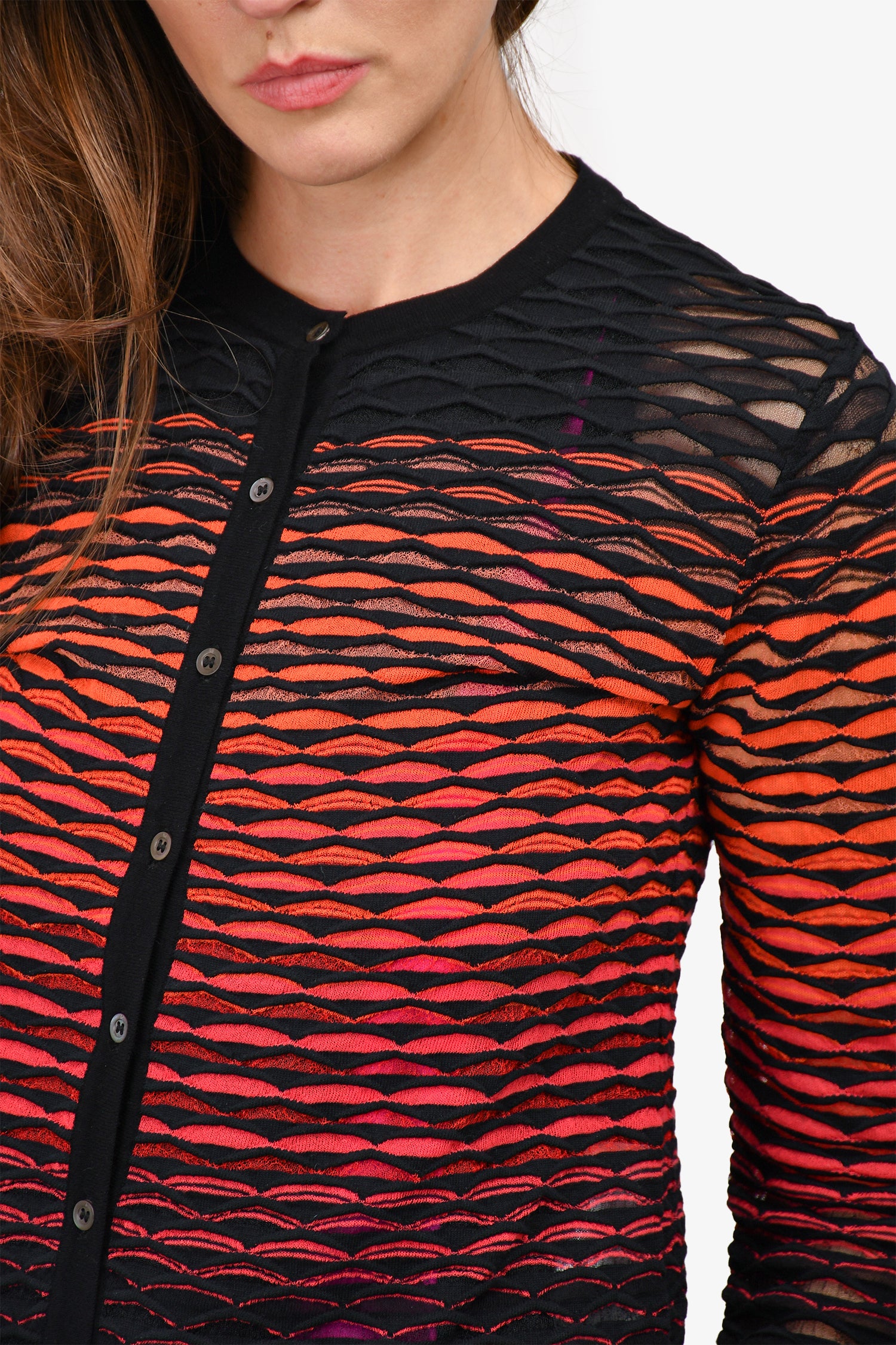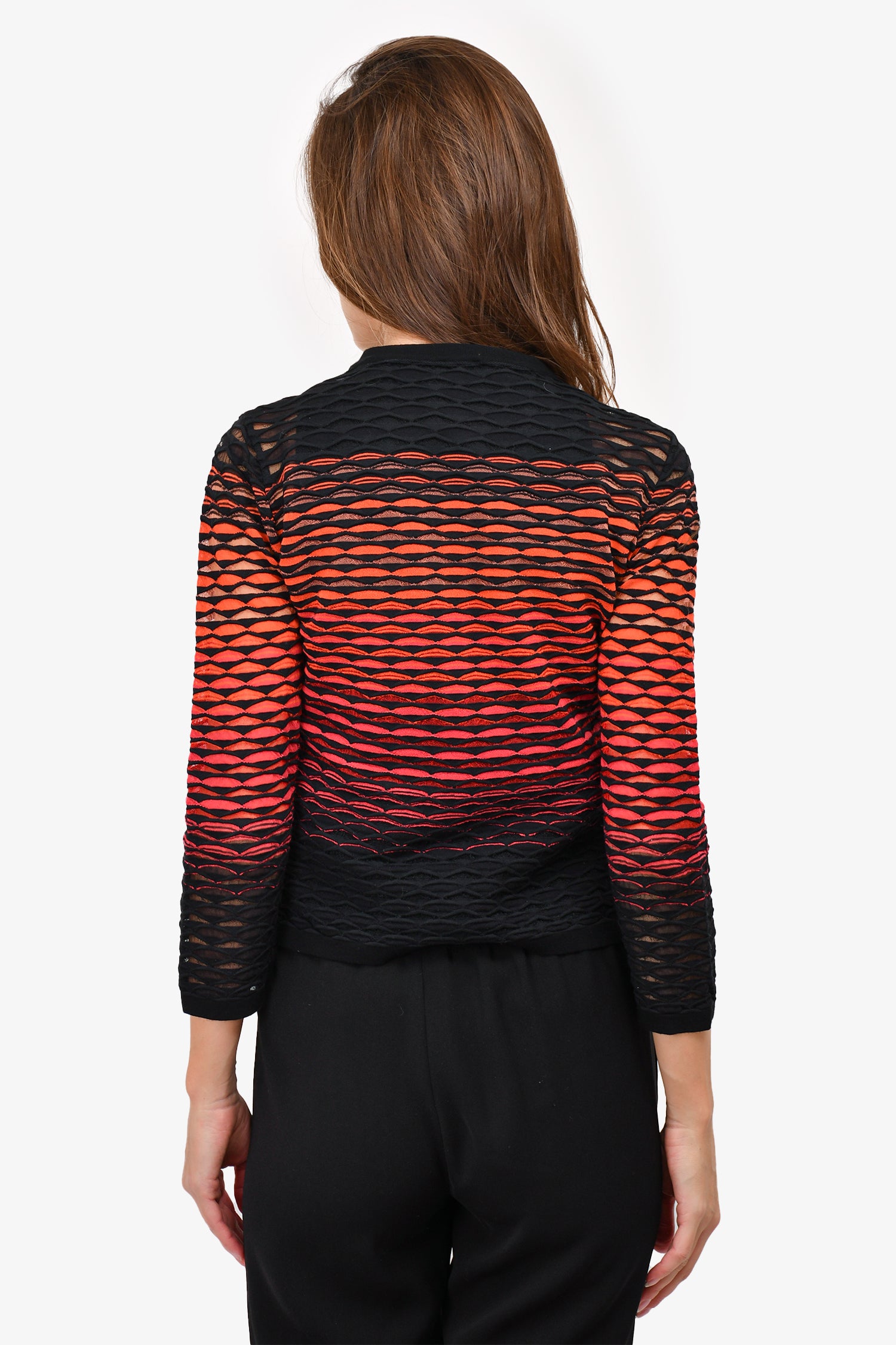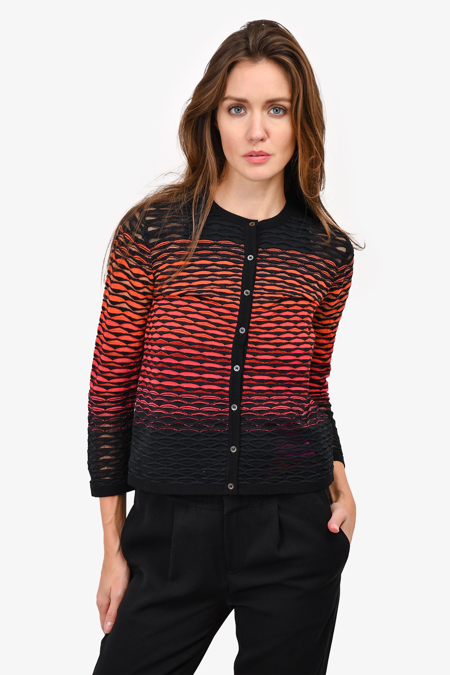 Refresh availabilityM Missoni Black/Orange Patterned Cardigan. Front button-up closure. Tonal hardware. Sheer fabric. Tonal stitching.