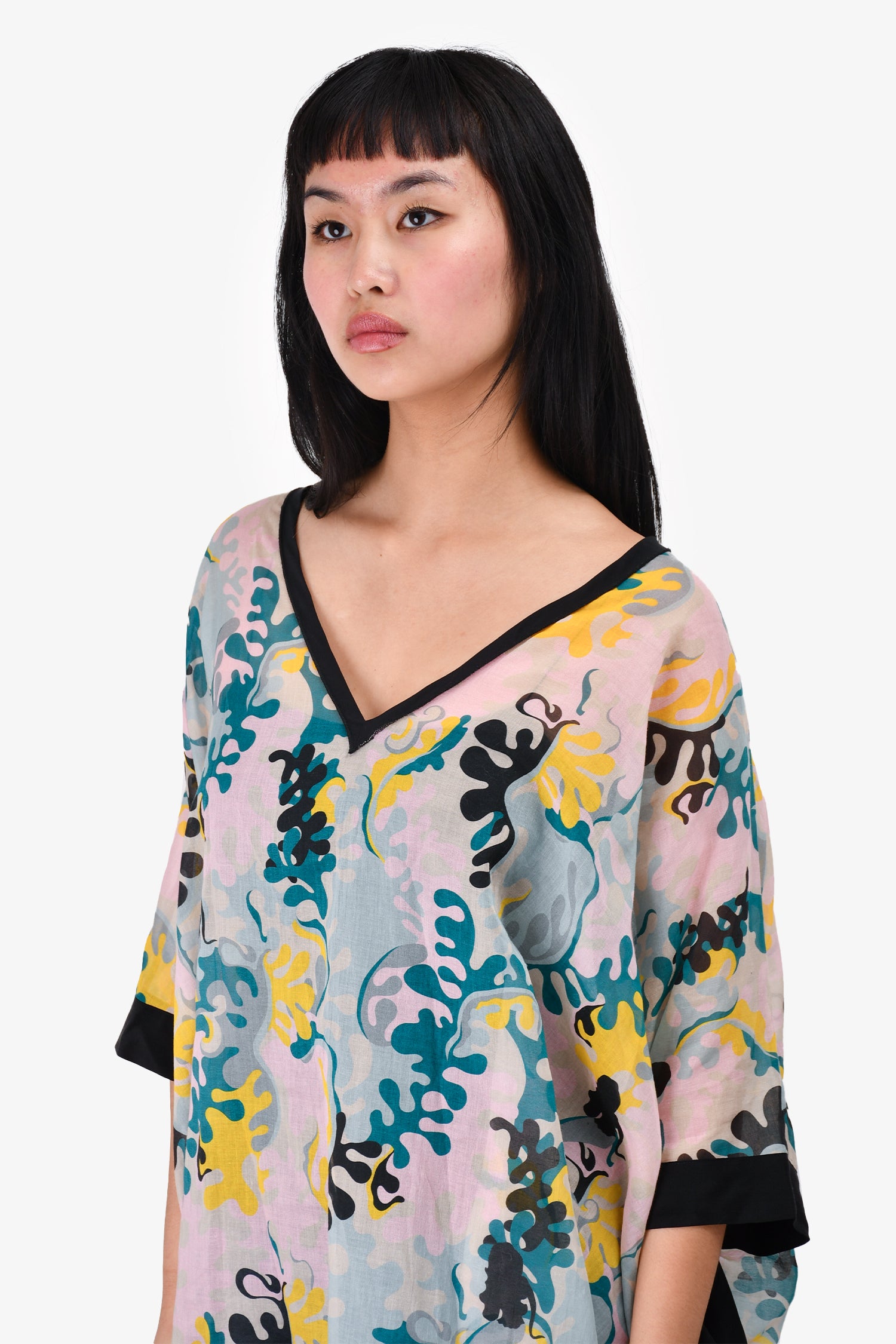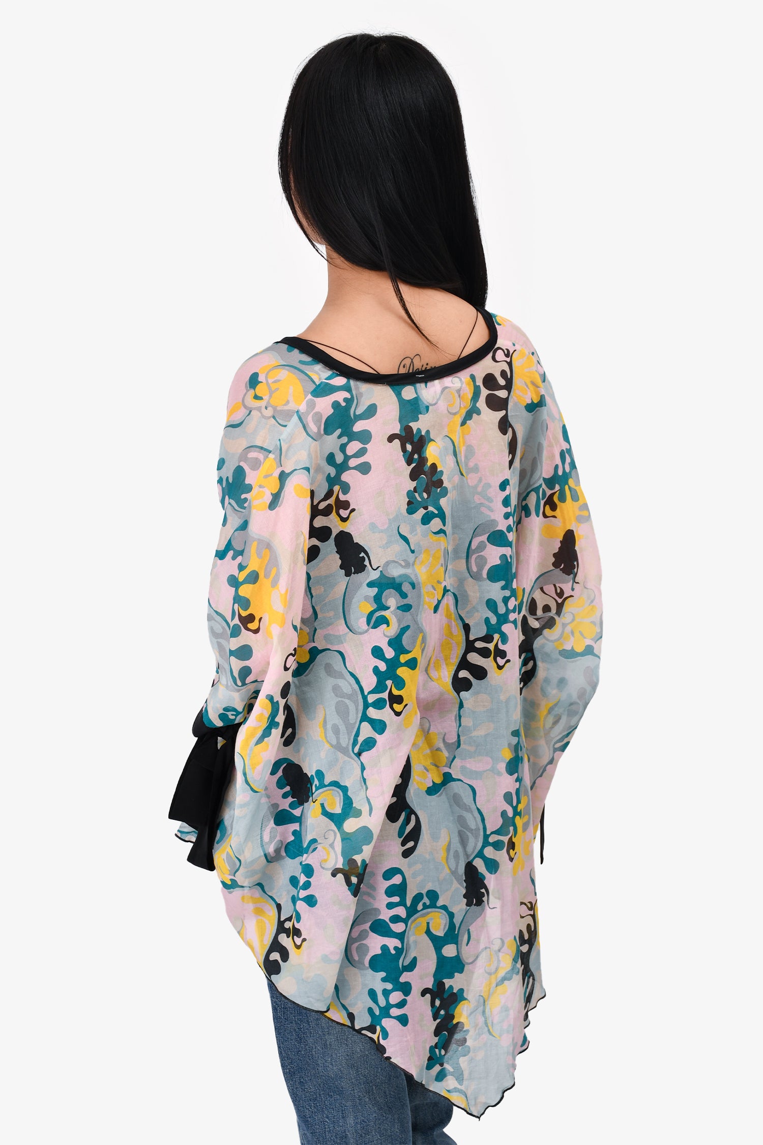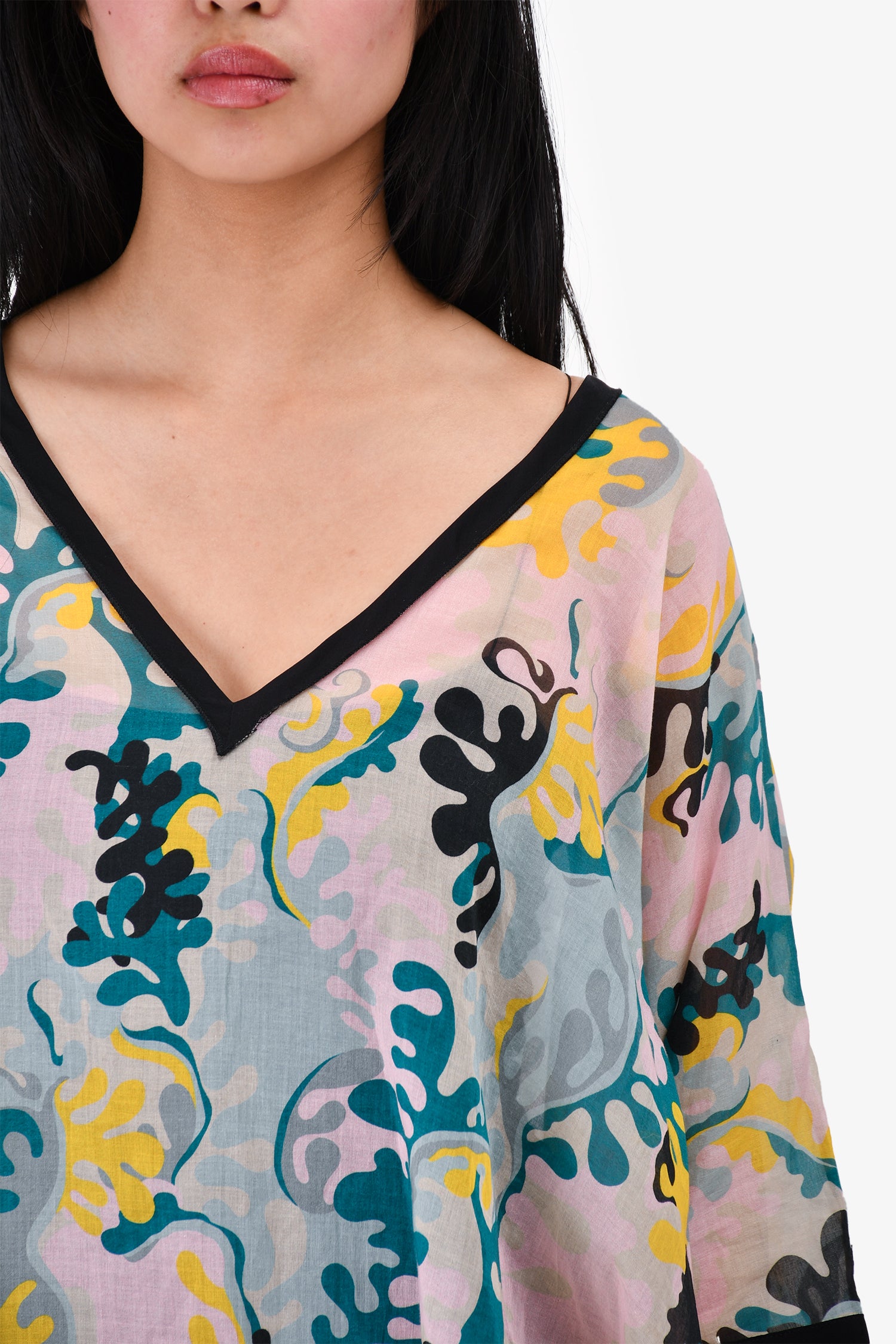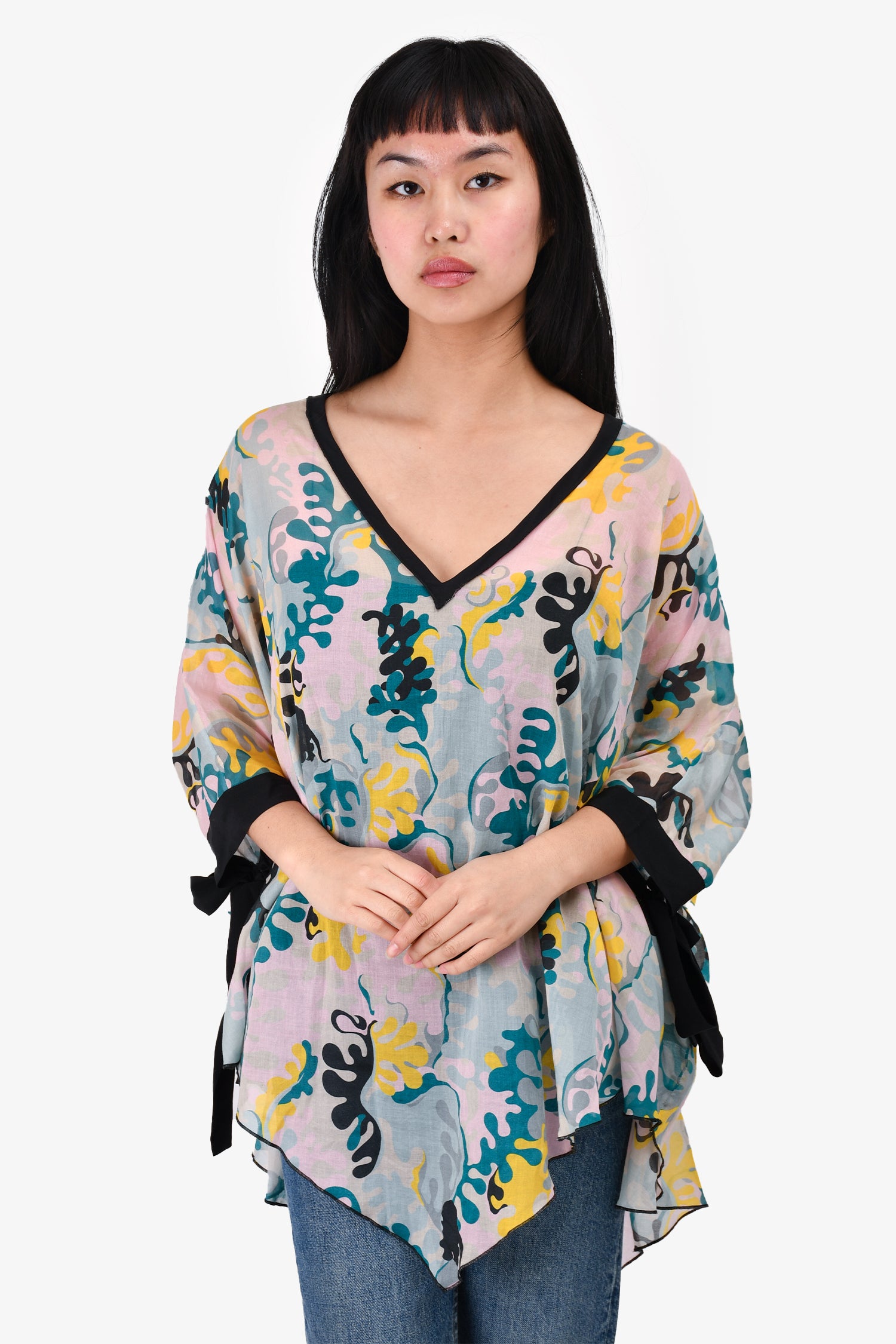 Refresh availabilityM Missoni Pink/Teal Printed Sheer Tunic. Pull-on. V-neck. Tie-up closures on the cuffs. Tonal stitching.