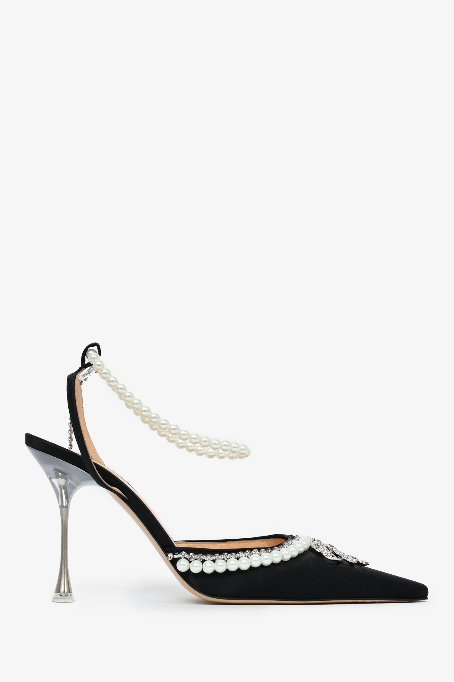 Refresh availabilityMach & Mach Black Satin Pearl Embellished Heels. Slip-on. Pointed toe. Open back.