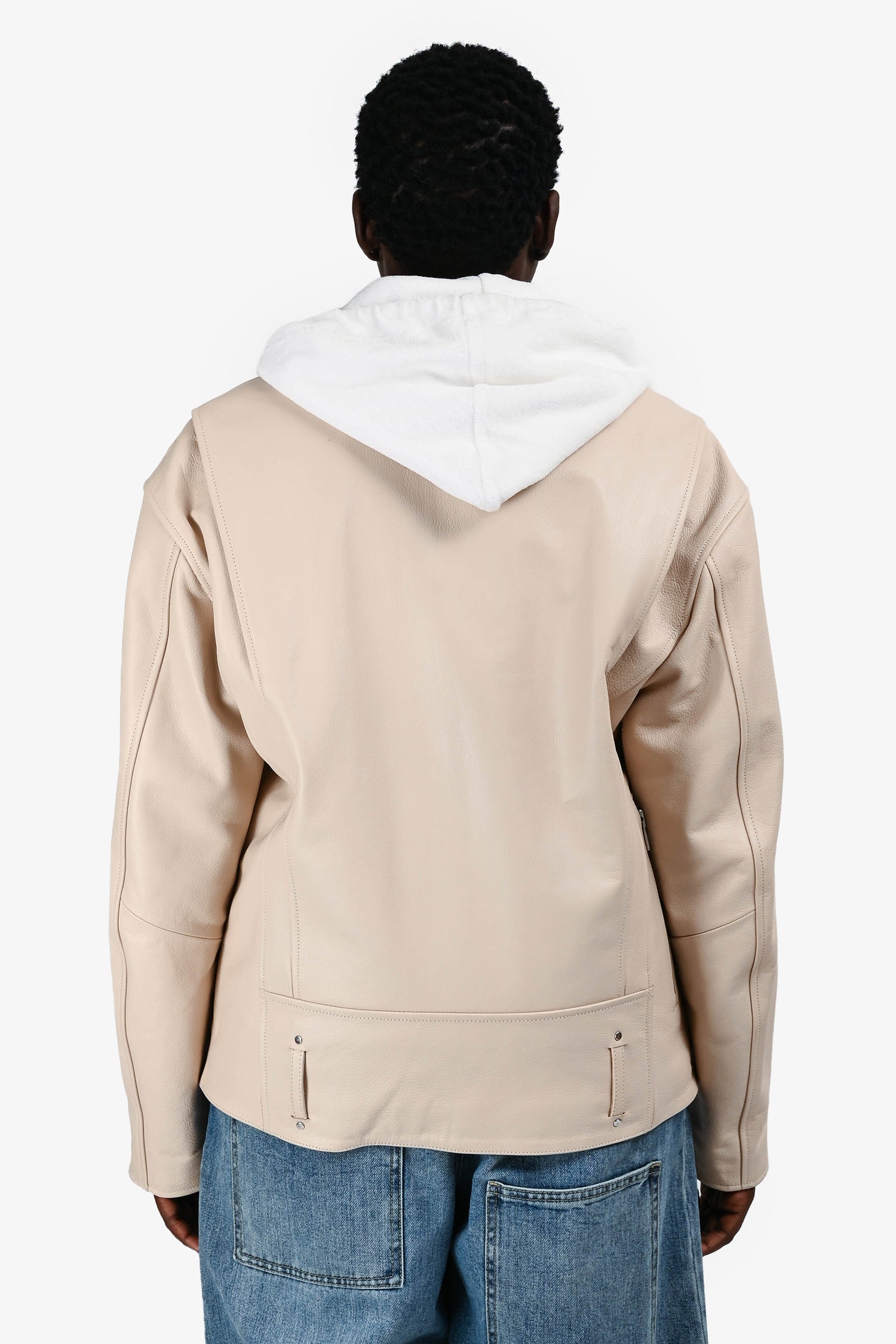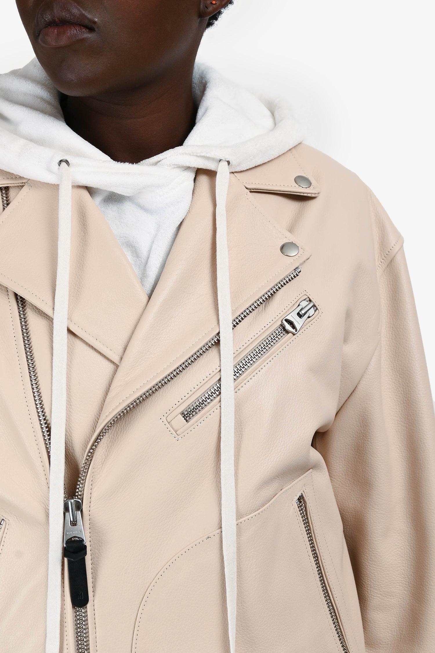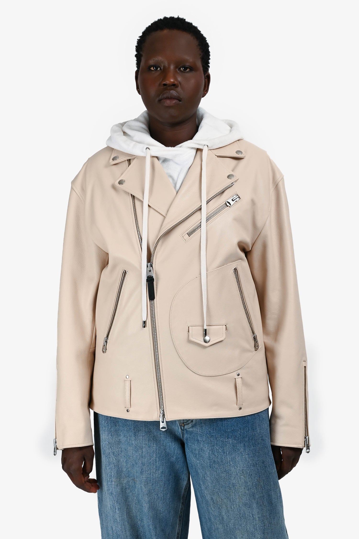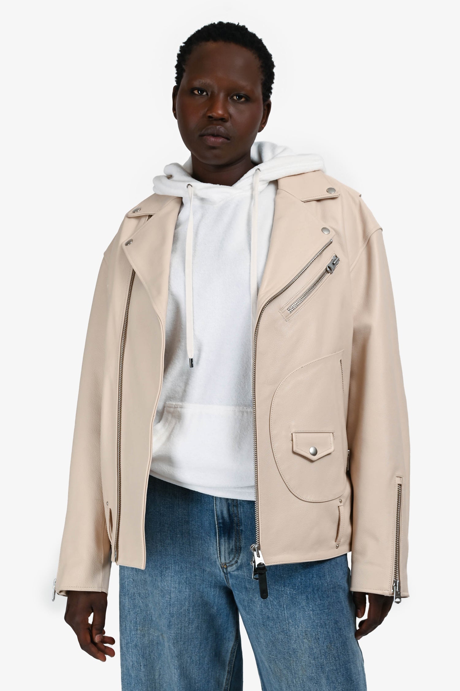 Refresh availabilityMackage Beige Leather Moto Jacket. Front two-way zip closure. Front zip pockets. Zipper detail on the cuffs. Lined.