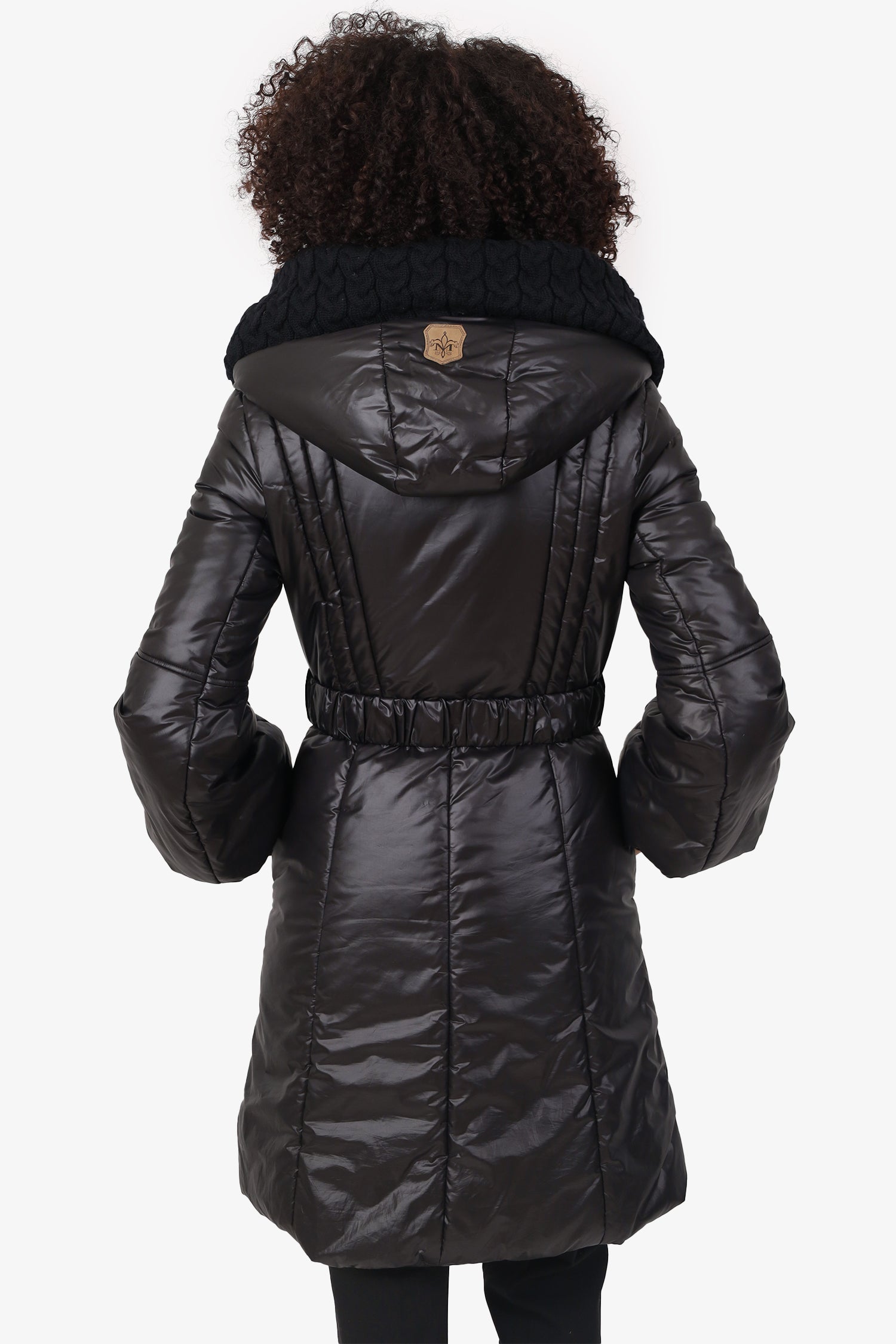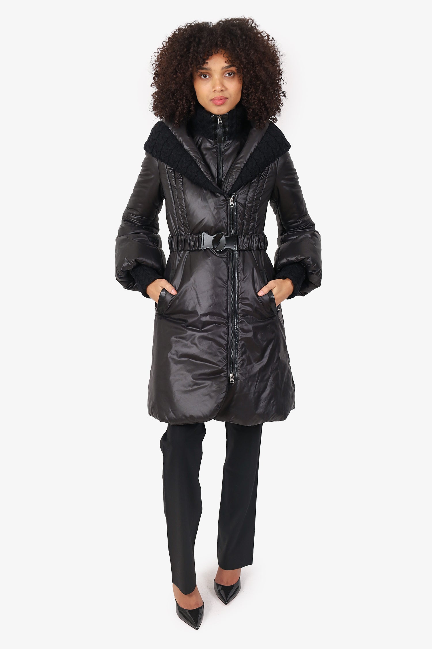 Refresh availabilityMackage Black Brigid Cable Knit Collar Down Puffer Coat. Pull-on. Interior and exterior zip up closures. Front button-up and belt closure. 2 exterior side zip pockets. Palladium-tone hardware. Tonal stitching.