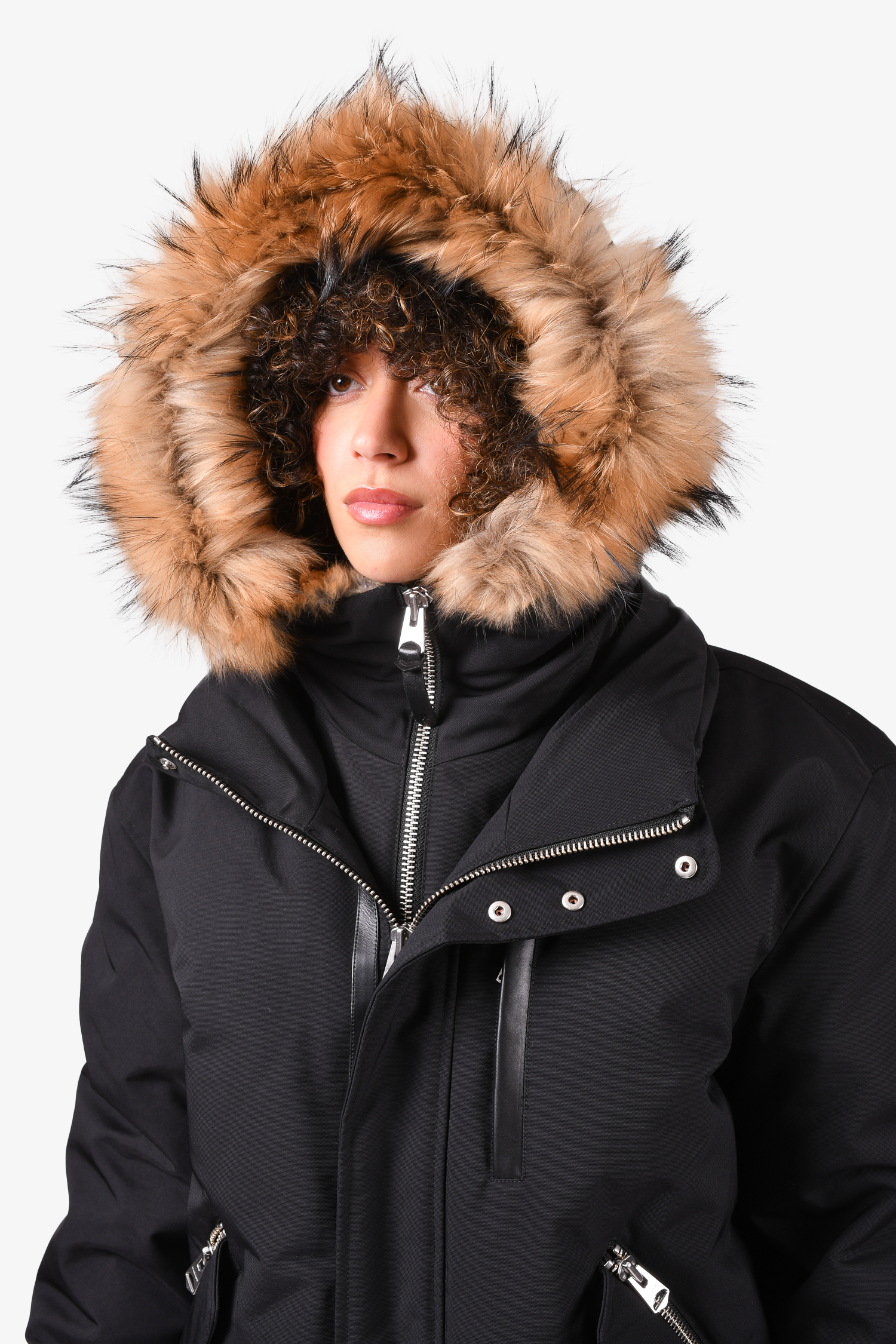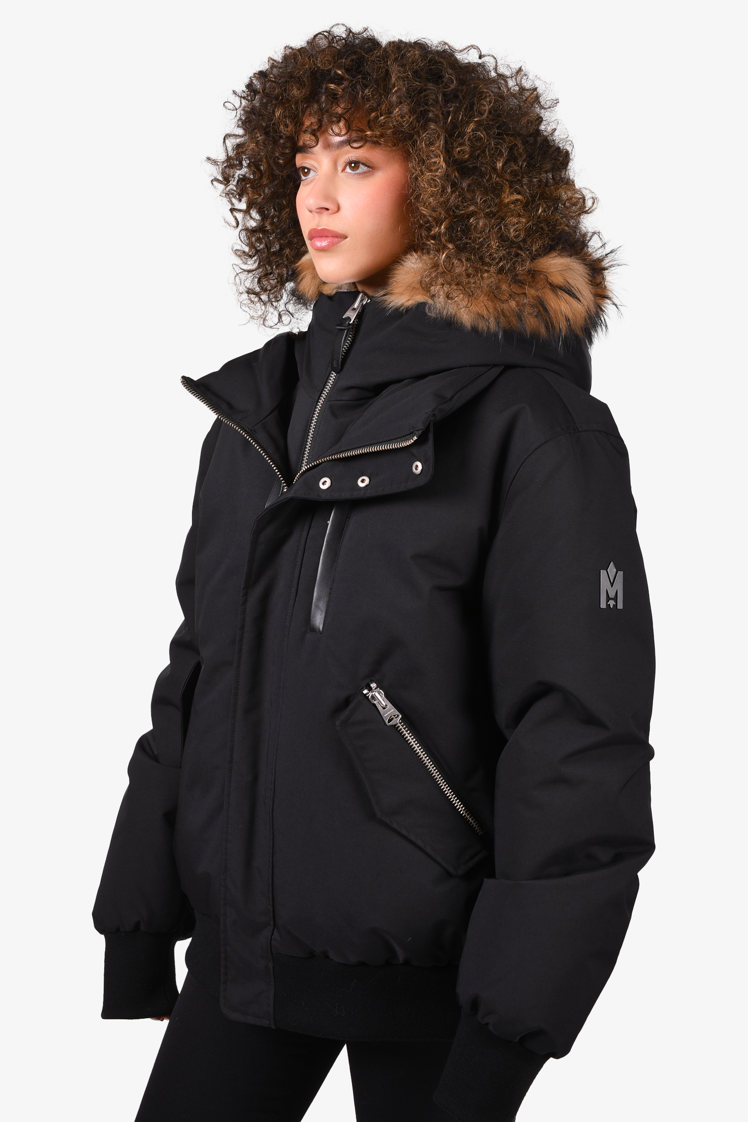 Refresh availabilityMackage Black 'Dixon 2 in 1' Down Bomber Jacket with Fur Hood. Front two-way zip closure. Front zip pockets. Removable zip fur hood trim. Brand logo on the left sleeve and hood. Ribbed cuffs and hem. Tonal stitching.