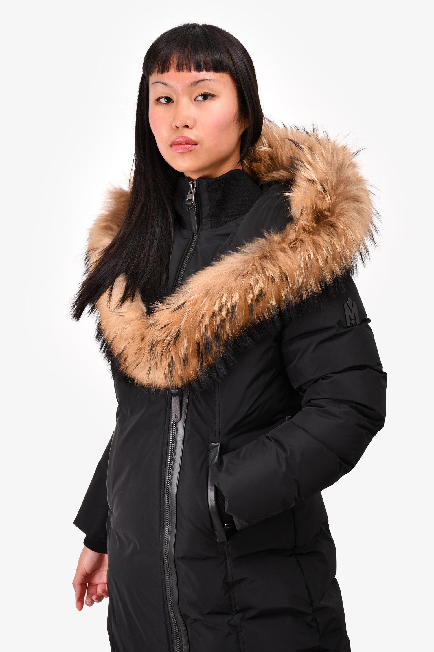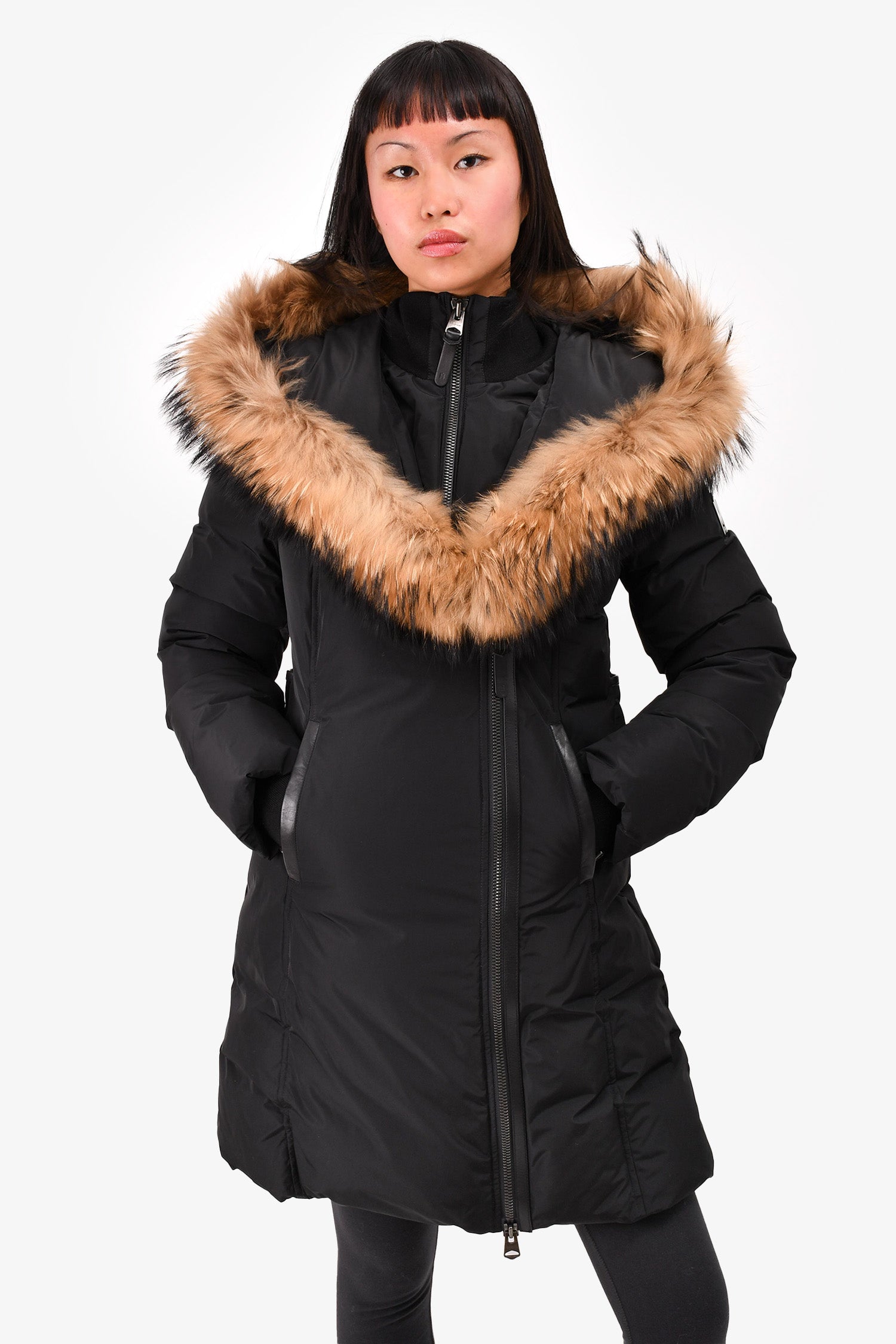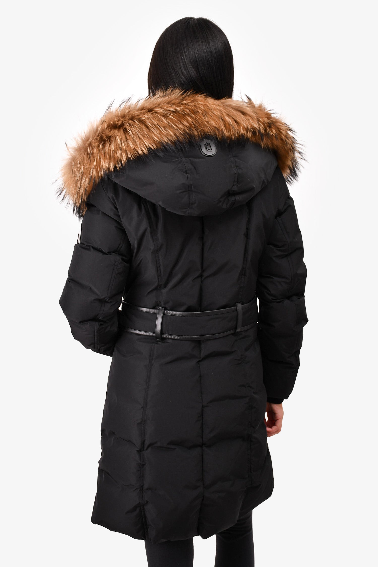Mackage Black Down Mid Length Coat With Fur Trim + Belt Size M