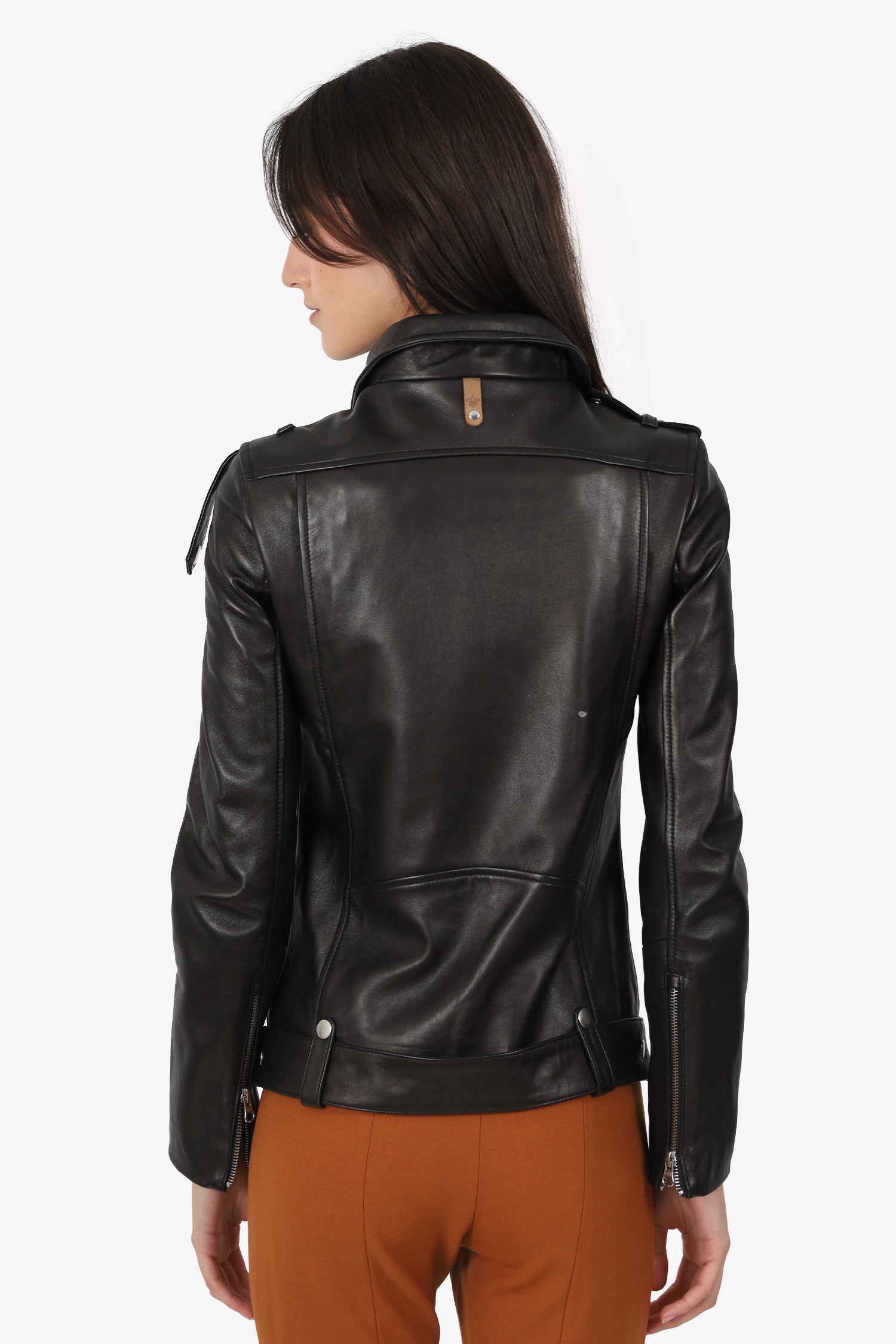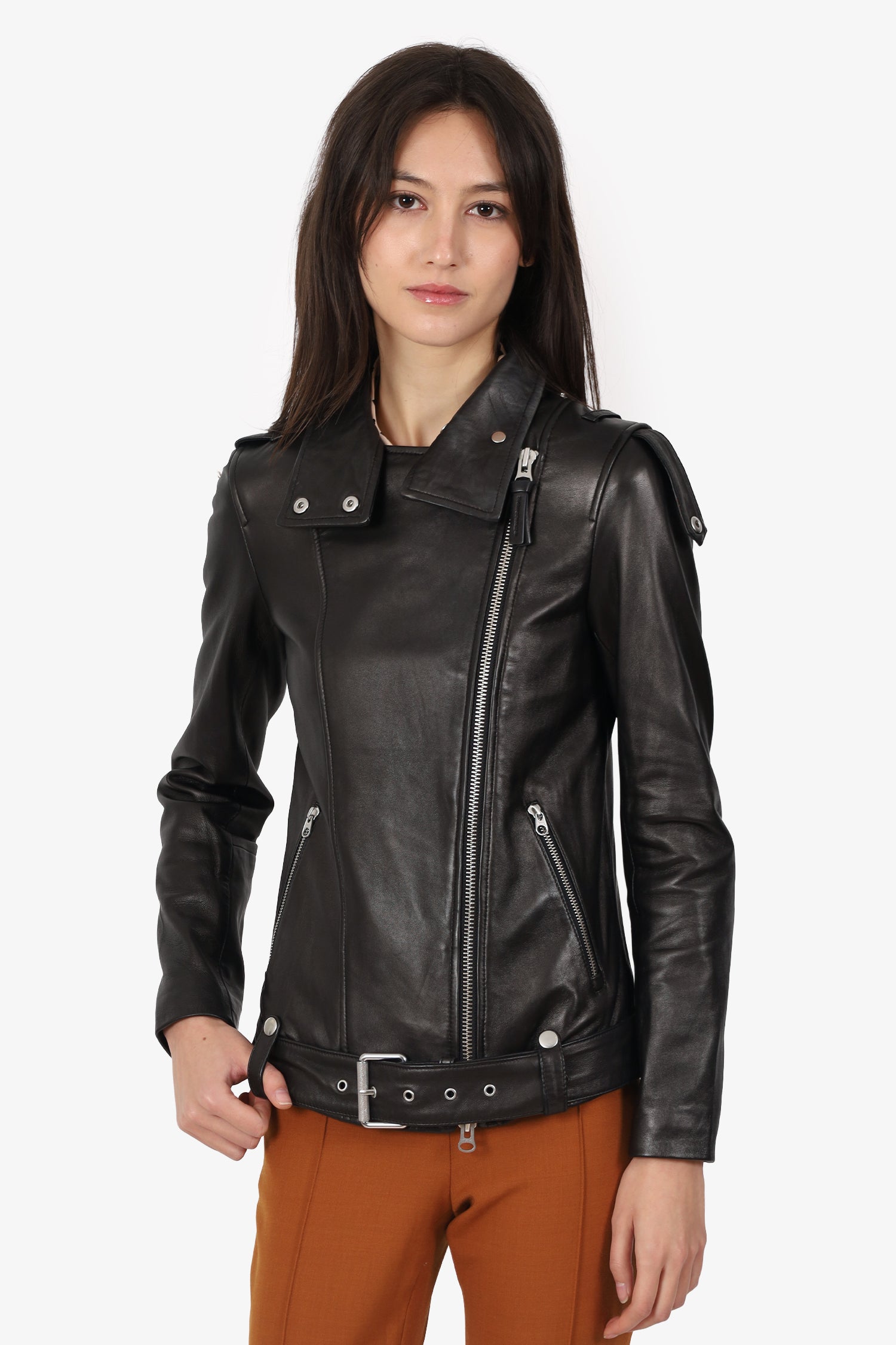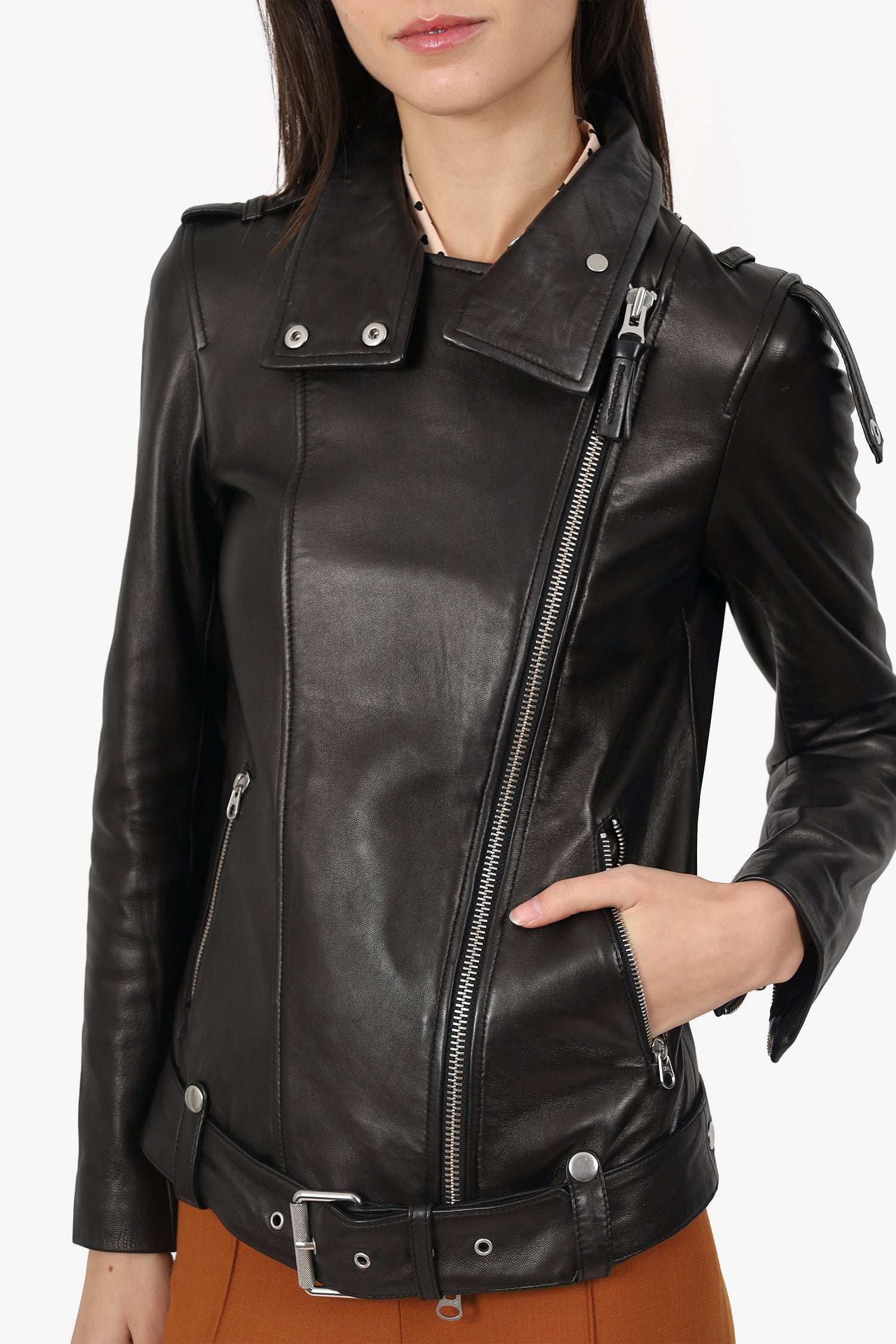 Refresh availabilityMackage Black Leather Biker Jacket. Pull-on. Collared neckline. Front zip with snap-button-up closure. Shoulder straps with snap-button-up closure. Sleeve cuffs with zip-up closure. Waist belt with adjustable pull-through buckle closure. 2 exterior front zip pockets. Lined interior. Silver-tone hardware. Tonal stitching.