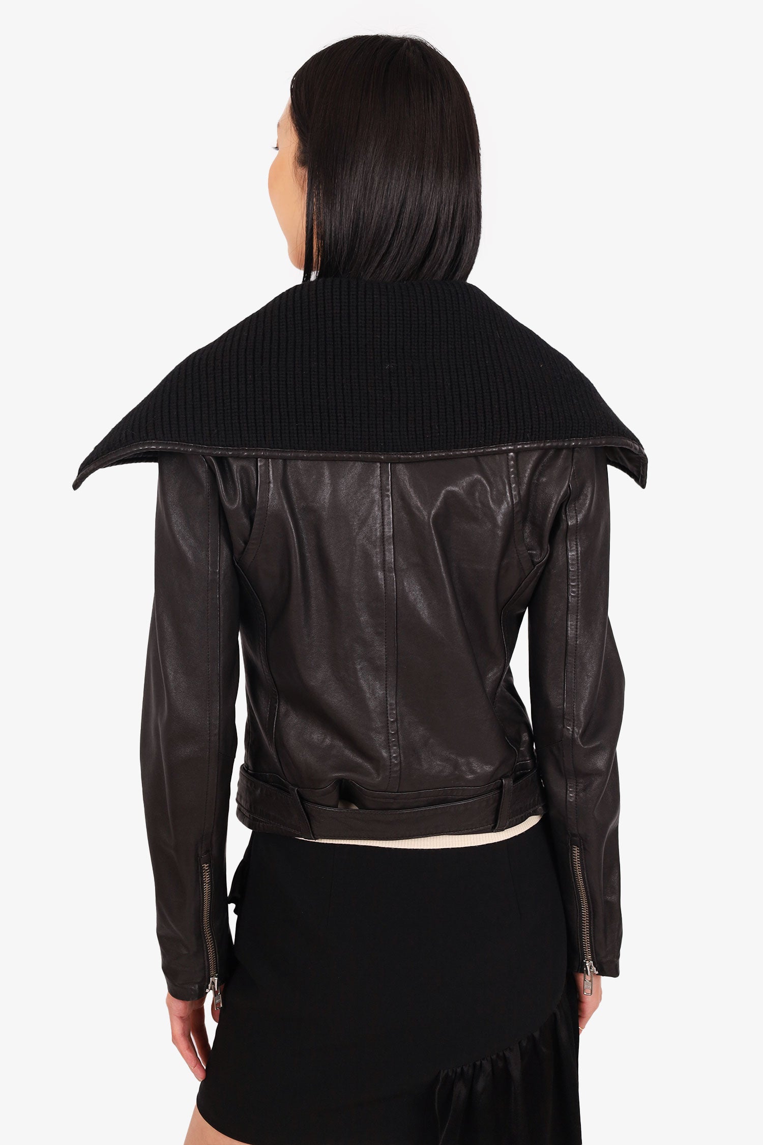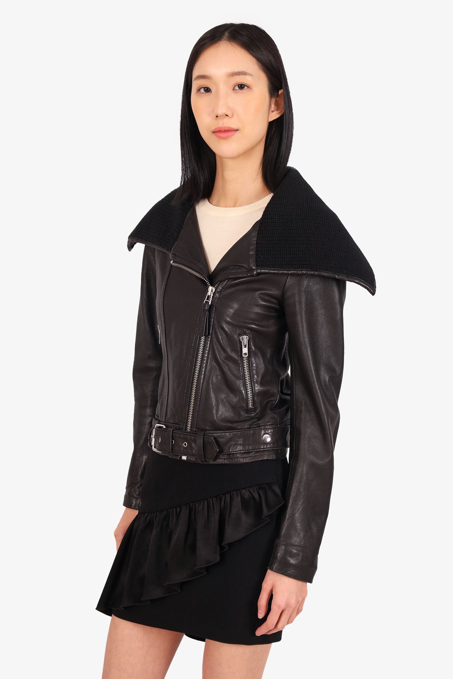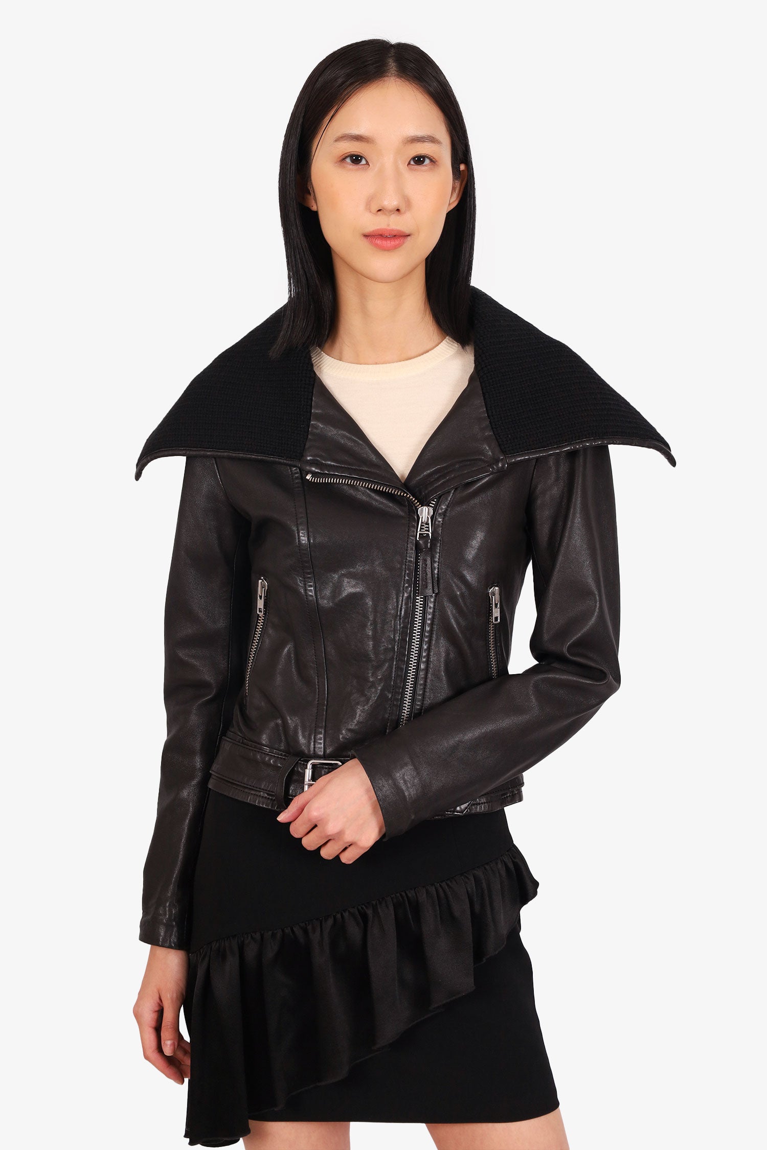 Refresh availabilityMackage Black Leather Biker Jacket with Knit Collar. Collared neckline. Front zip closure. 2 front zip pockets. Shoulder snap buttons for modifiable collar neckline wear. Adjustable and removable waist belt. Locker loop at back collar. Silver-tone hardware. Lined. Tonal stitching.
