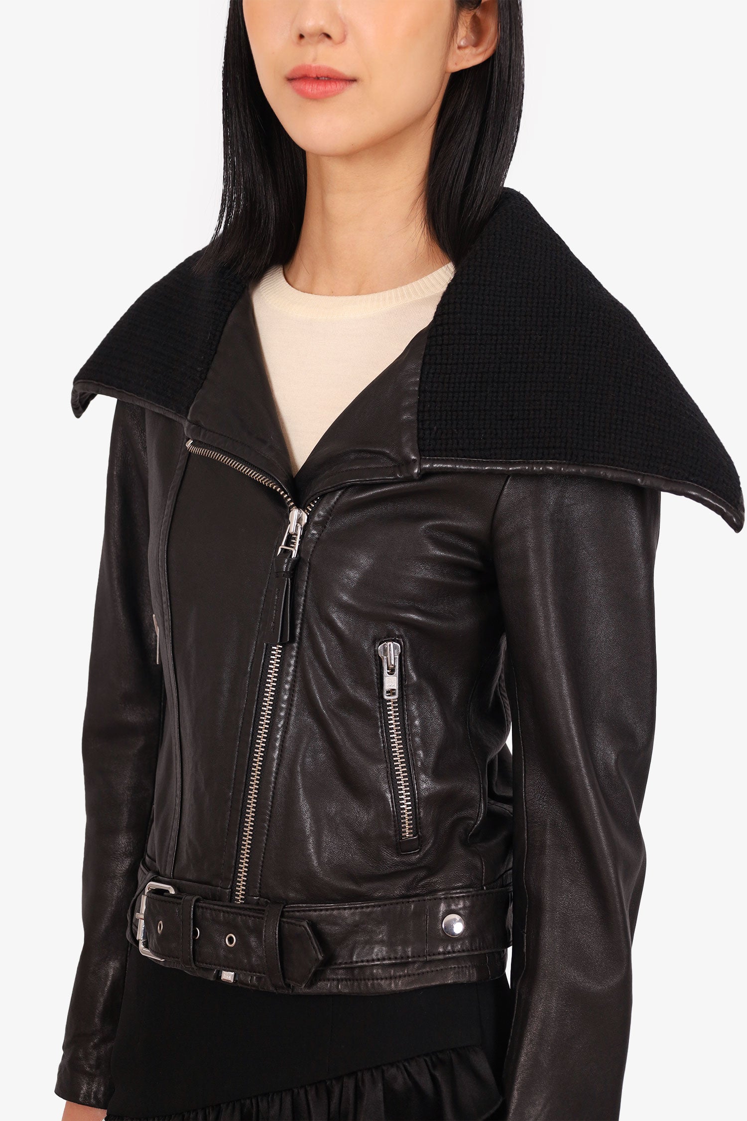 Mackage Black Leather Biker Jacket with Knit Collar Size S