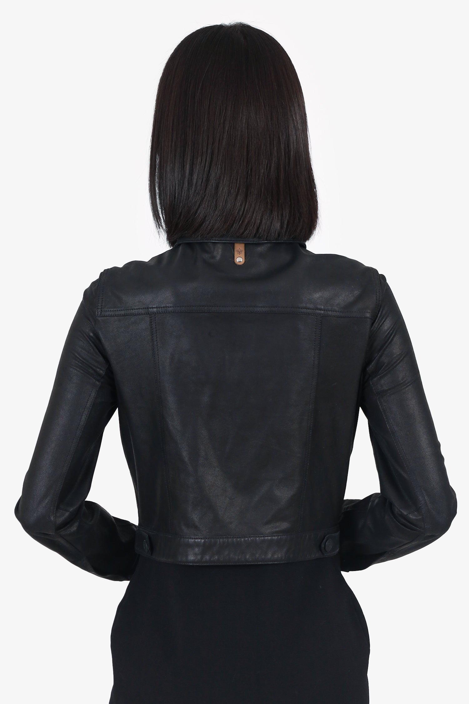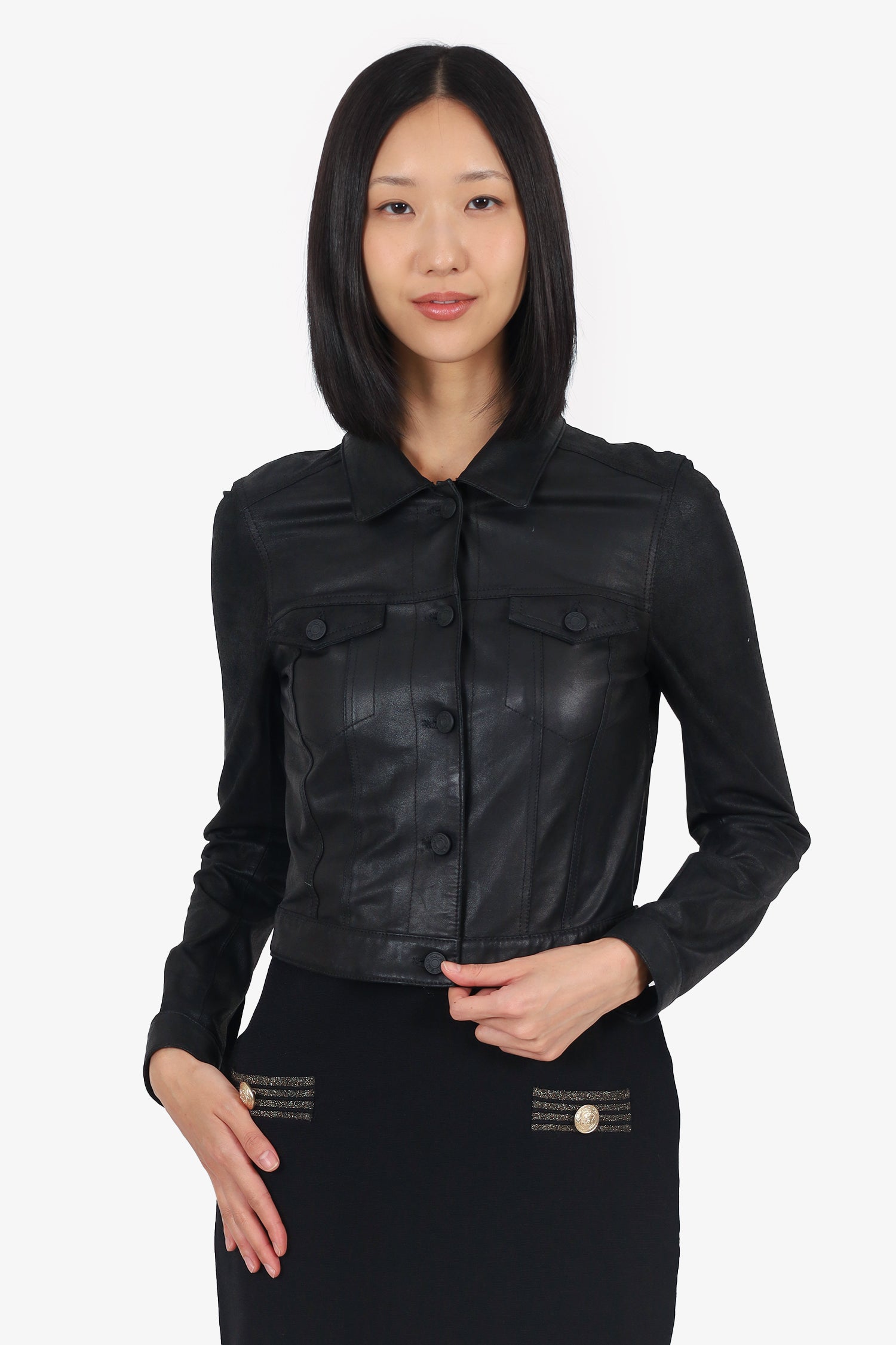 Refresh availabilityMackage Black Leather Jacket. Pull-on. Collared-neckline. Front button-up closure. Sleeve cuffs with button-up closure. 2 front exterior flap pockets with button-up closure. Tonal hardware. Tonal stitching.