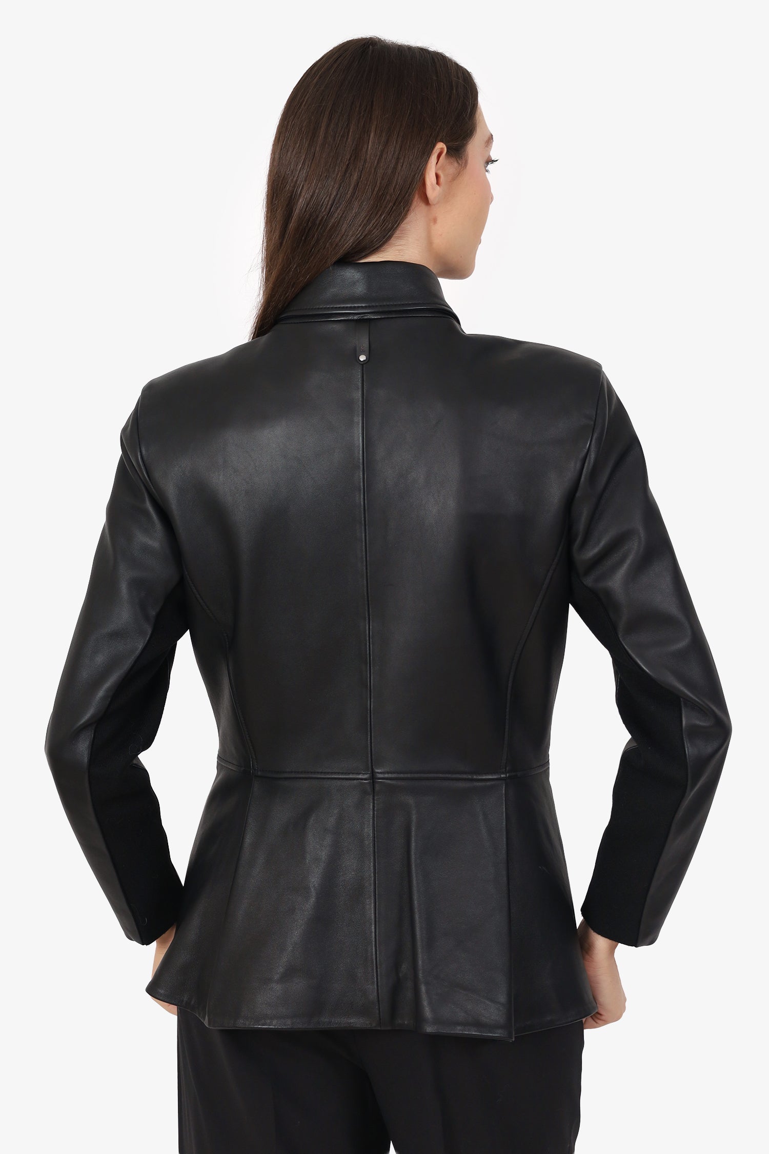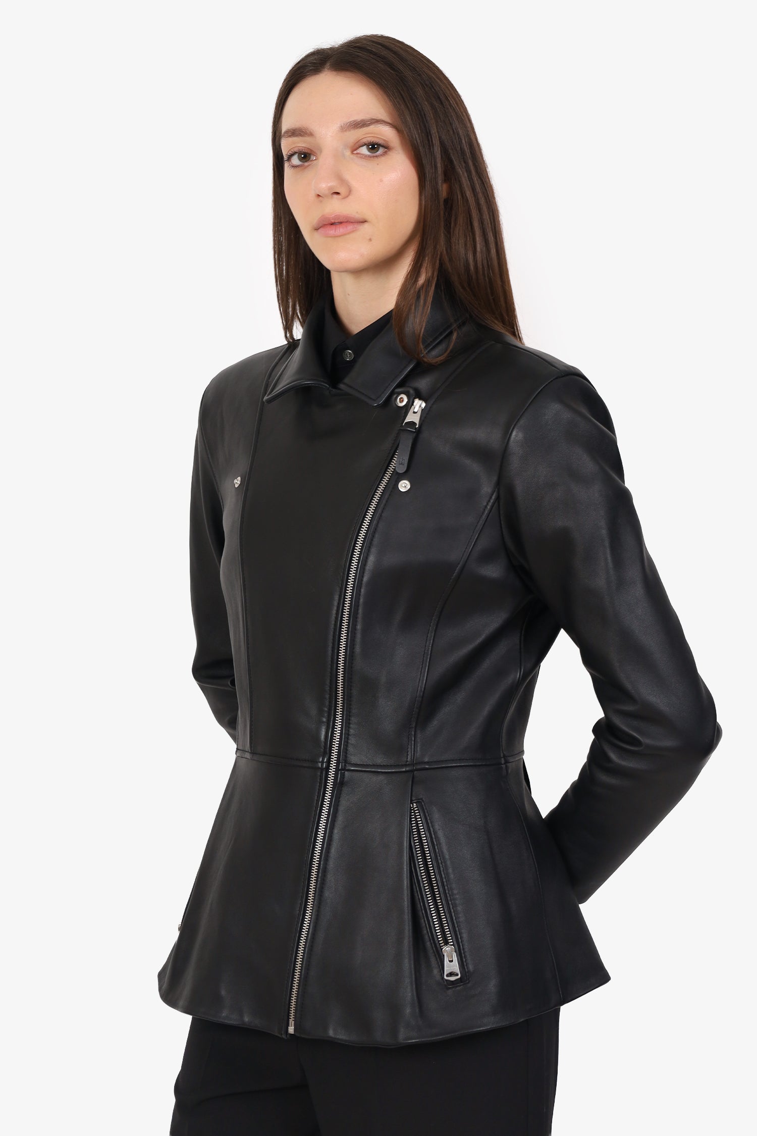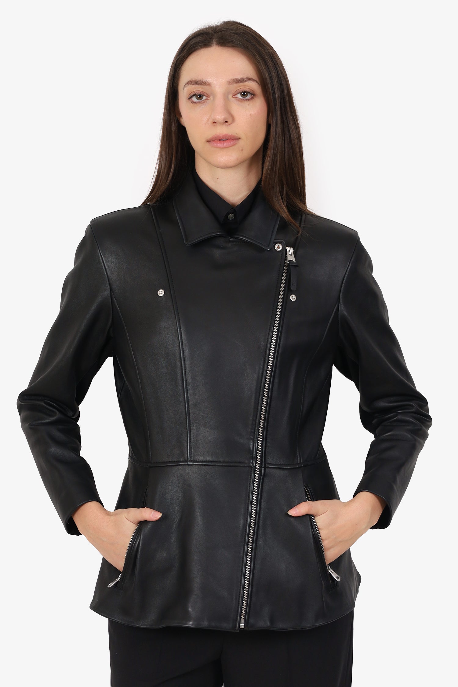 Refresh availabilityMackage Black Leather Peplum Biker Jacket. Pull-on. Collared neckline. Front zip with snap-button-up closure. Padding to shoulders. 2 exterior front zip pockets. Lined interior. Silver-tone hardware. Tonal stitching.