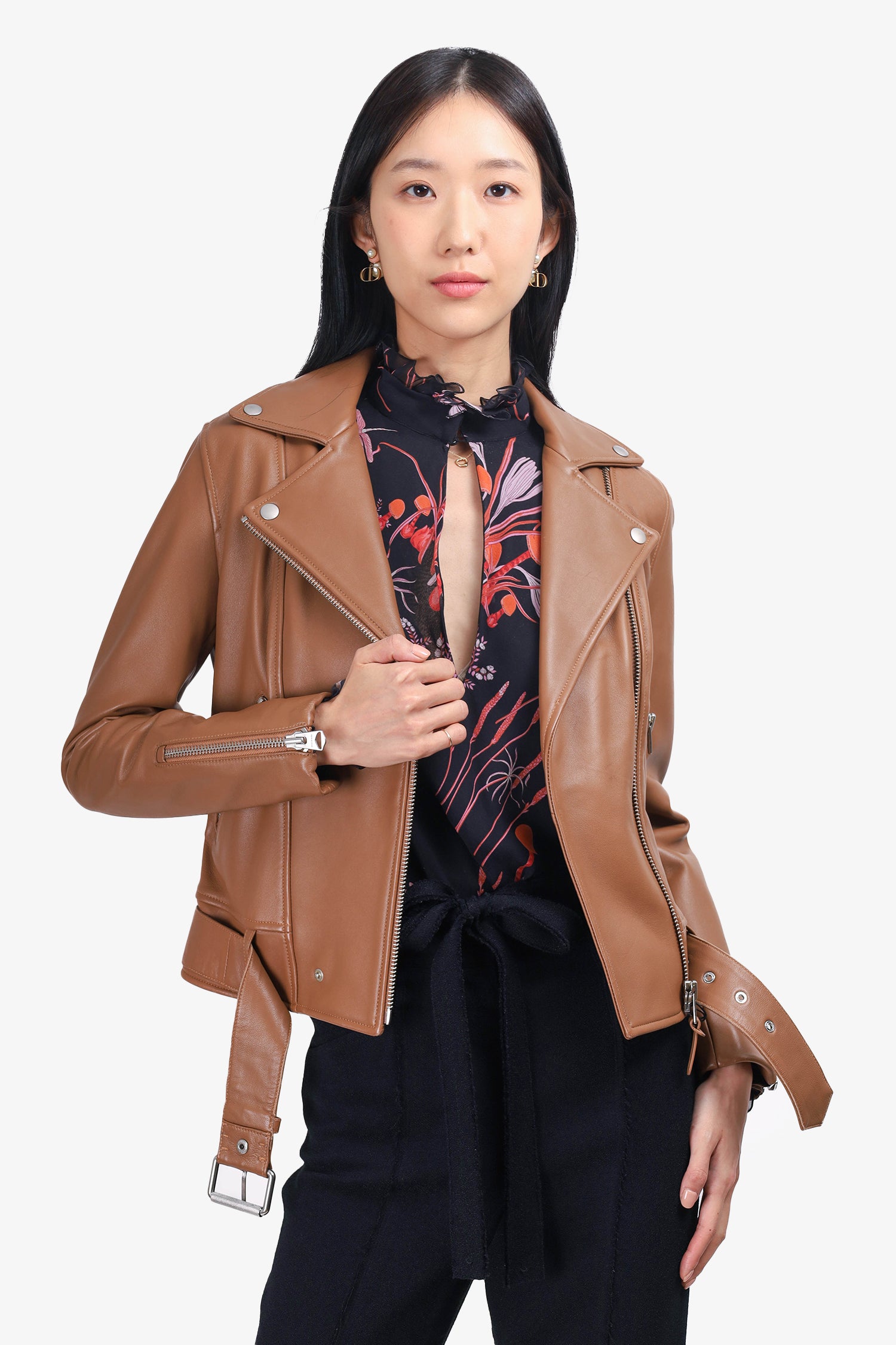 Refresh availabilityMackage Brown Leather Biker Jacket. Collared V-neckline. Front zip closure. 2 zip-up pockets on front. Snap button detail on front. Zip detailing on sleeve cuffs. Removable belt with adjustable pull-through closure. Silver-tone hardware. Lined. Tonal stitching.