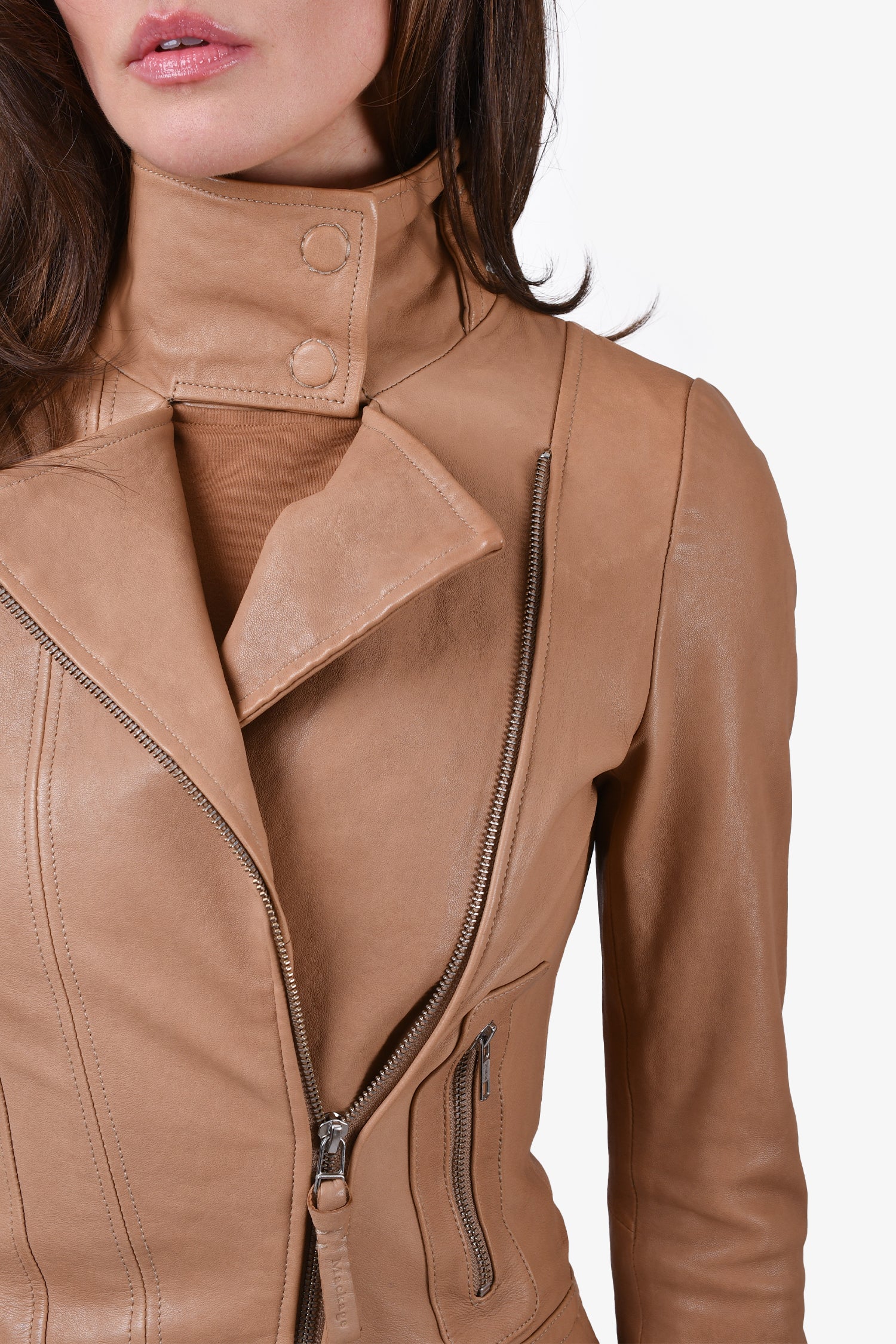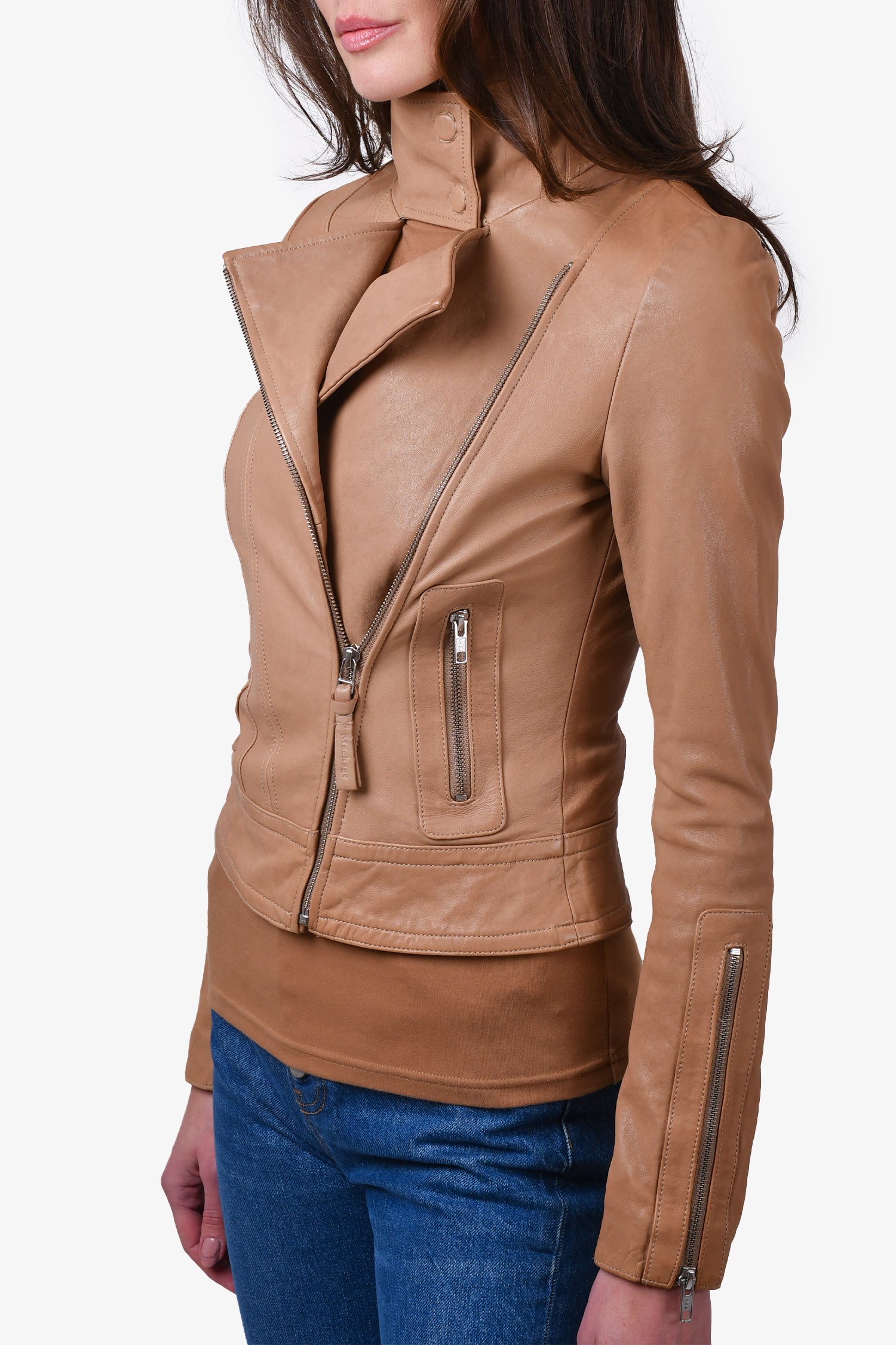 Mackage For Aritzia Brown Leather 'Kenya' Biker Jacket. Front zip closure. Front zip pockets. Lined. Tonal stitching.
